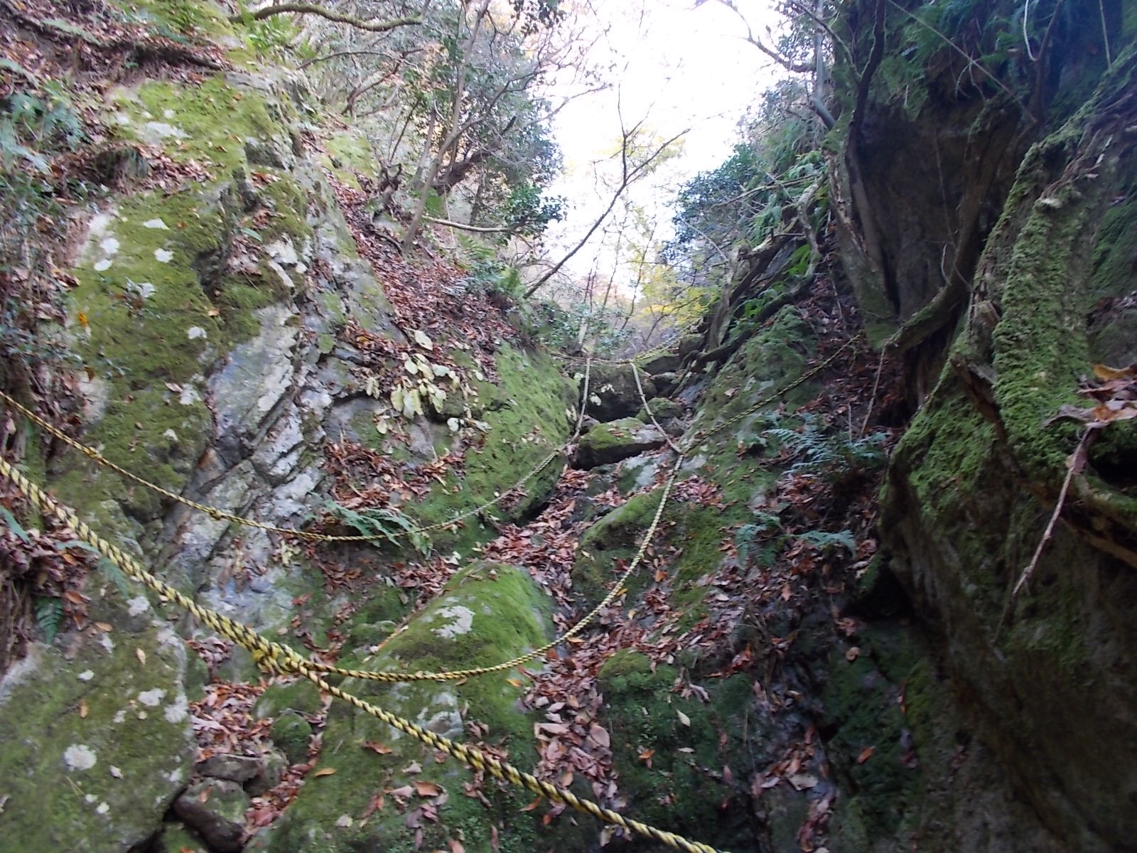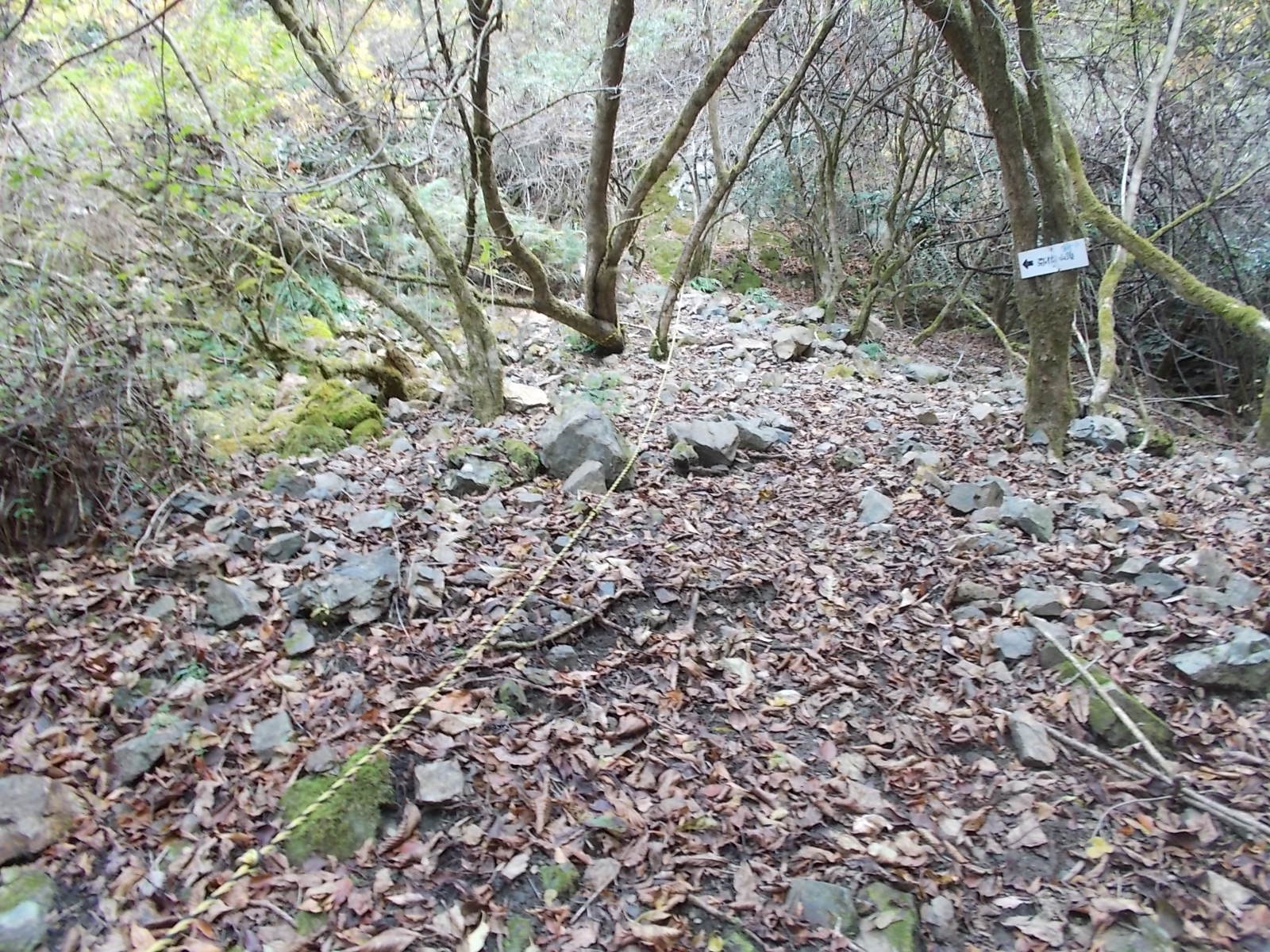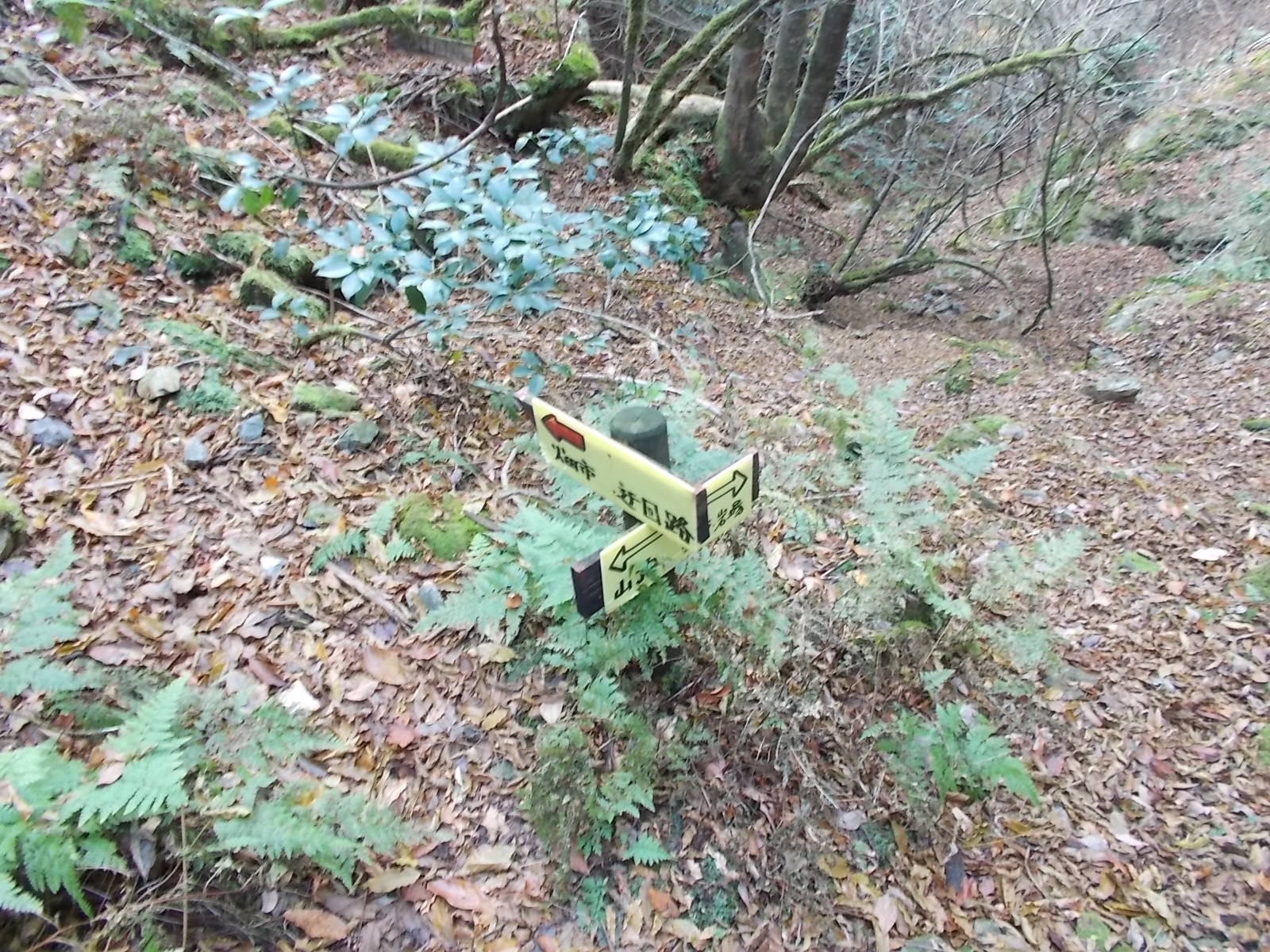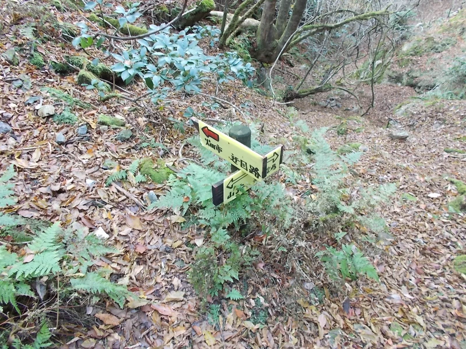 駐車場所 → 登山口 → (林道) → 分岐 → 尾根分岐 → (沢筋) → 岩場・迂回分岐 → 洞窟 → 山頂 → 登山口 → 駐車場所