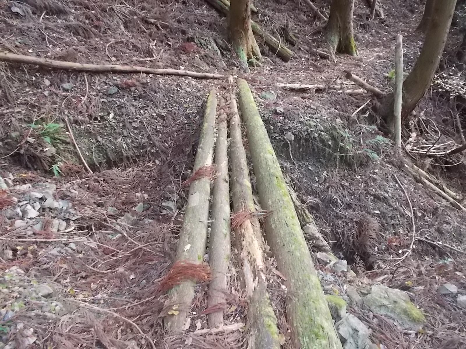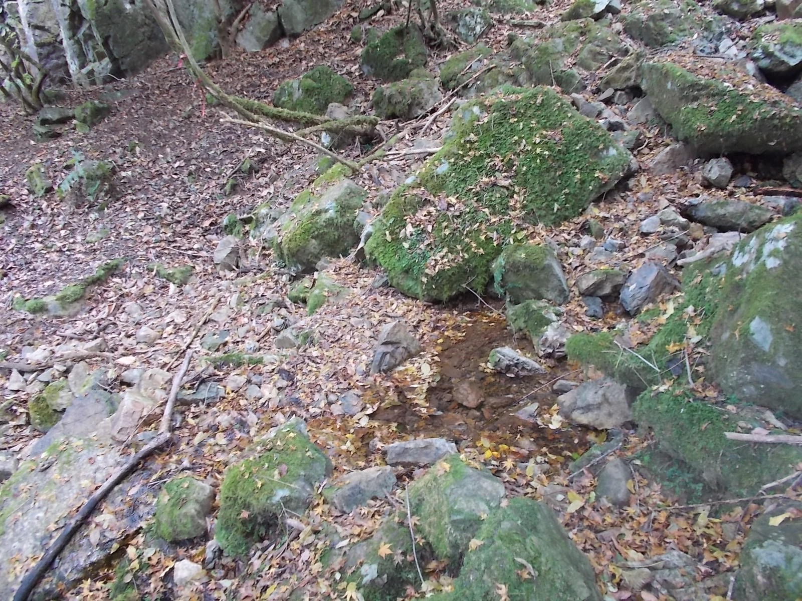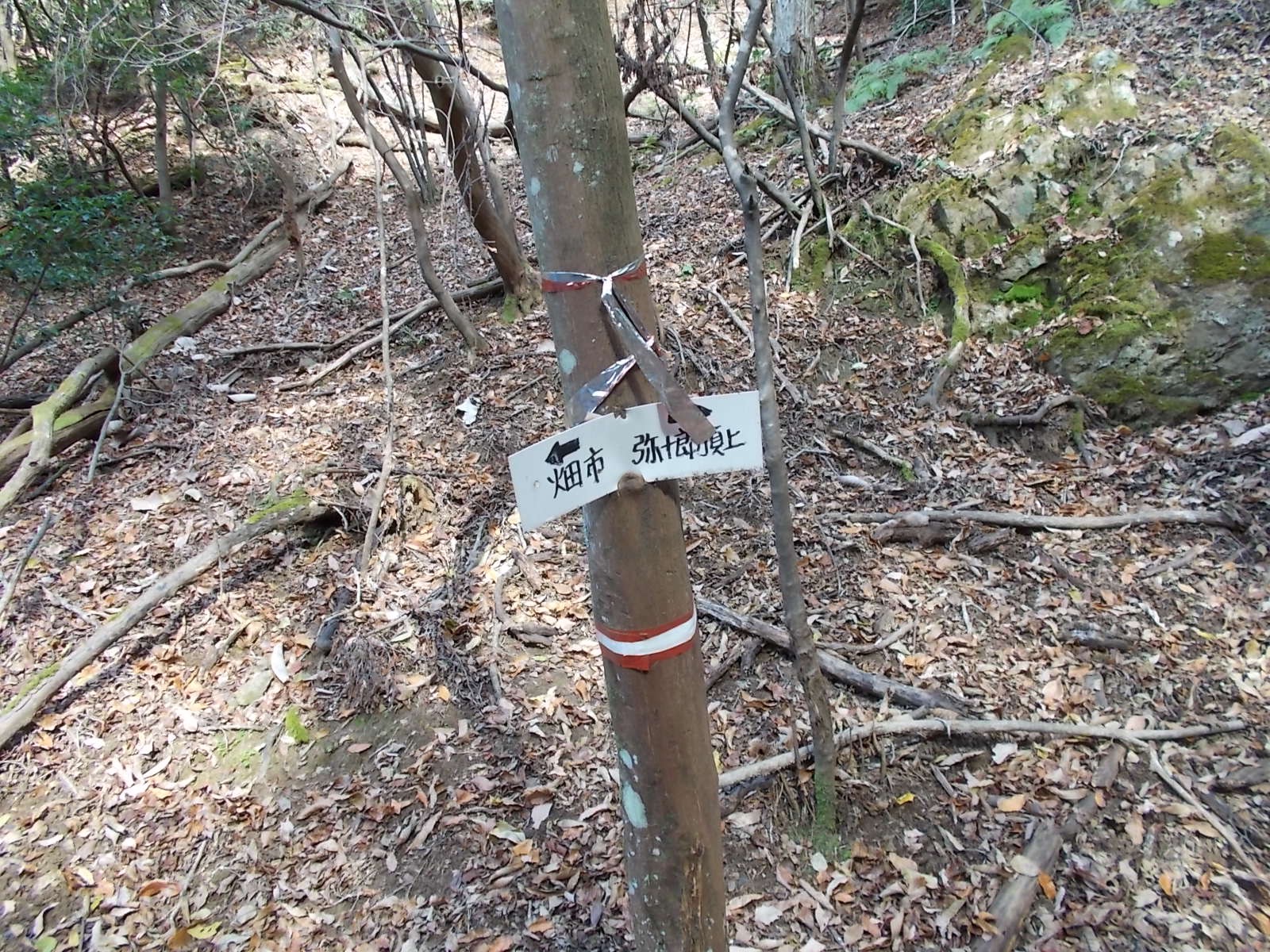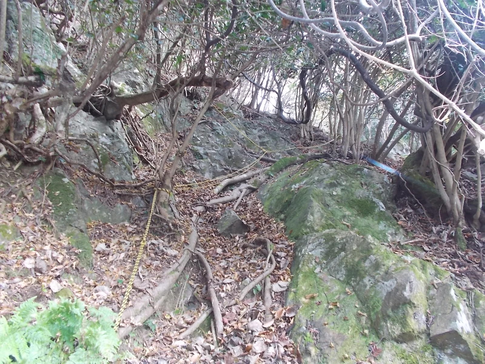 駐車場所 → 登山口 → (林道) → 分岐 → 尾根分岐 → (沢筋) → 岩場・迂回分岐 → 洞窟 → 山頂 → 登山口 → 駐車場所
