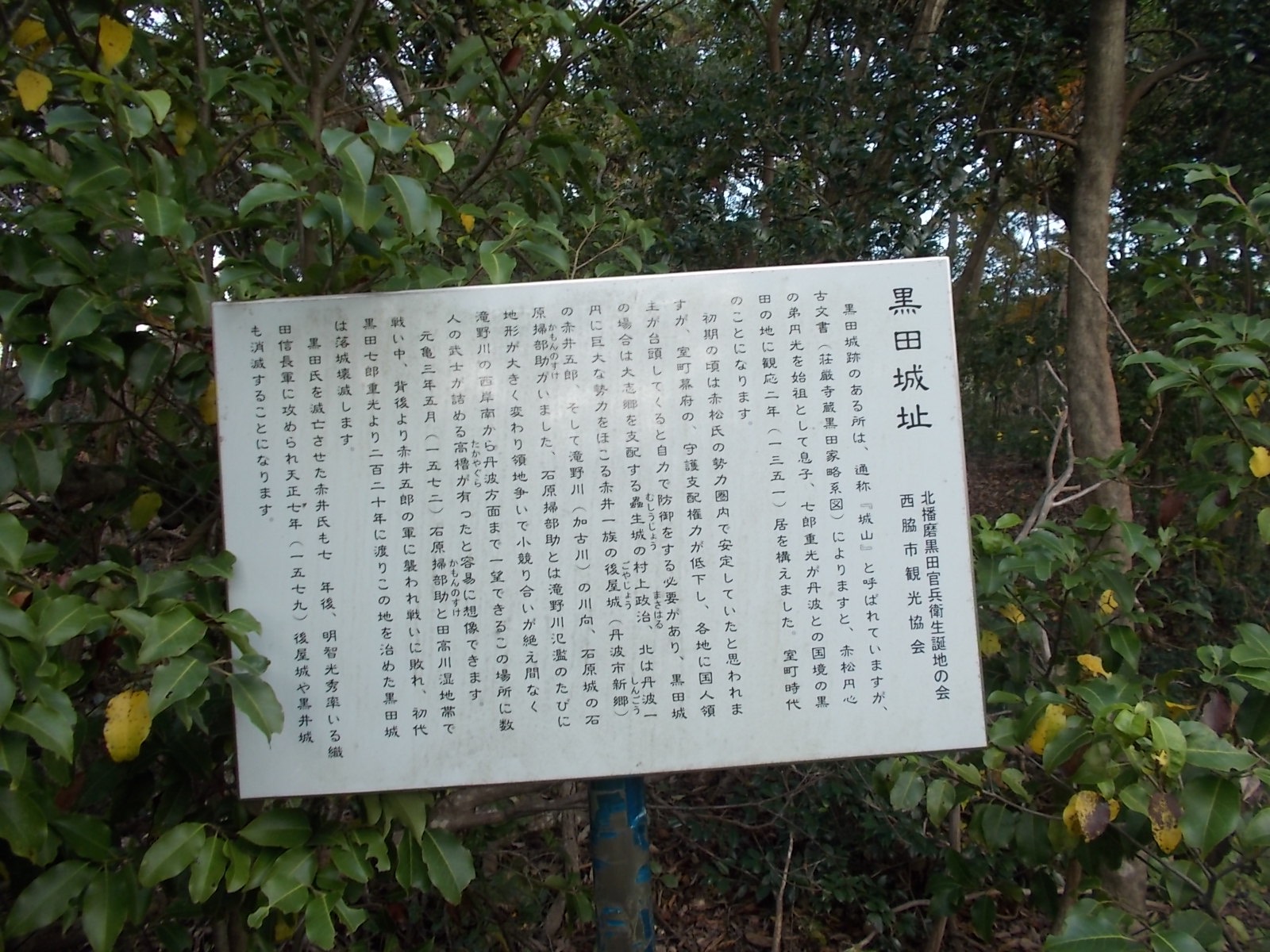 滝野社ICからR175を北上、田高の交差点を右折し、加古川を渡ってまっすぐ行くと黒田城址の標柱があるのでそこに駐車する。