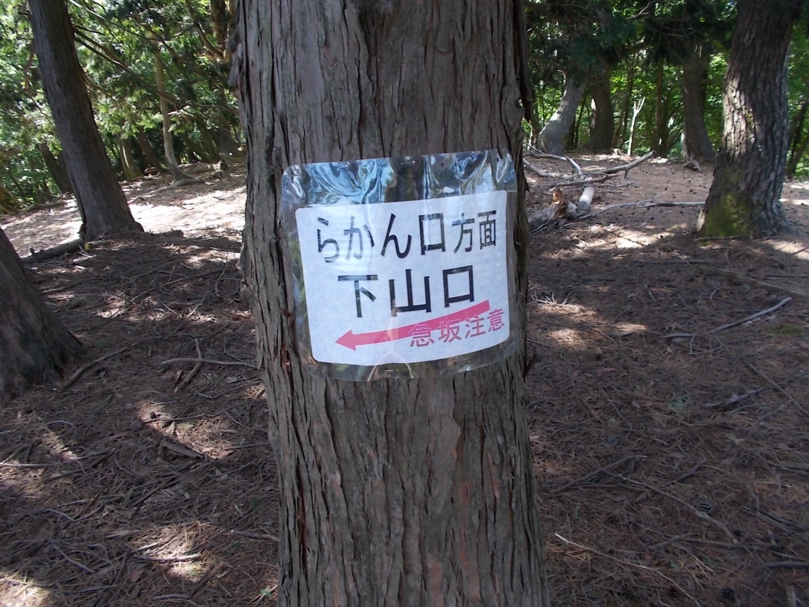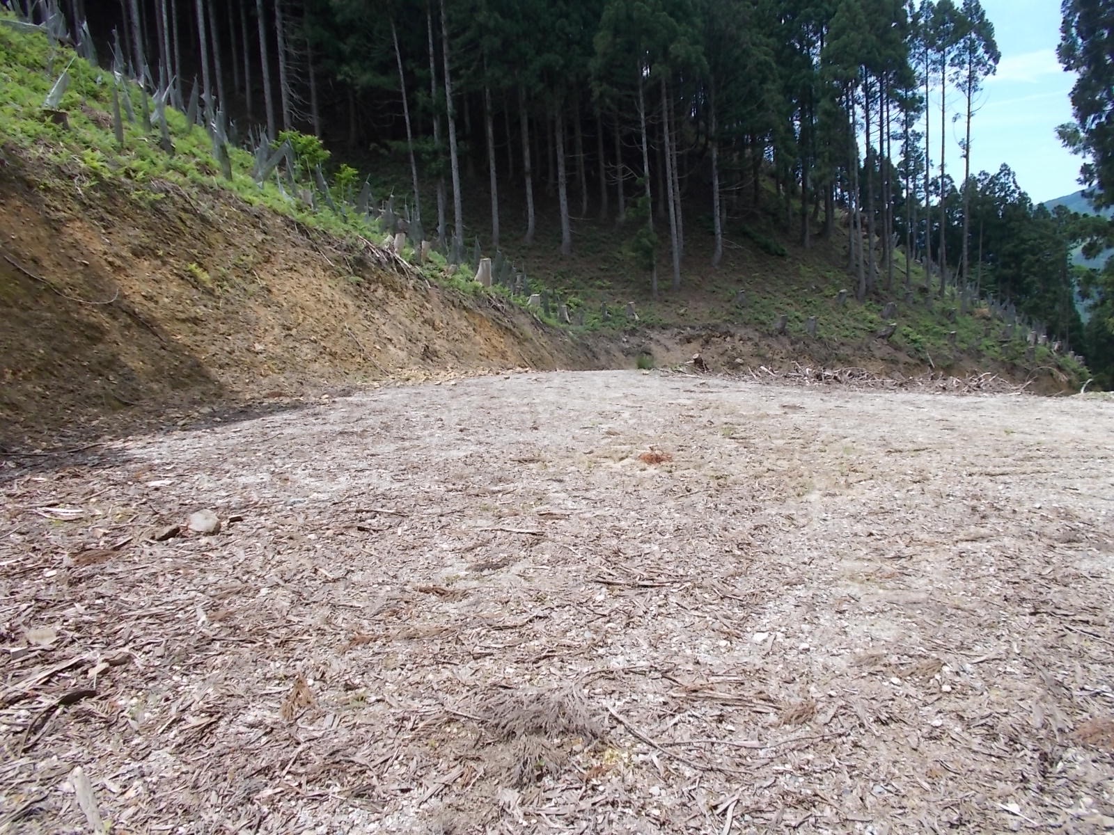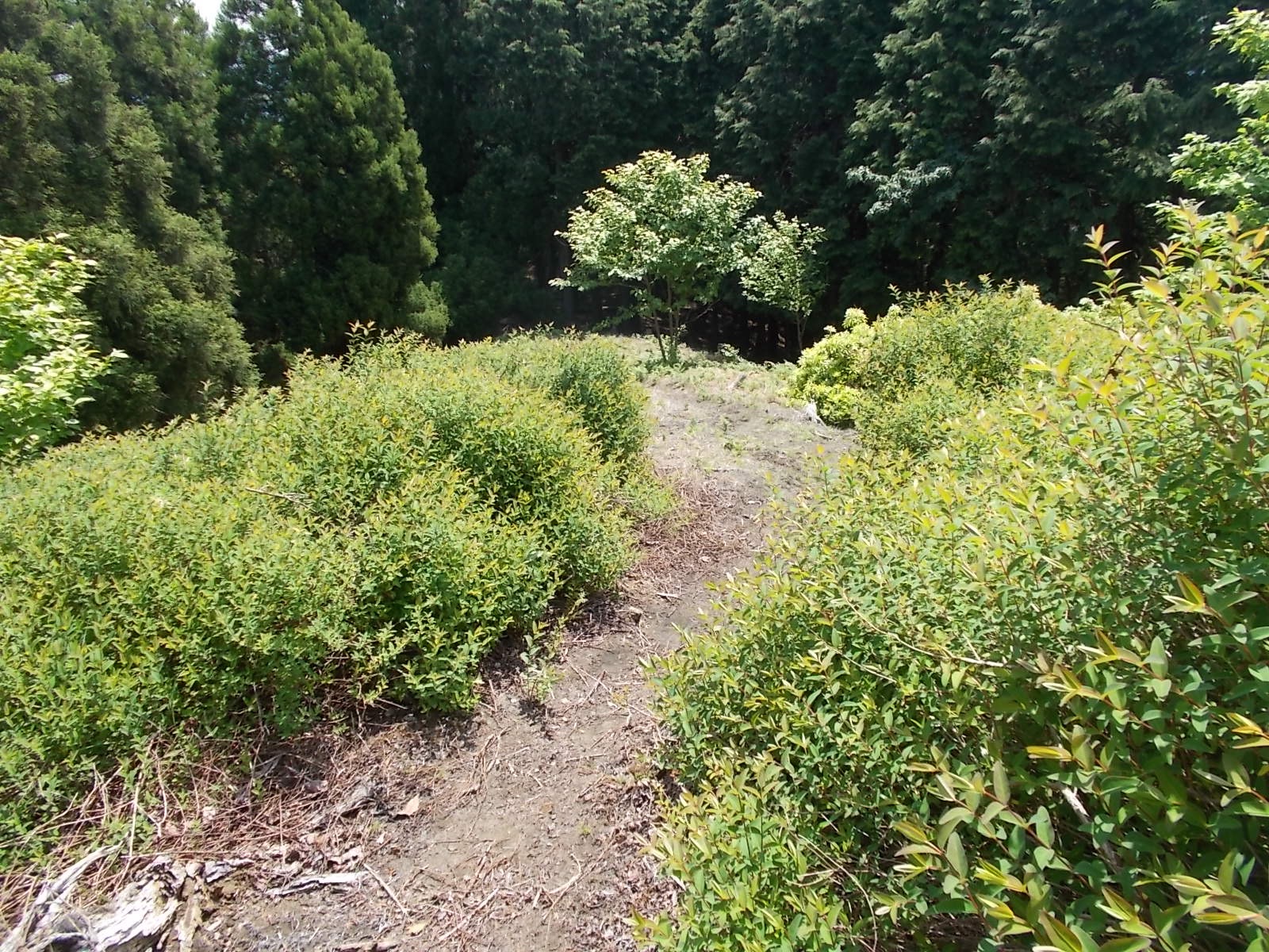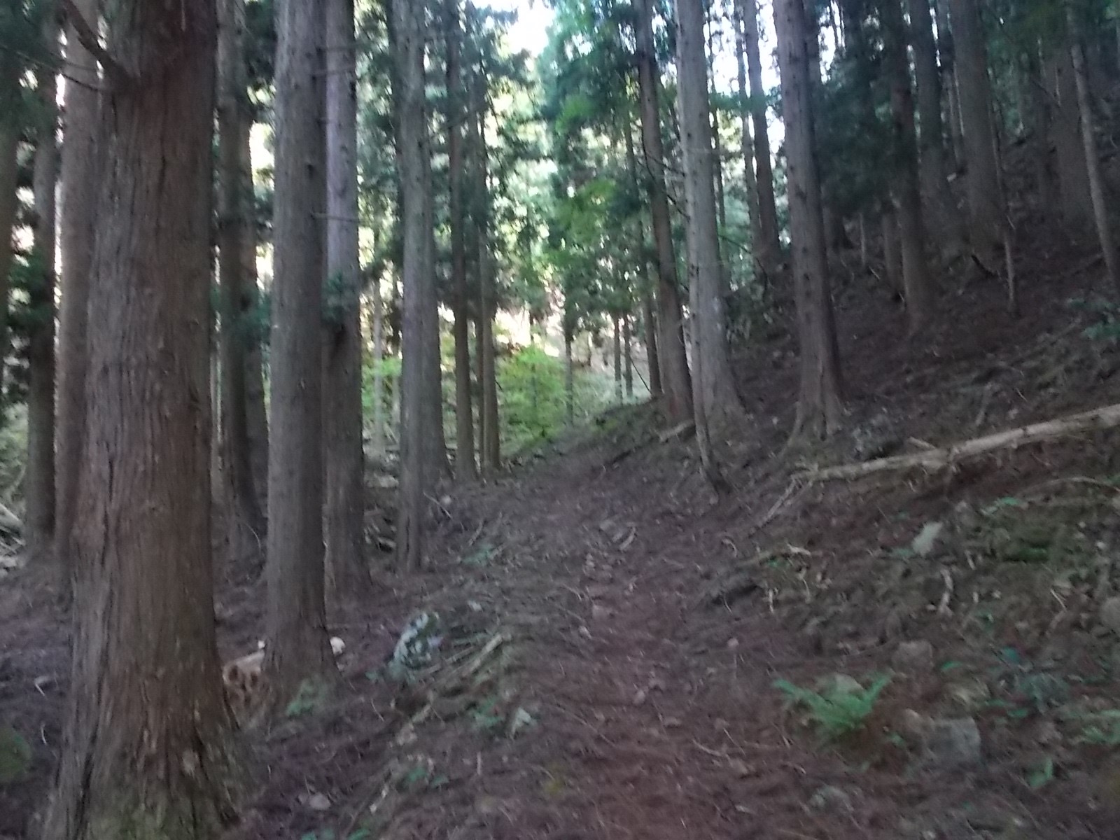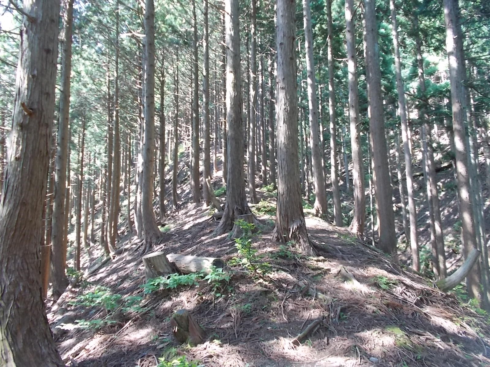 植林された斜面のコルに出るのでそこから斜面を下り、作業道におりる。