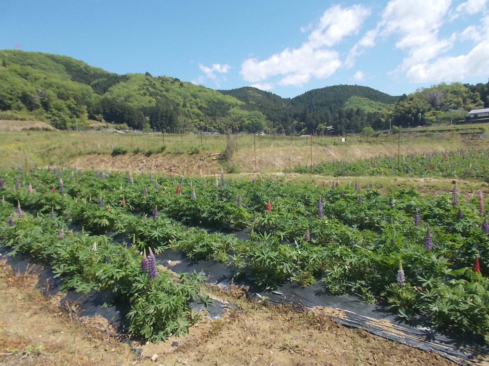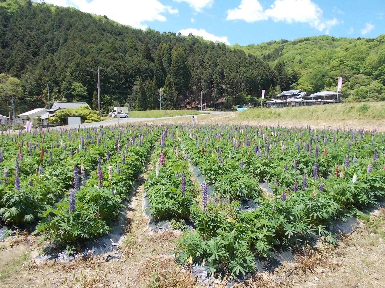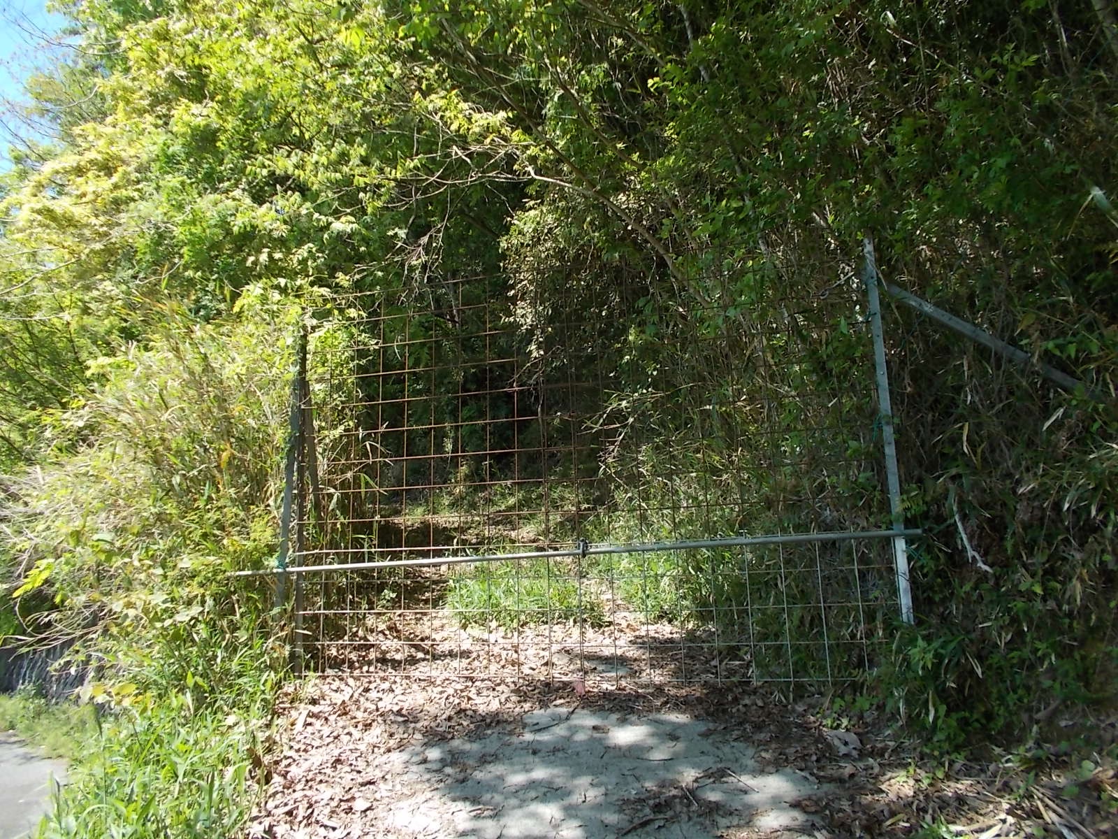 ラッセルルピナスを見ながら、舗装路を歩くと左手に獣柵が見えるので、それを開けて林道を進む。