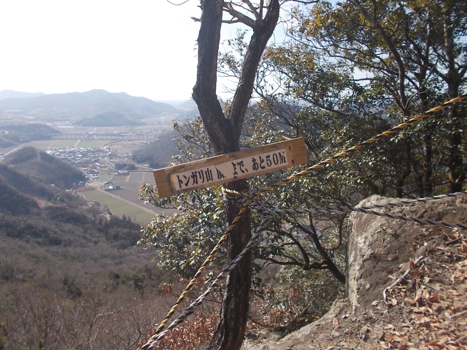 峰相の里の駐車場から来た道を少し戻ると登山口の案内板があります。そこから案内に従って進むと、登山口に着きます。しばらく歩くととっても急な登りが待っています。頑張って登ると尾根に乗り、すぐに神岩に着きます。この上からの眺めは最高です。そしてすぐにとんがり山への急登が待ち受けています。