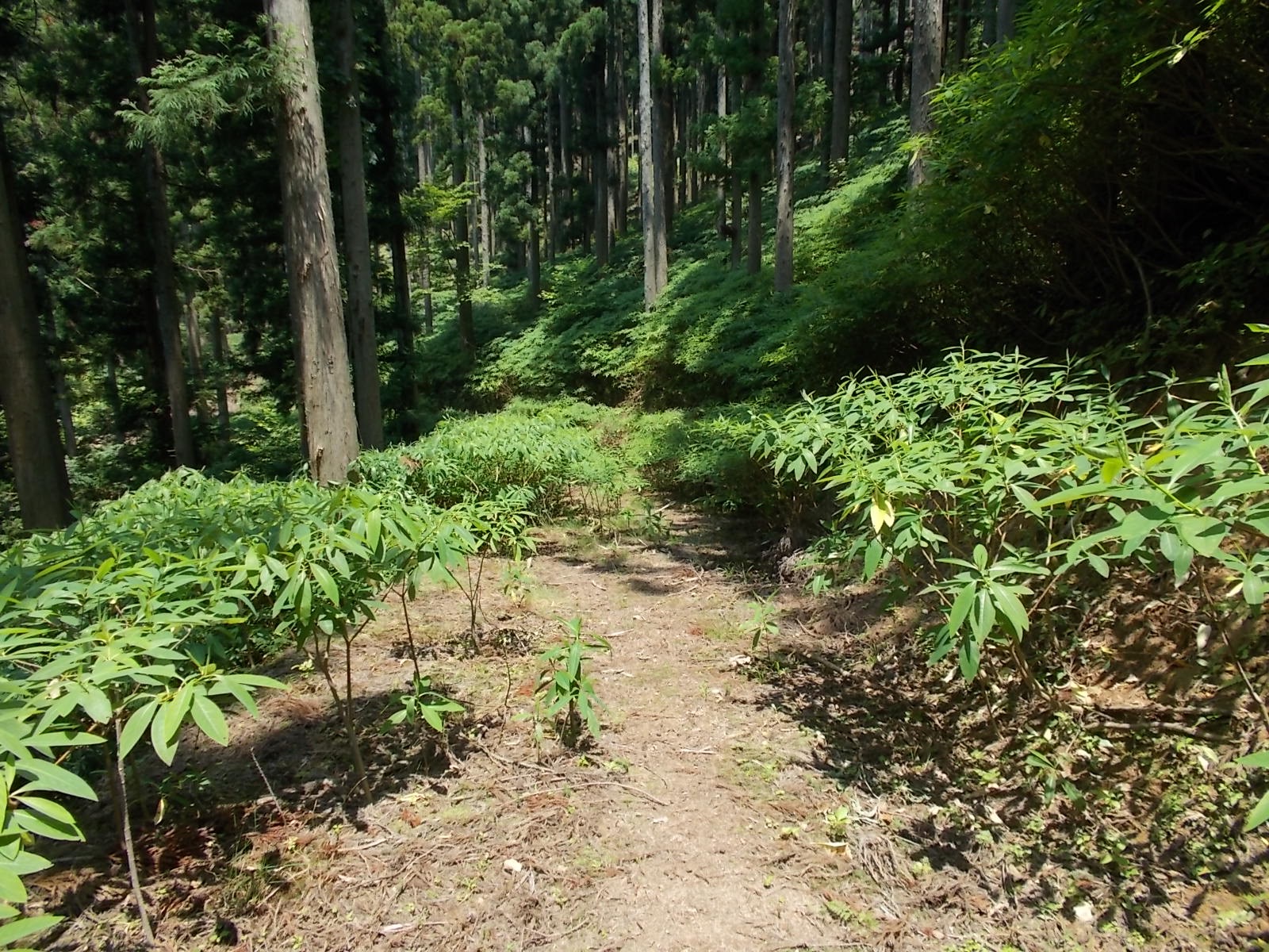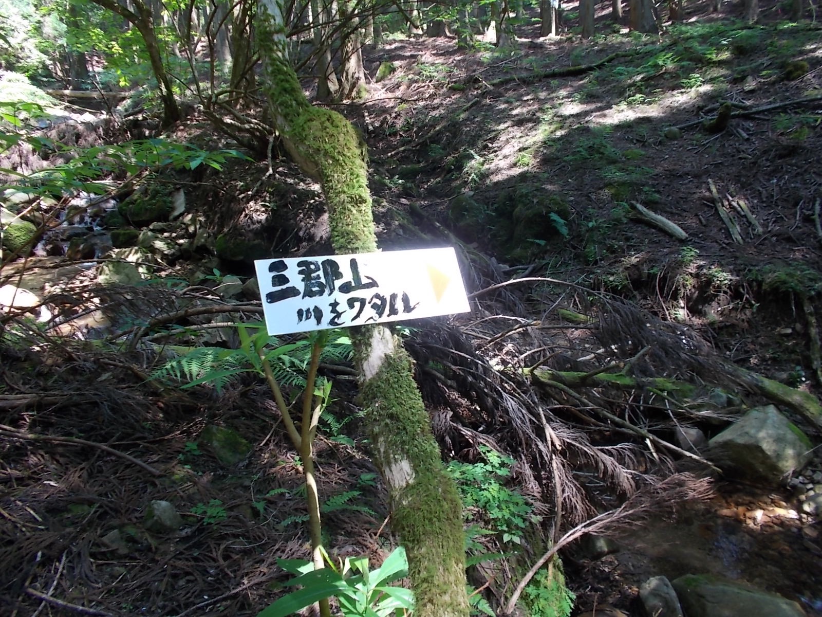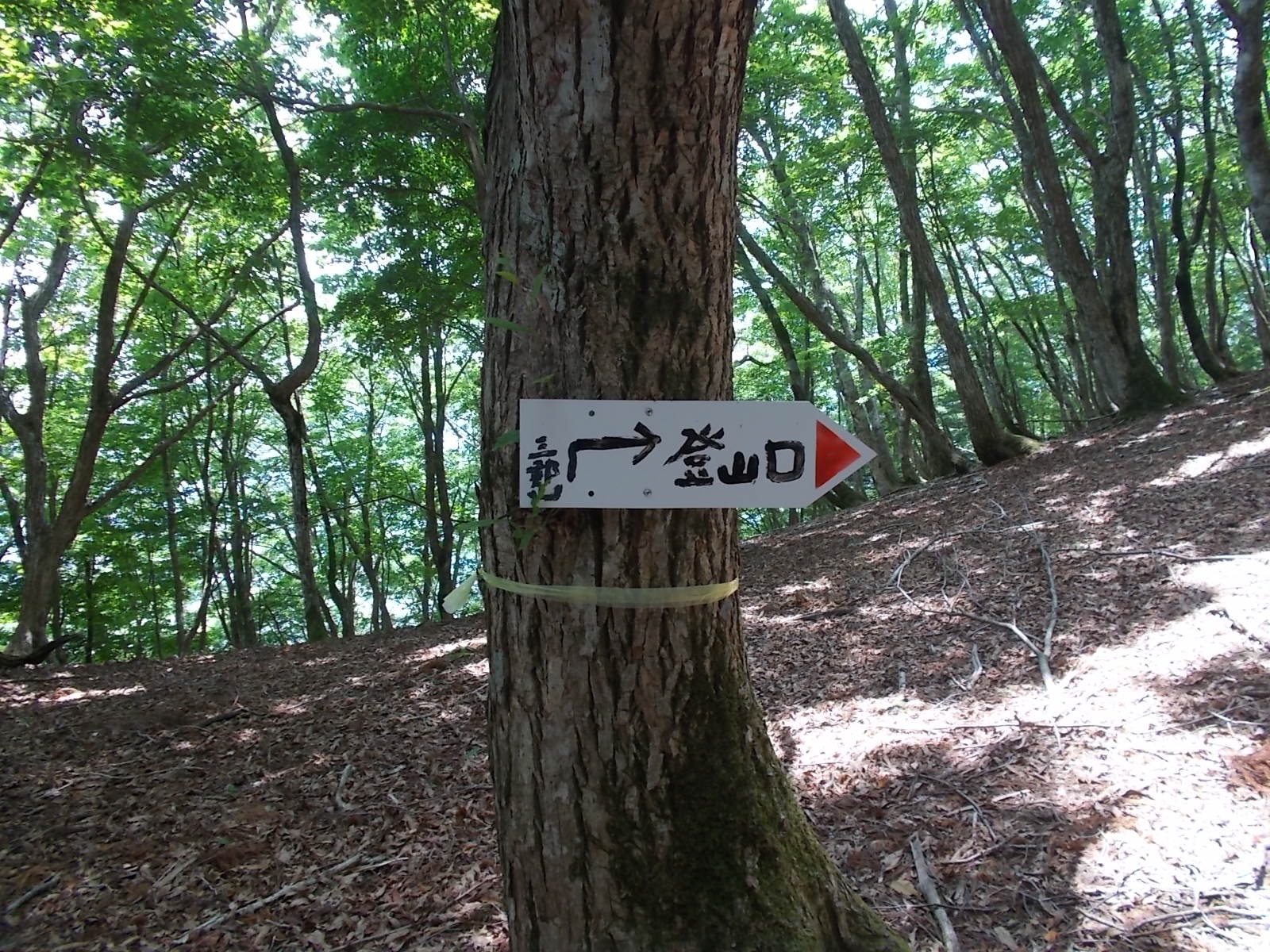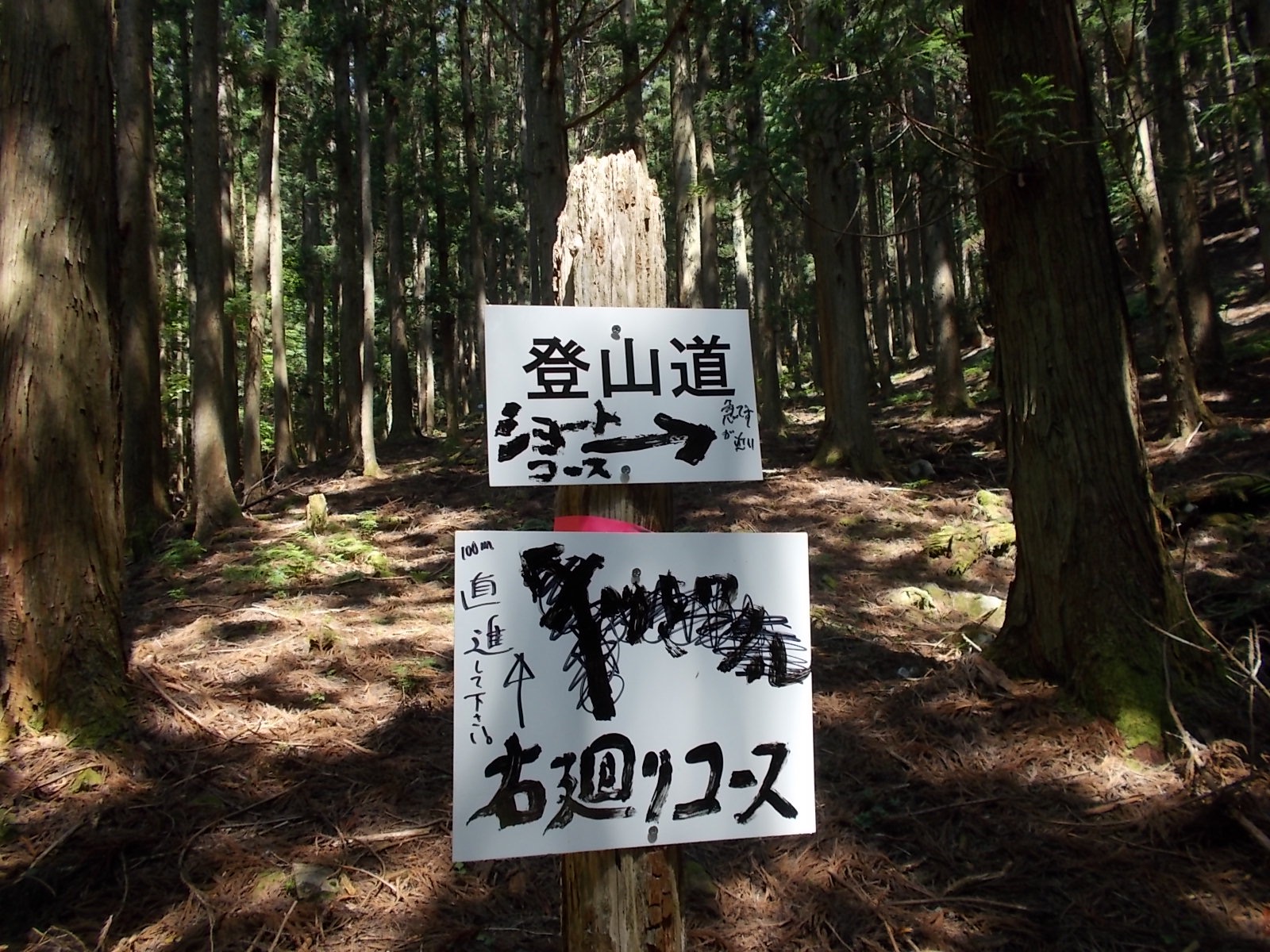 ここからしばらく林道を歩き、登山口の案内から入り、沢を渡った所で一般とショートカットの2コースに分岐。