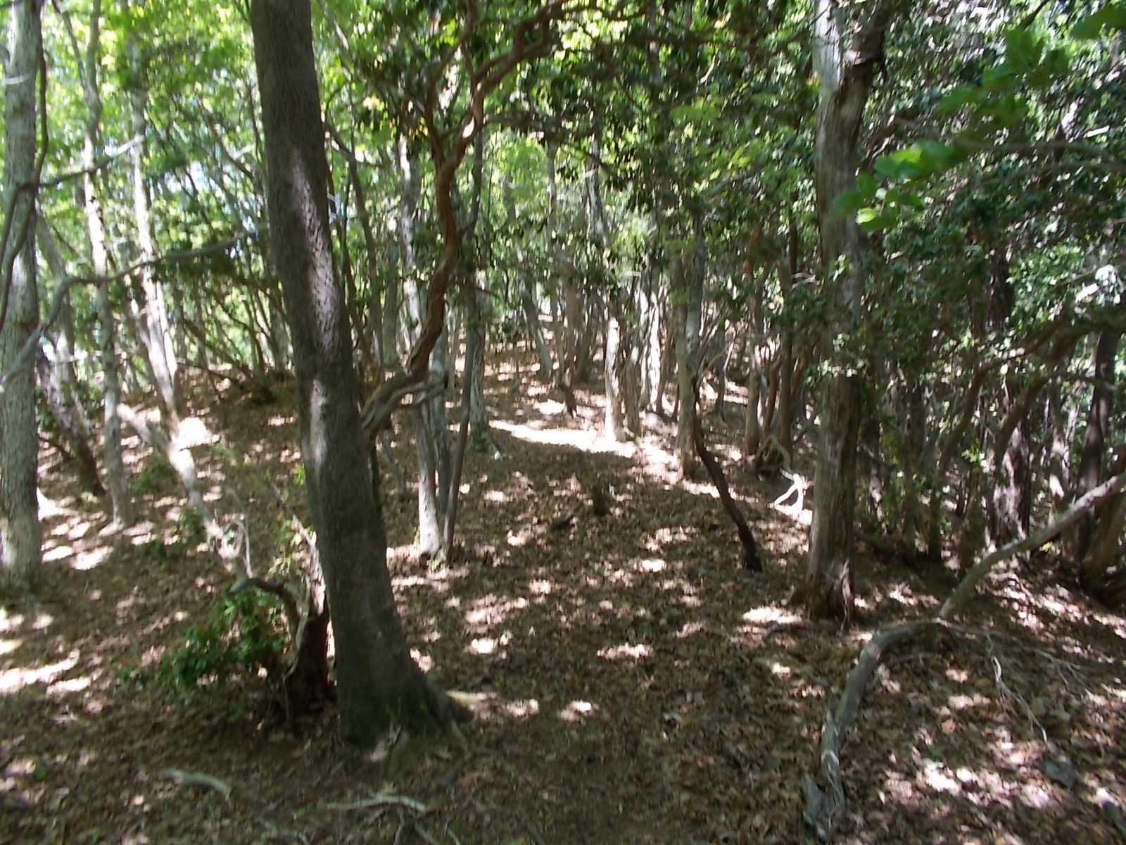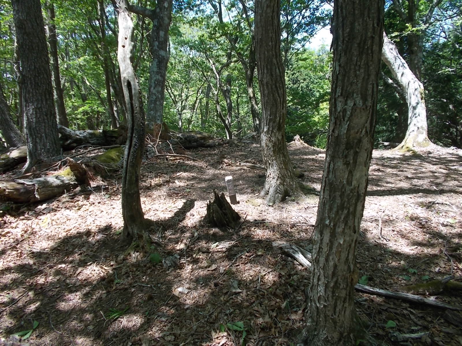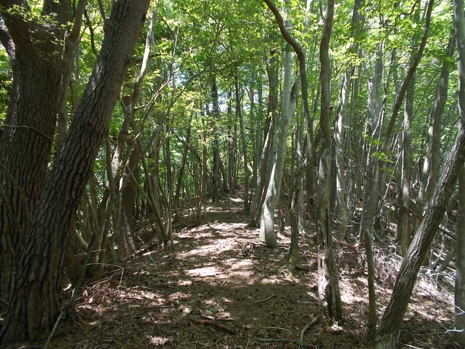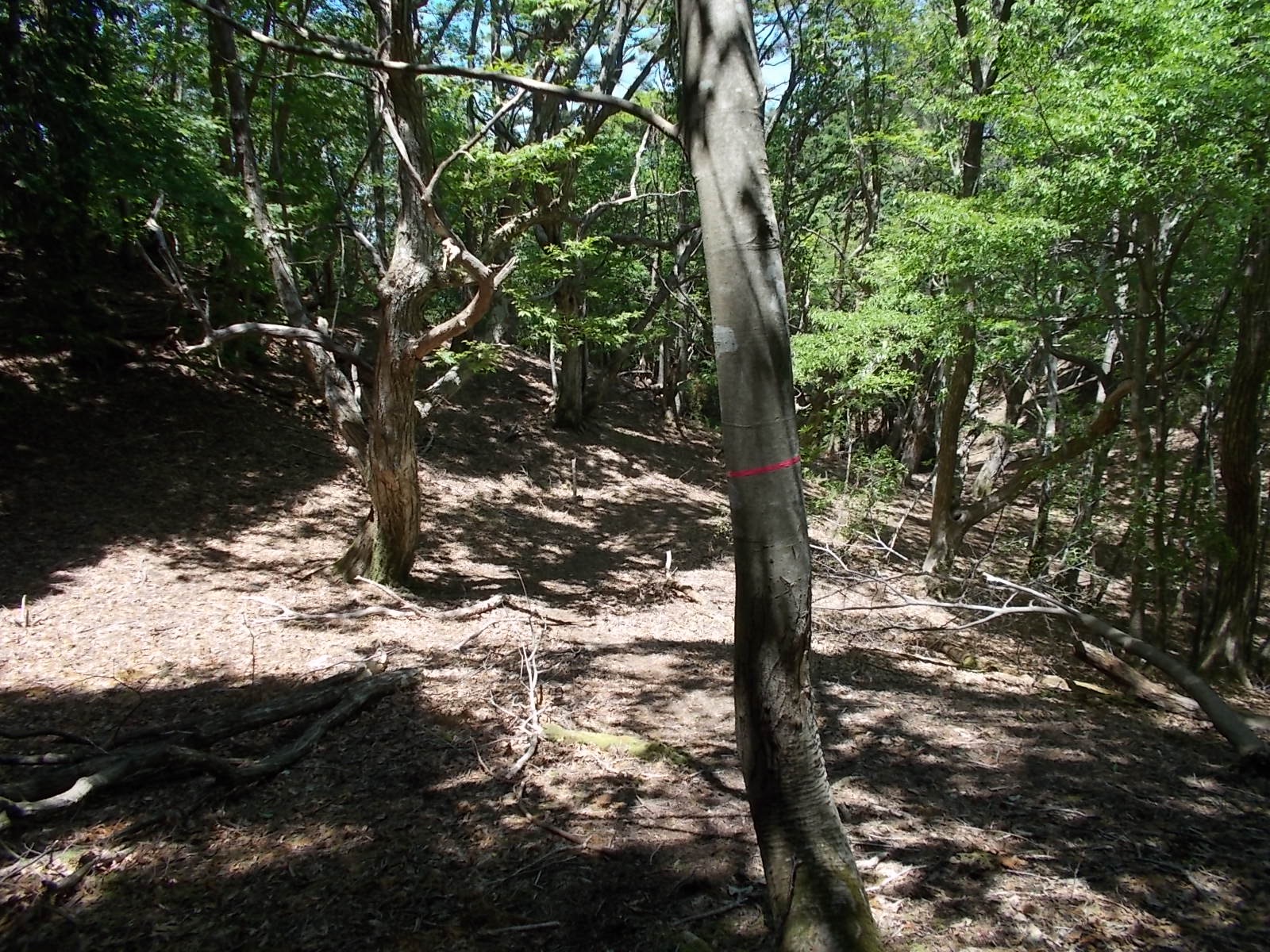 今回は正規の登山口ではなく市境を進むのですが、取り付きがわからず適当に登れそうな所から入りました。だんだん厳しい上りになり、左へ左へと逃げるうちに正しいルートに出て、しばらく登ると山頂に着きました。
