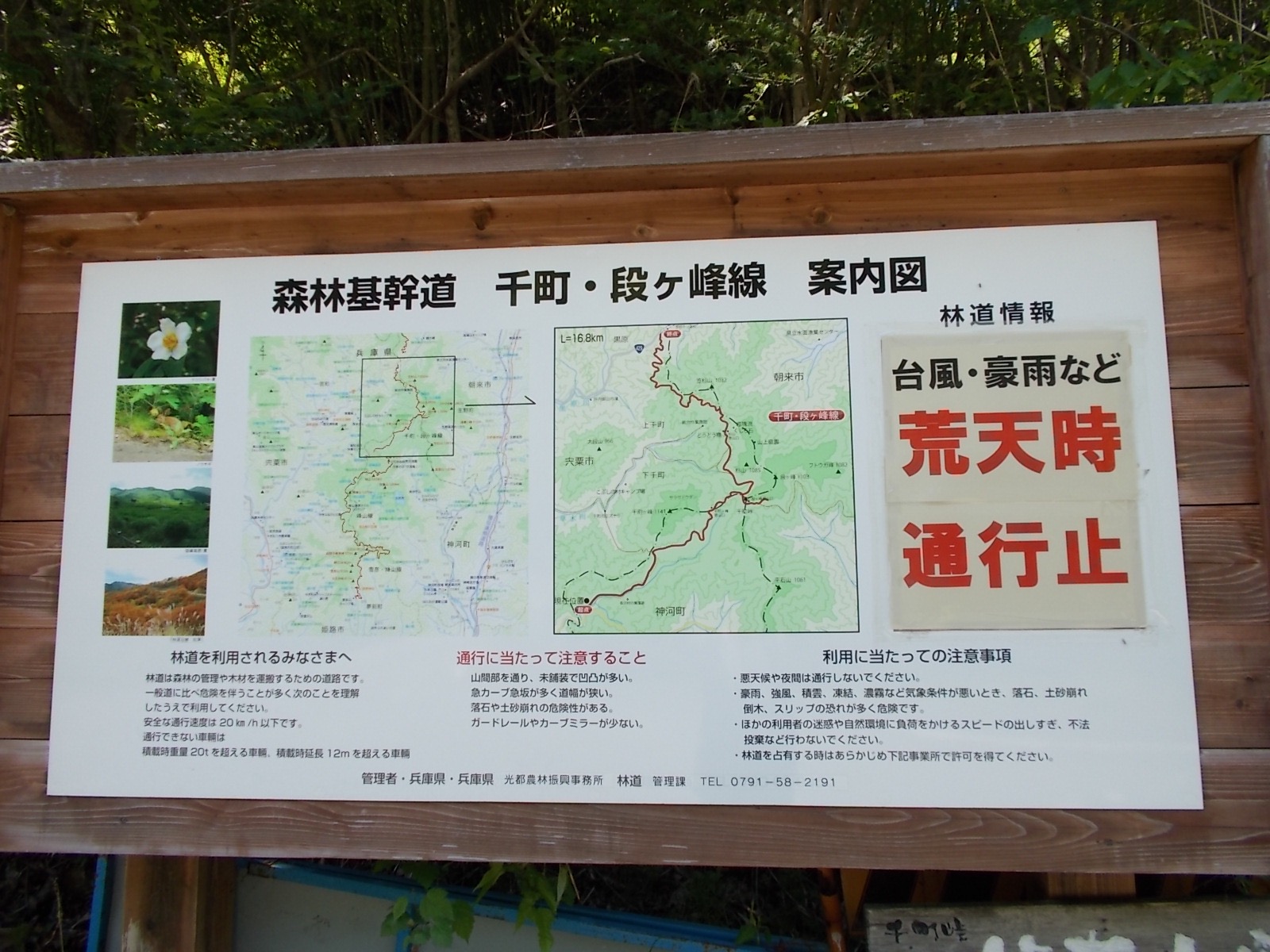 播但道神崎南で下りて砥峰高原を目指す。高原のススキを左手に見ながらさらに進み、人工林の中の狭くて暗い舗装路を我慢して進むと三差路に出る。その左手の広場に駐車する。