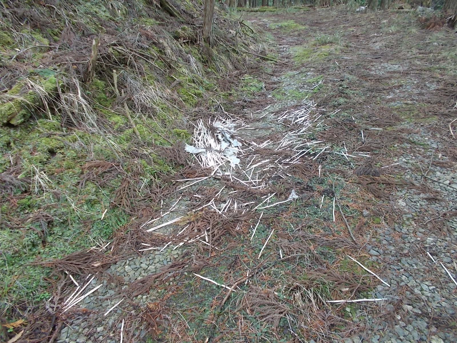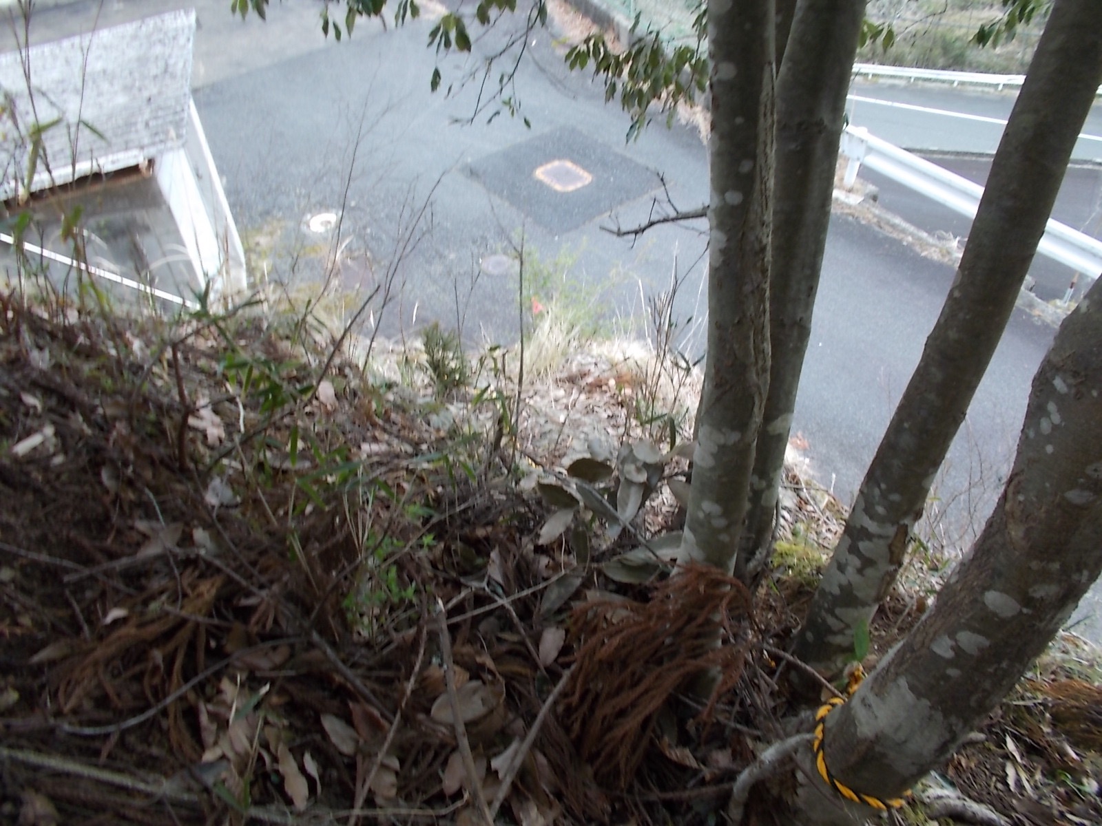 ここでもよく探すとテープとペンキが見えたのでそちらへ下りていきました。ここもかなりの急斜面ですが、何とか下りきると別の林道に出て、すぐに県道154にでました。
