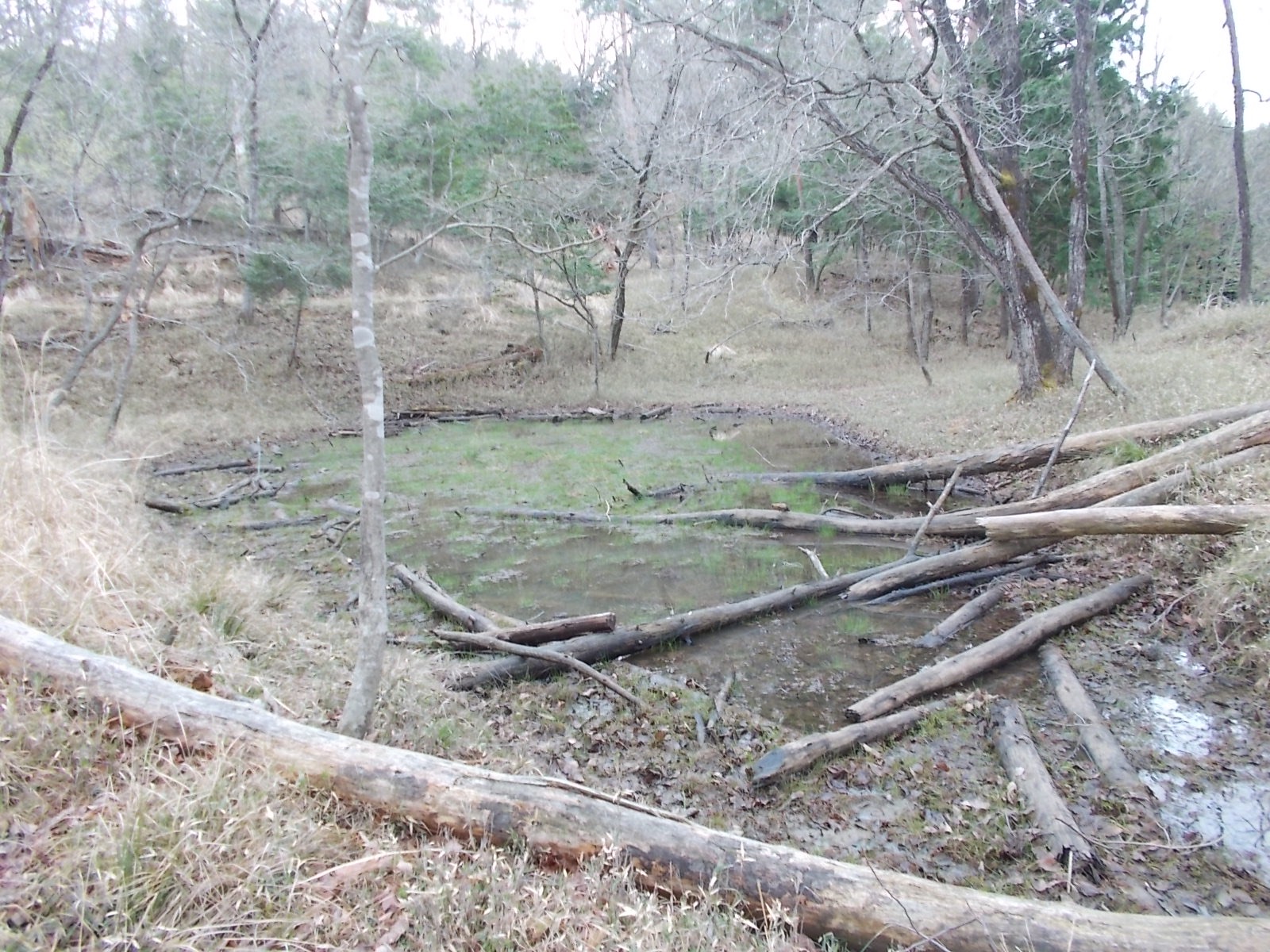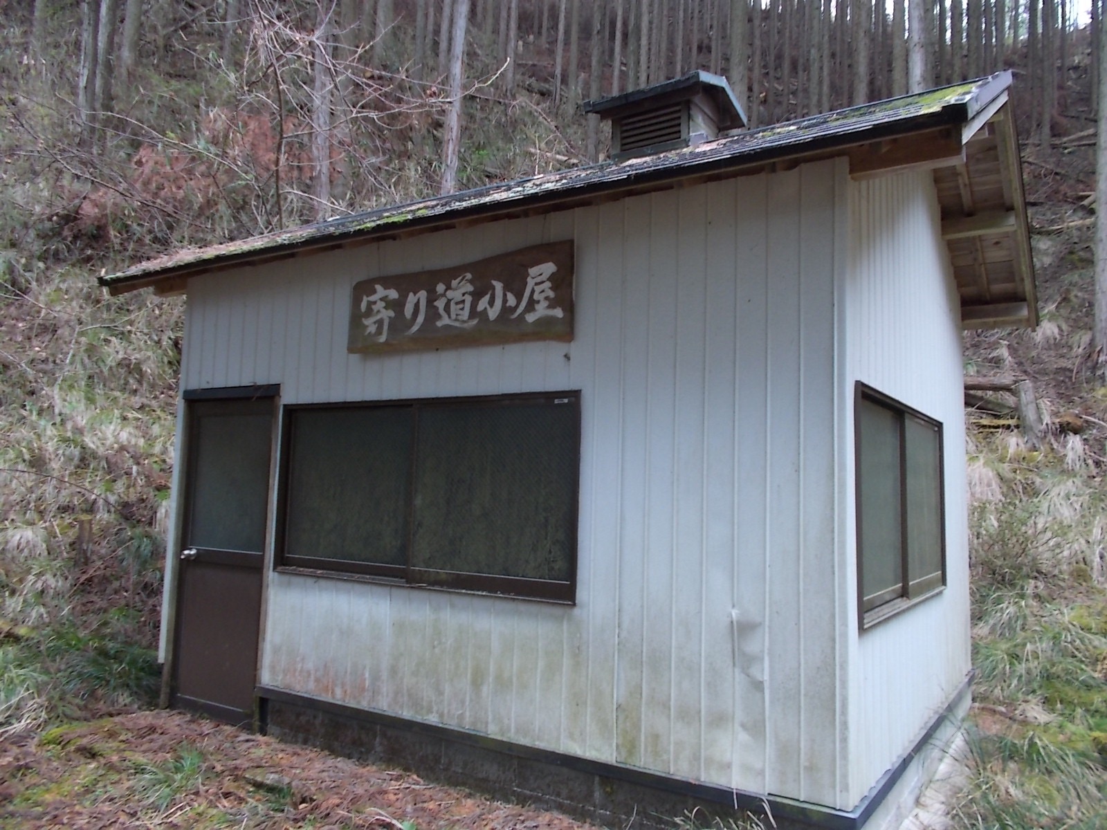 けっこう急な下りを下りきると林道へでて、そこに寄り道小屋がありました。ここから林道を歩き、分岐を右へ行くとやがて行き止まりに。