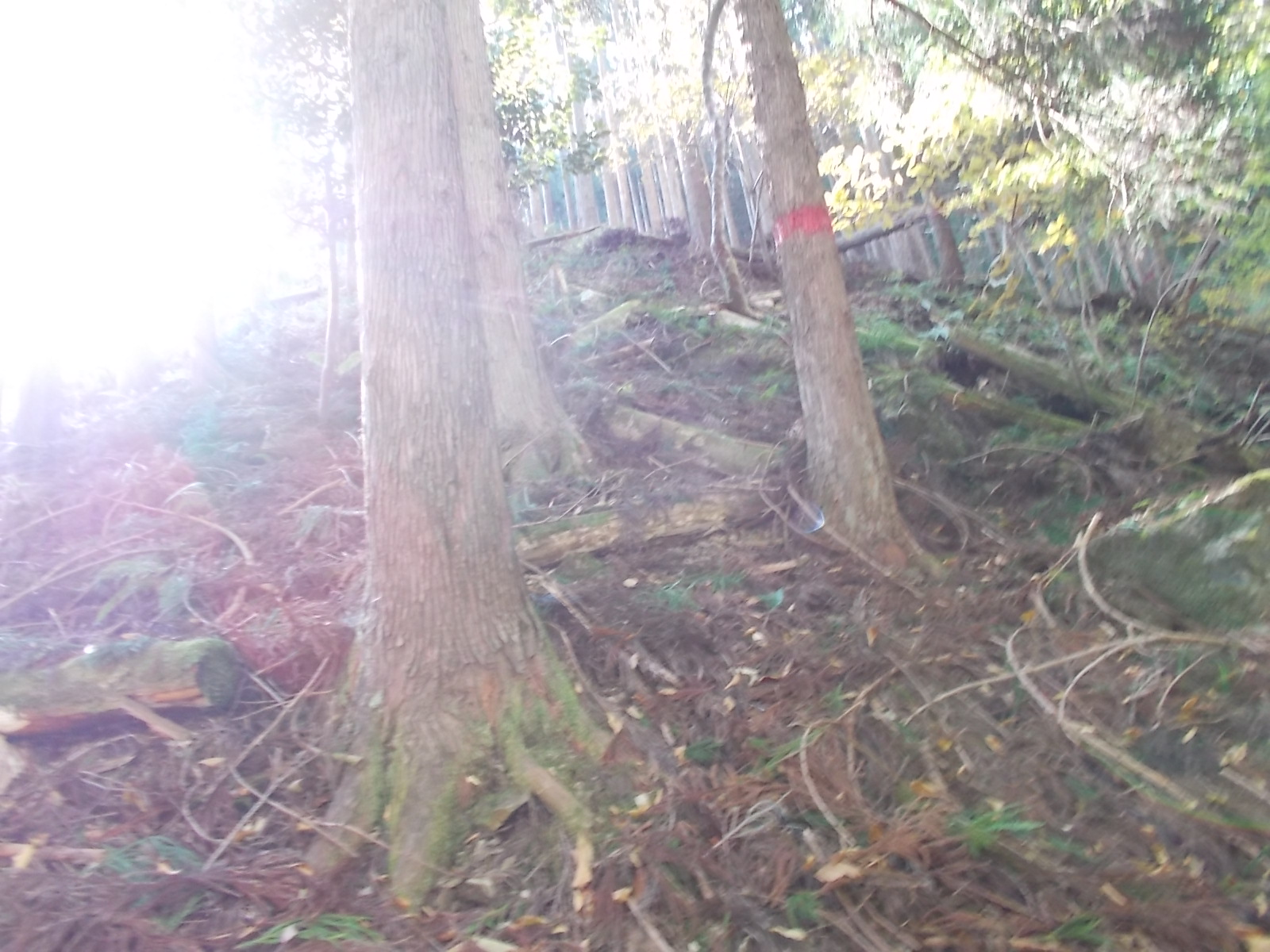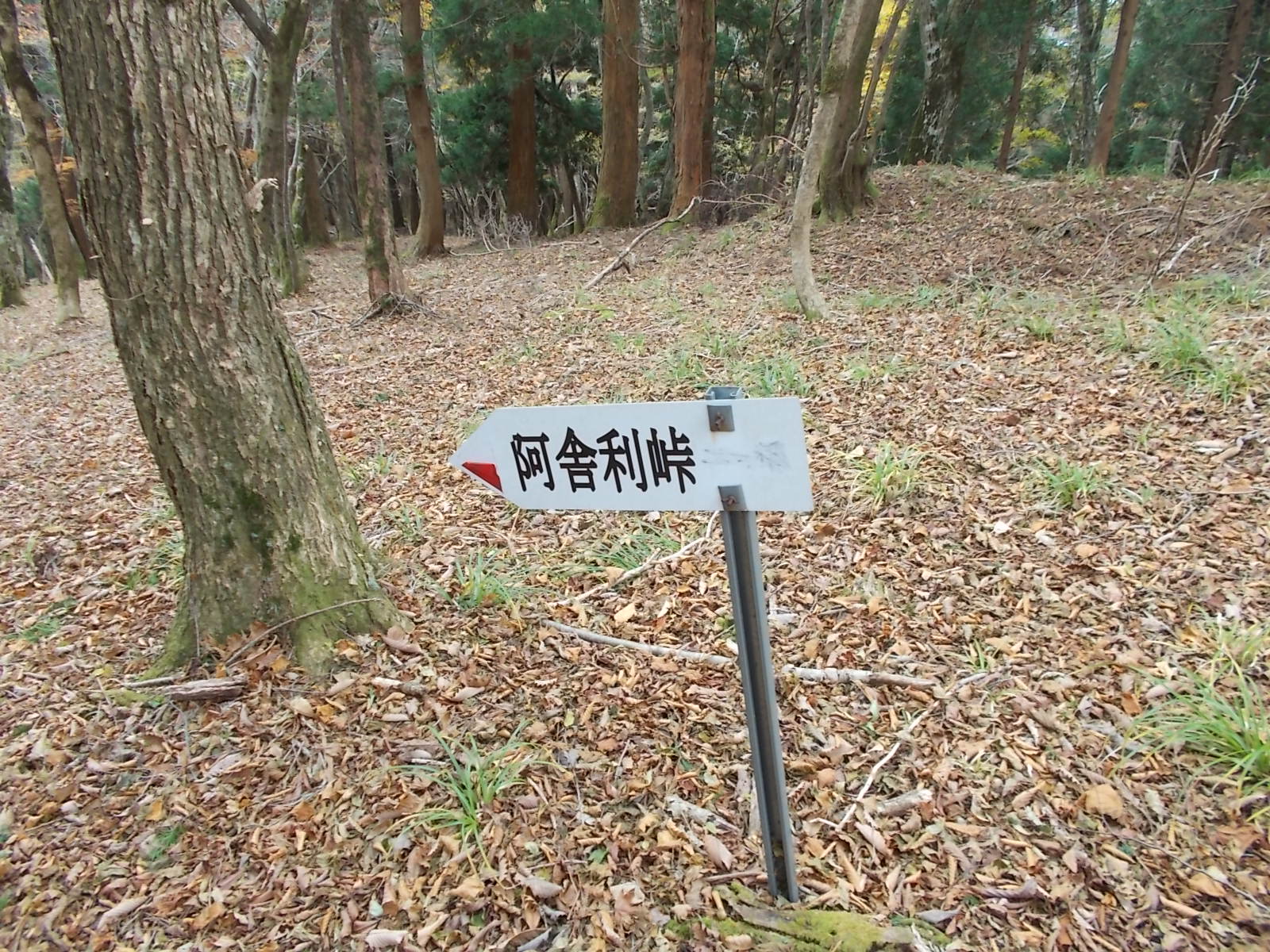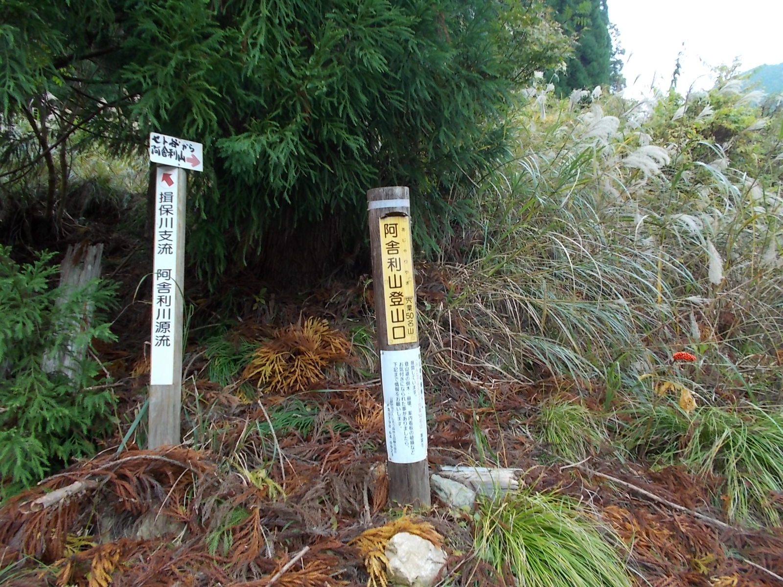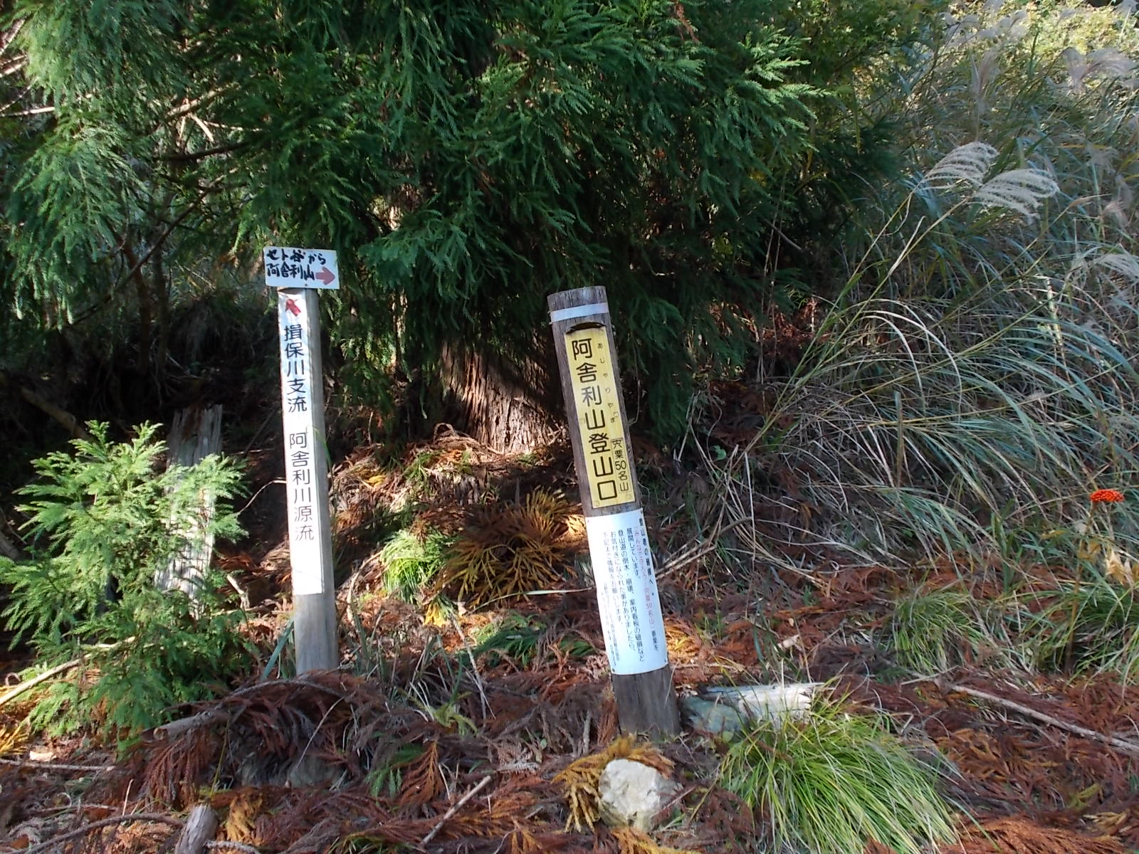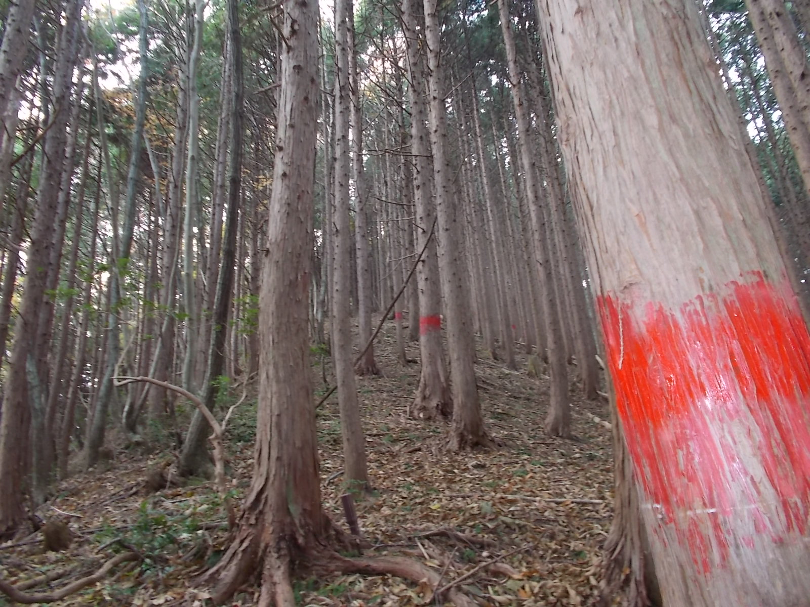 右の「セト谷をへて阿舎利山」に従い林道を進み、瀬戸谷川を何度か渡り、倒木をいくつか越えて進む。杉林を進むと杉の幹に赤いペンキで印が描かれている。ここで右への印になるが、案内板がないのでそのまま直進してしまいました(本来は案内板があり、右へ曲がるのですが、台風のせいでなくなっていたようです)。そのままいくつかのピークを越えると山頂からすぐ南のピークに出ました。ピンクのテープがあったのでピークに向かうと山頂につけました。