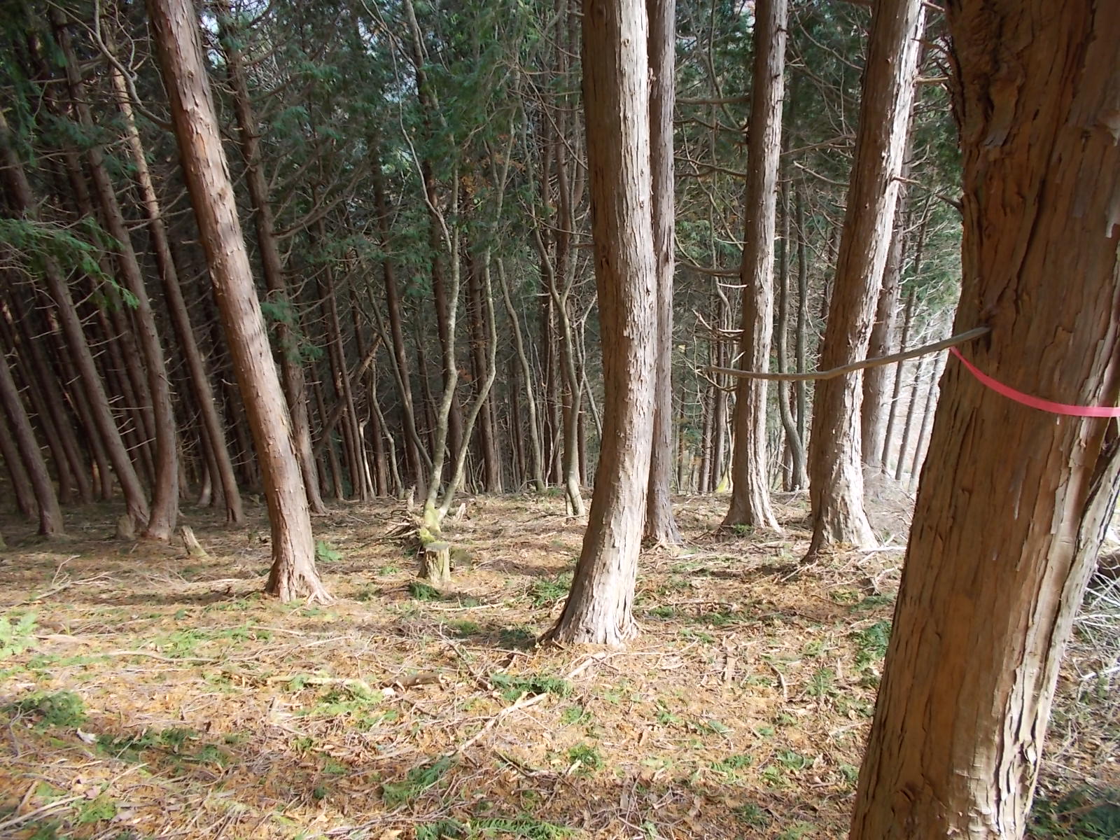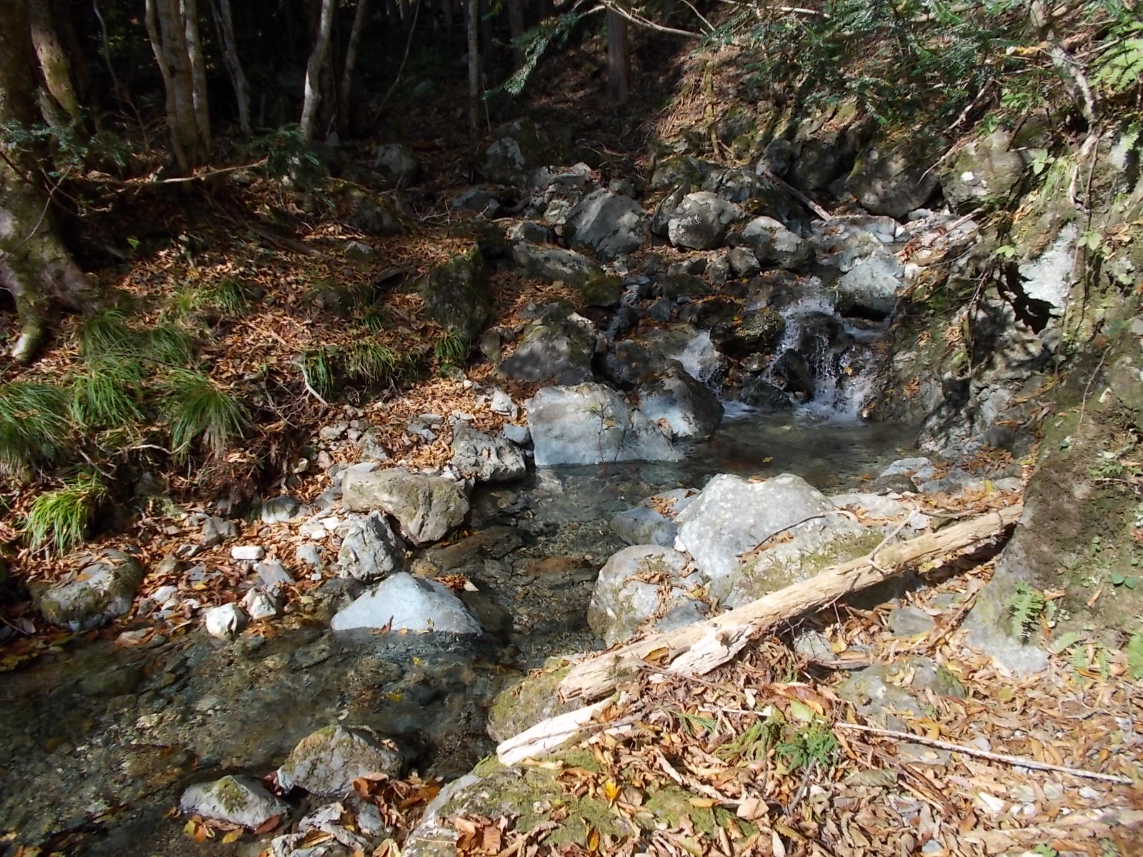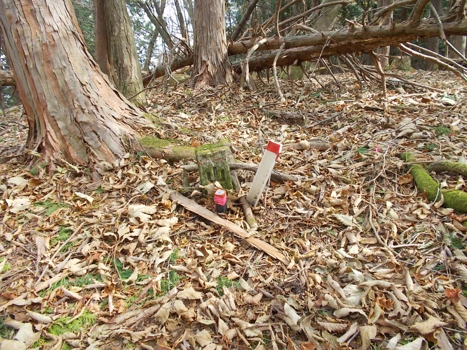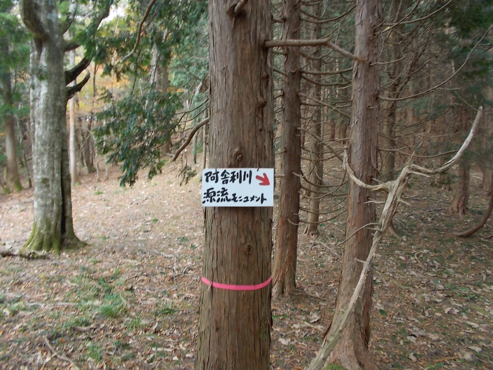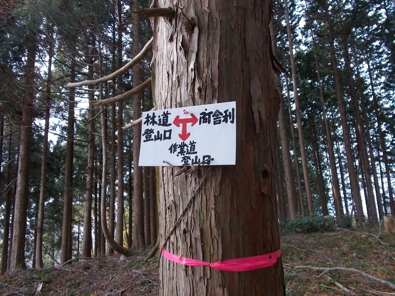 右の「セト谷をへて阿舎利山」に従い林道を進み、瀬戸谷川を何度か渡り、倒木をいくつか越えて進む。杉林を進むと杉の幹に赤いペンキで印が描かれている。ここで右への印になるが、案内板がないのでそのまま直進してしまいました(本来は案内板があり、右へ曲がるのですが、台風のせいでなくなっていたようです)。そのままいくつかのピークを越えると山頂からすぐ南のピークに出ました。ピンクのテープがあったのでピークに向かうと山頂につけました。