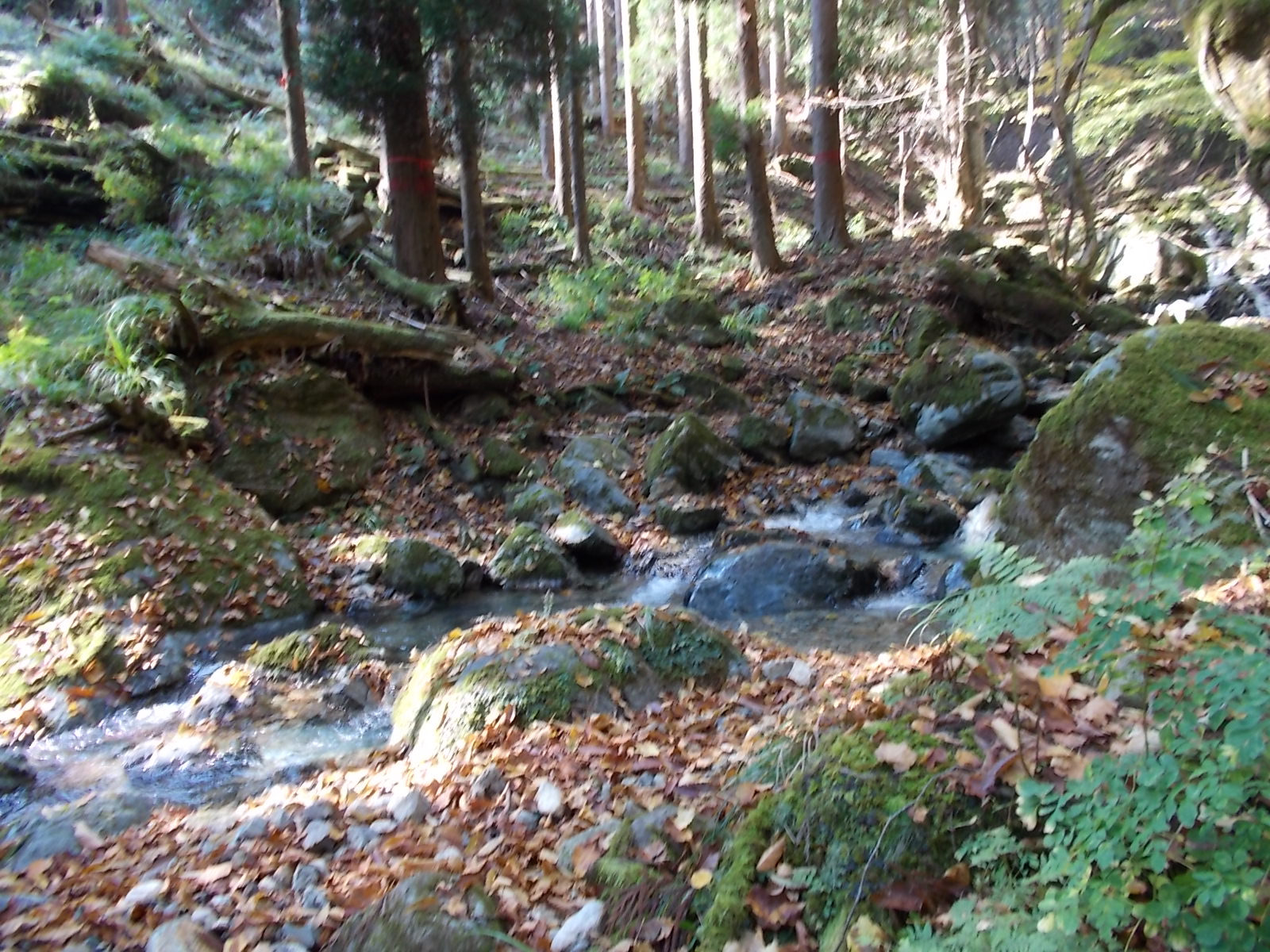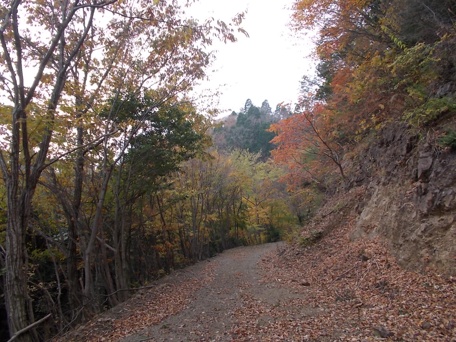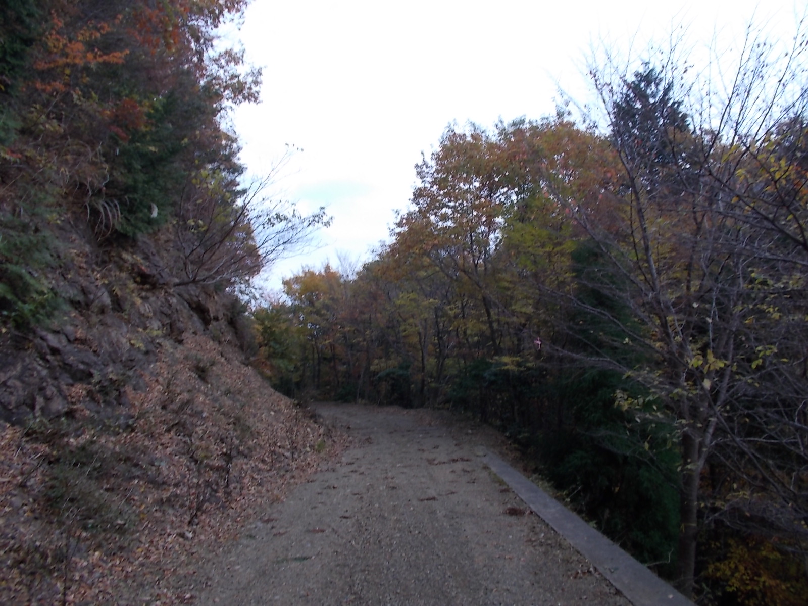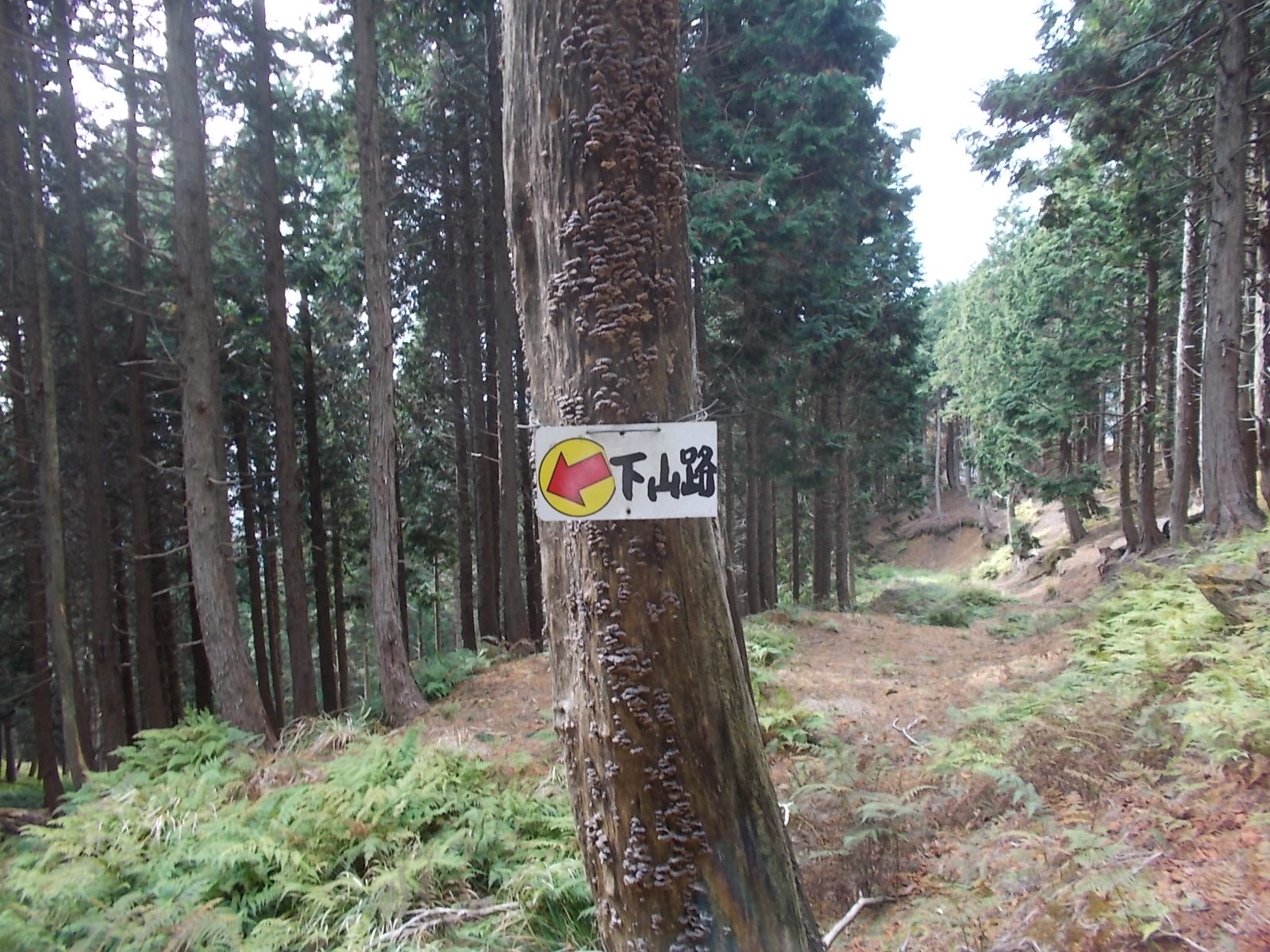 山頂は木々に覆われて見晴らしが悪いので、すぐに下山開始。案内とテープに従い進むと、分岐の案内で強烈な急坂を下り、左手に現れる作業道におりて下の林道に合流、右に進み、後は林道沿いに歩くと二ツ橋に戻って来られた。