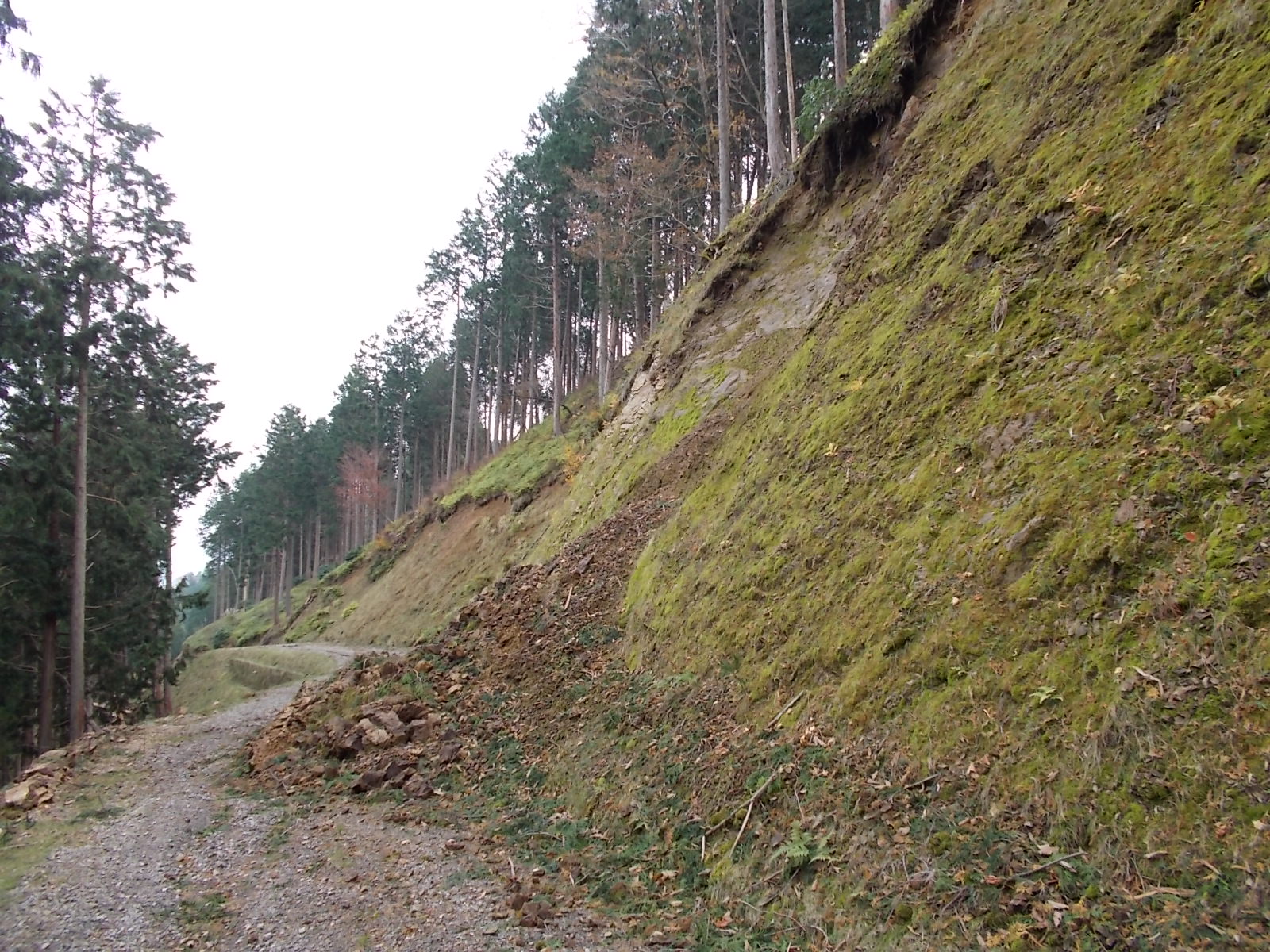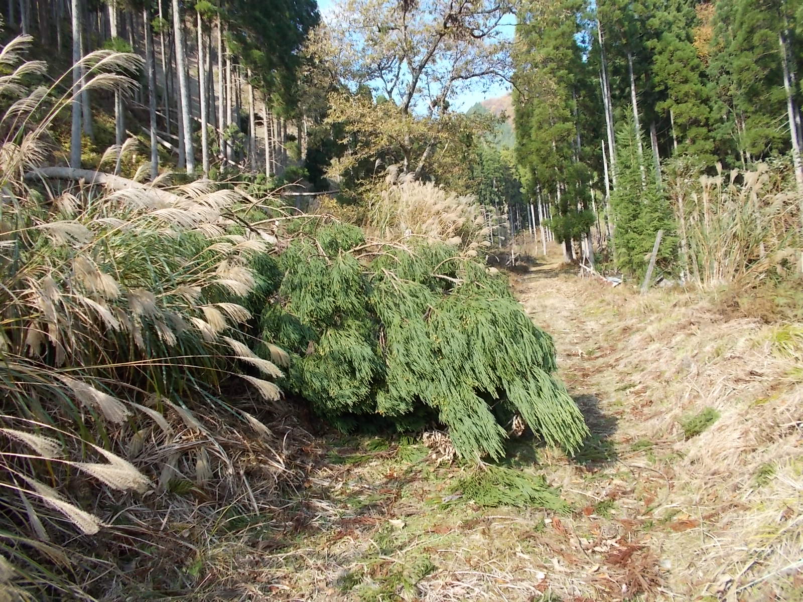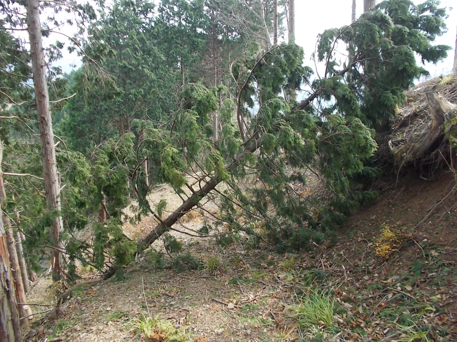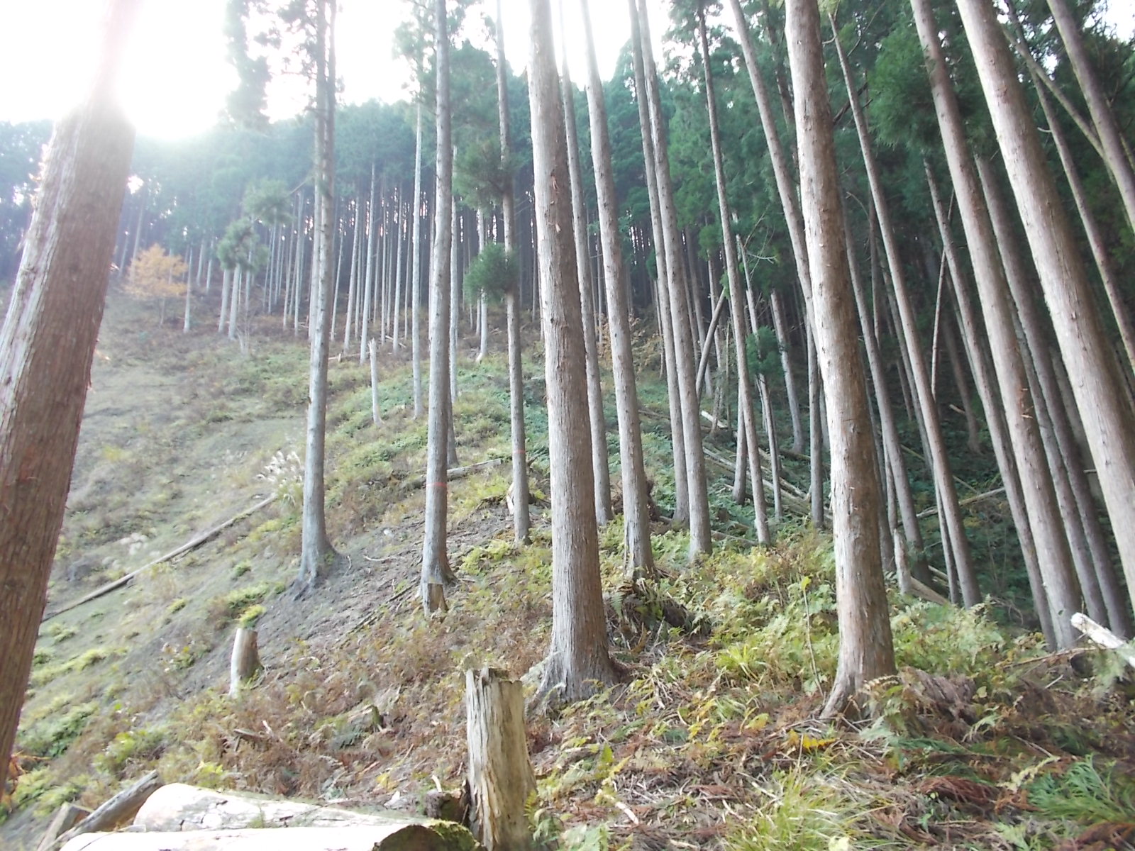 山頂は木々に覆われて見晴らしが悪いので、すぐに下山開始。案内とテープに従い進むと、分岐の案内で強烈な急坂を下り、左手に現れる作業道におりて下の林道に合流、右に進み、後は林道沿いに歩くと二ツ橋に戻って来られた。