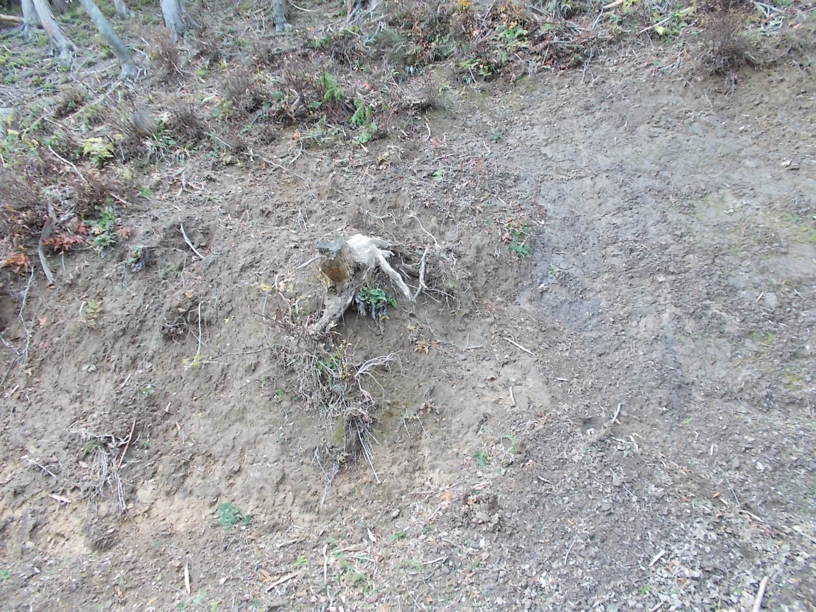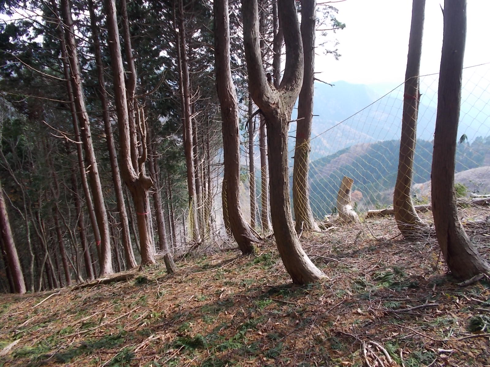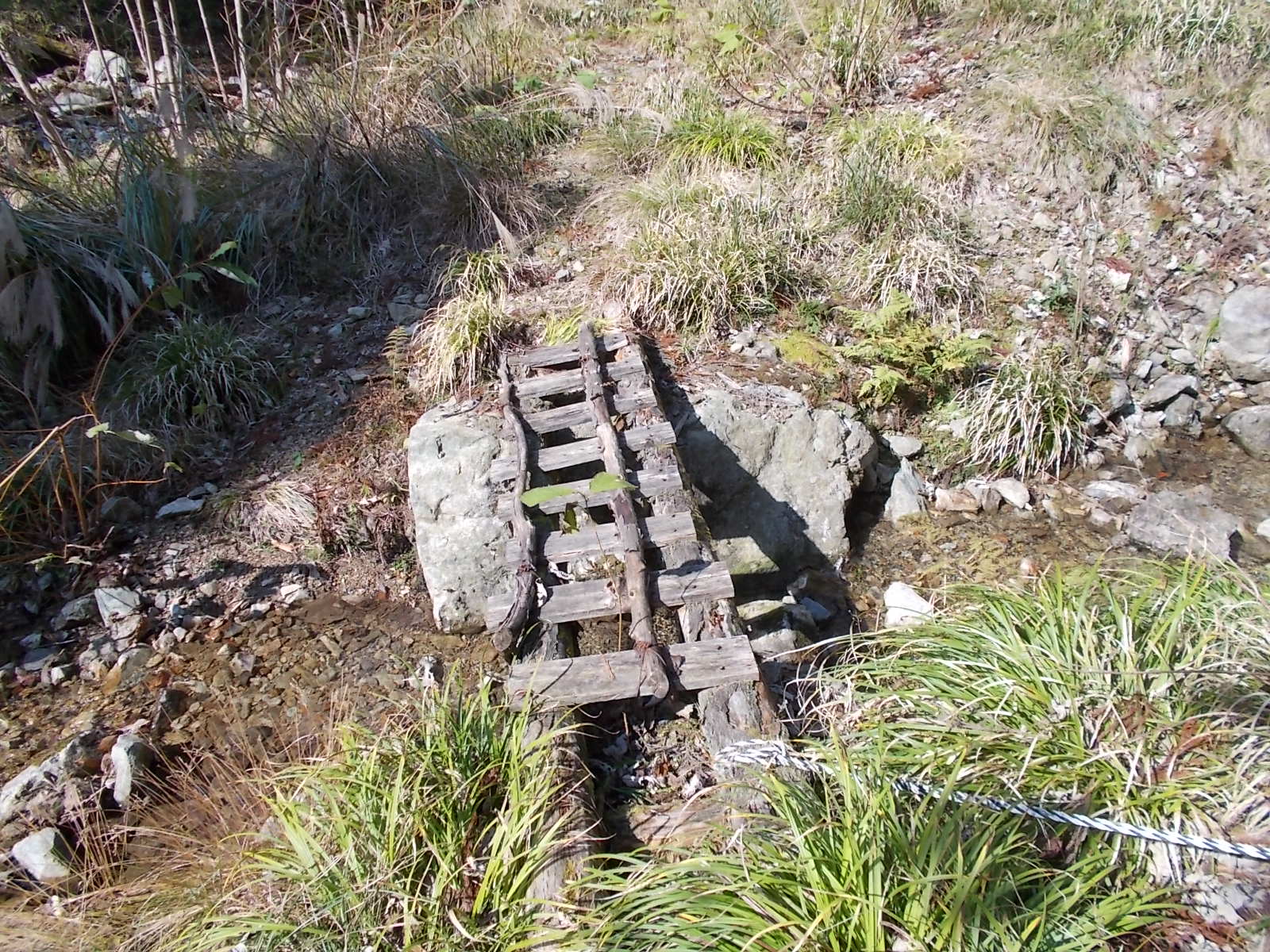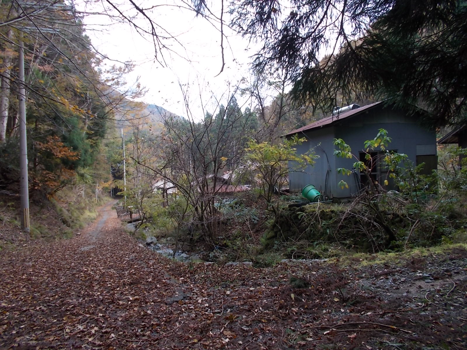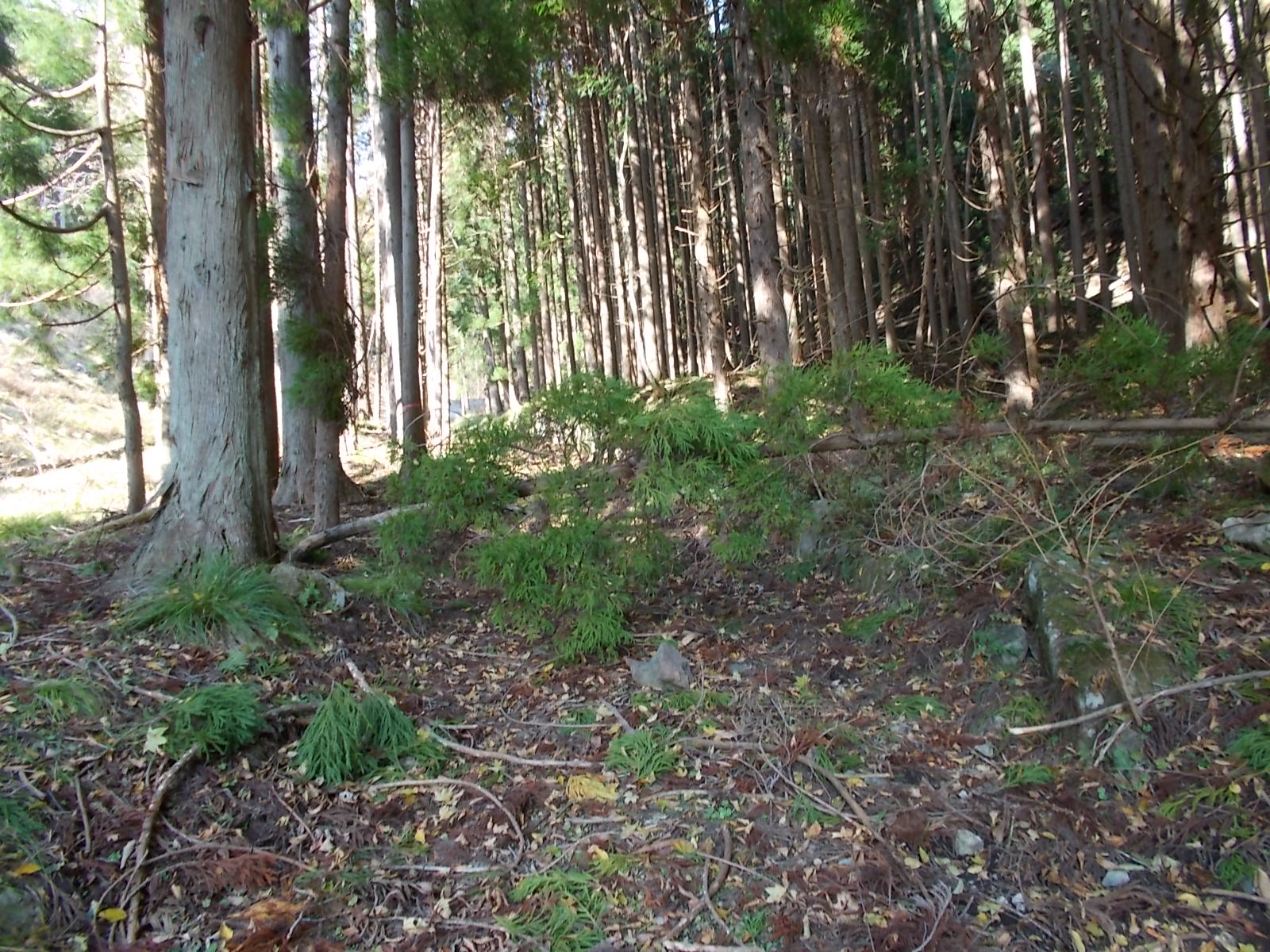 山頂は木々に覆われて見晴らしが悪いので、すぐに下山開始。案内とテープに従い進むと、分岐の案内で強烈な急坂を下り、左手に現れる作業道におりて下の林道に合流、右に進み、後は林道沿いに歩くと二ツ橋に戻って来られた。