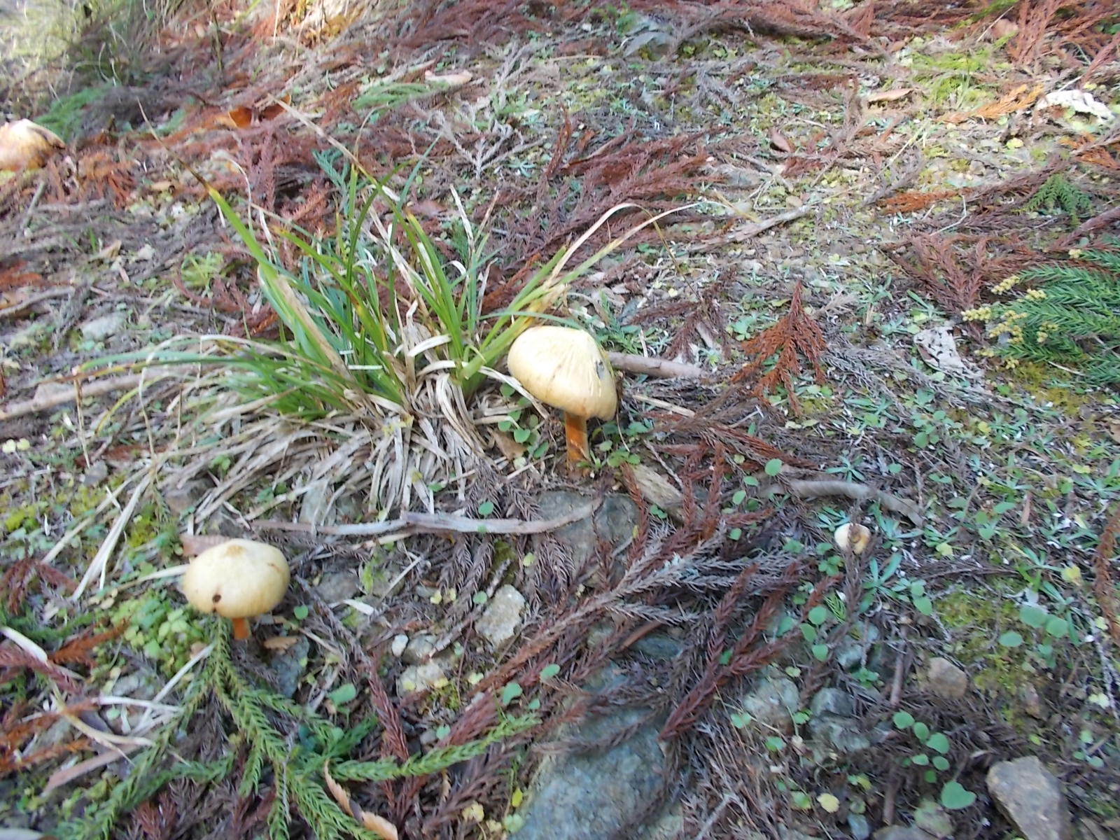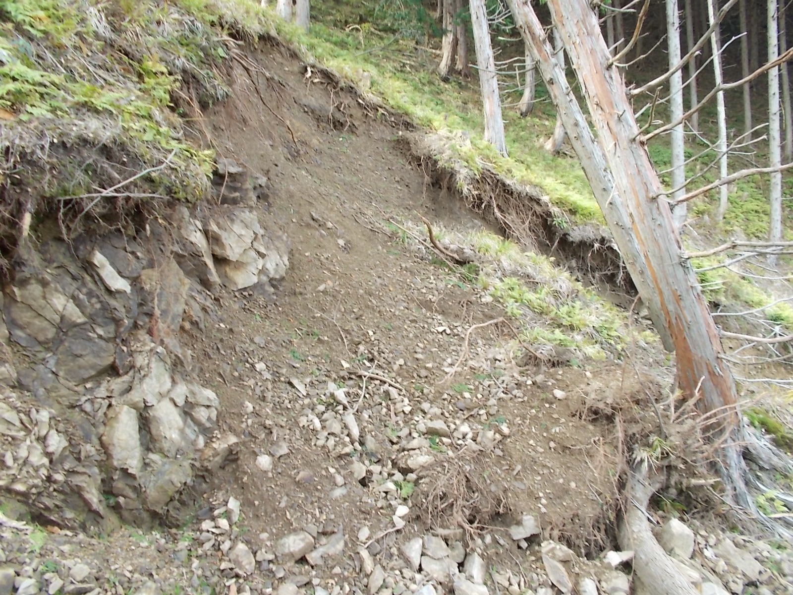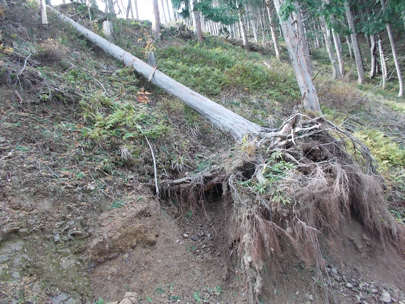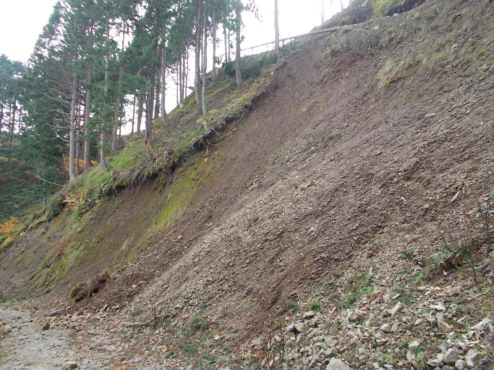 山頂は木々に覆われて見晴らしが悪いので、すぐに下山開始。案内とテープに従い進むと、分岐の案内で強烈な急坂を下り、左手に現れる作業道におりて下の林道に合流、右に進み、後は林道沿いに歩くと二ツ橋に戻って来られた。