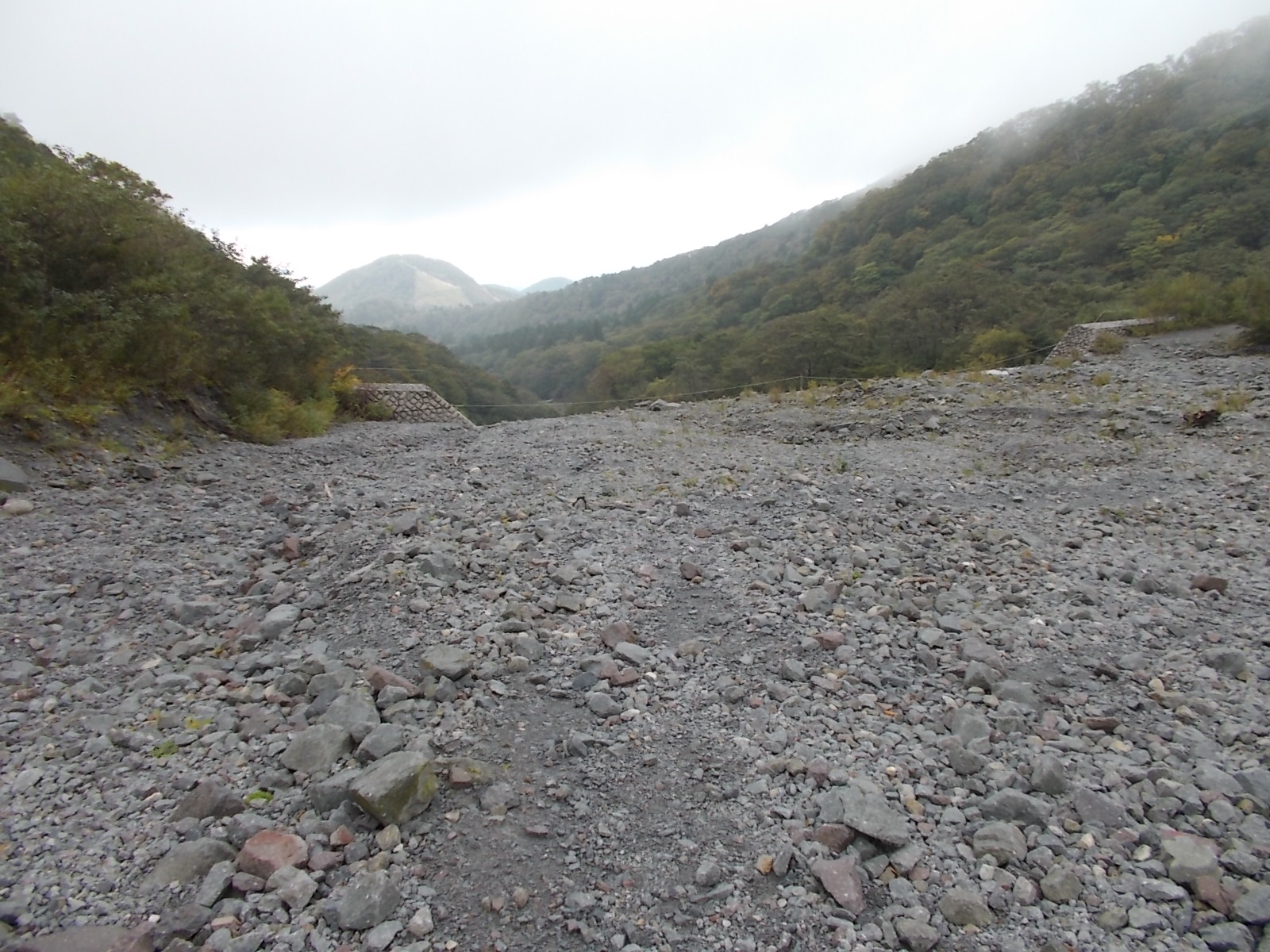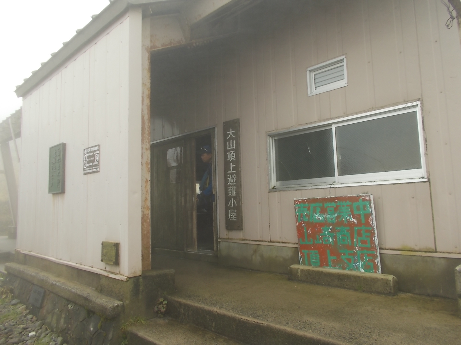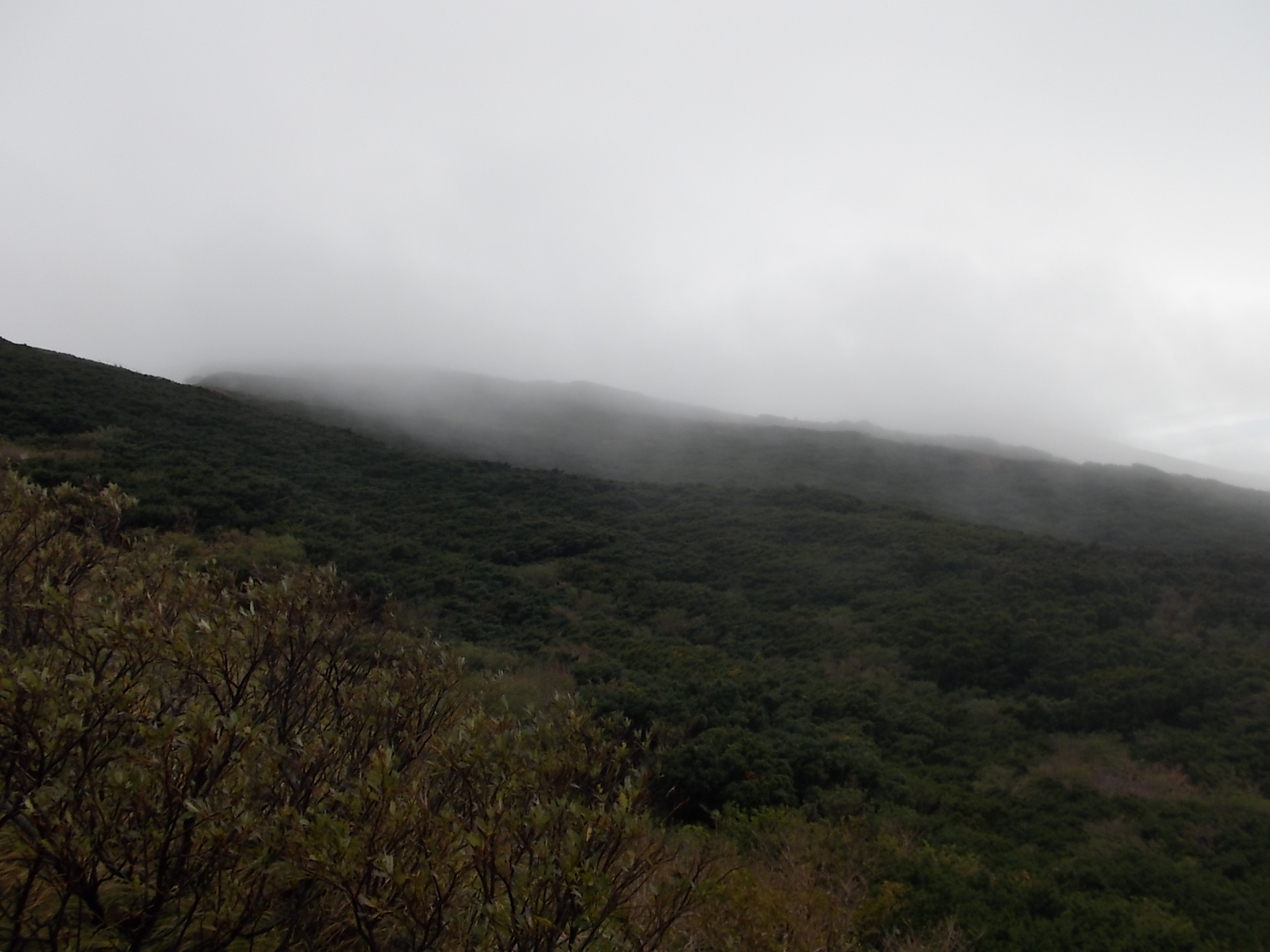 山頂小屋に入って昼食にし、すぐに下山開始。ここからは大粒のガスというか細かい雨になってきているので、カッパ着用。