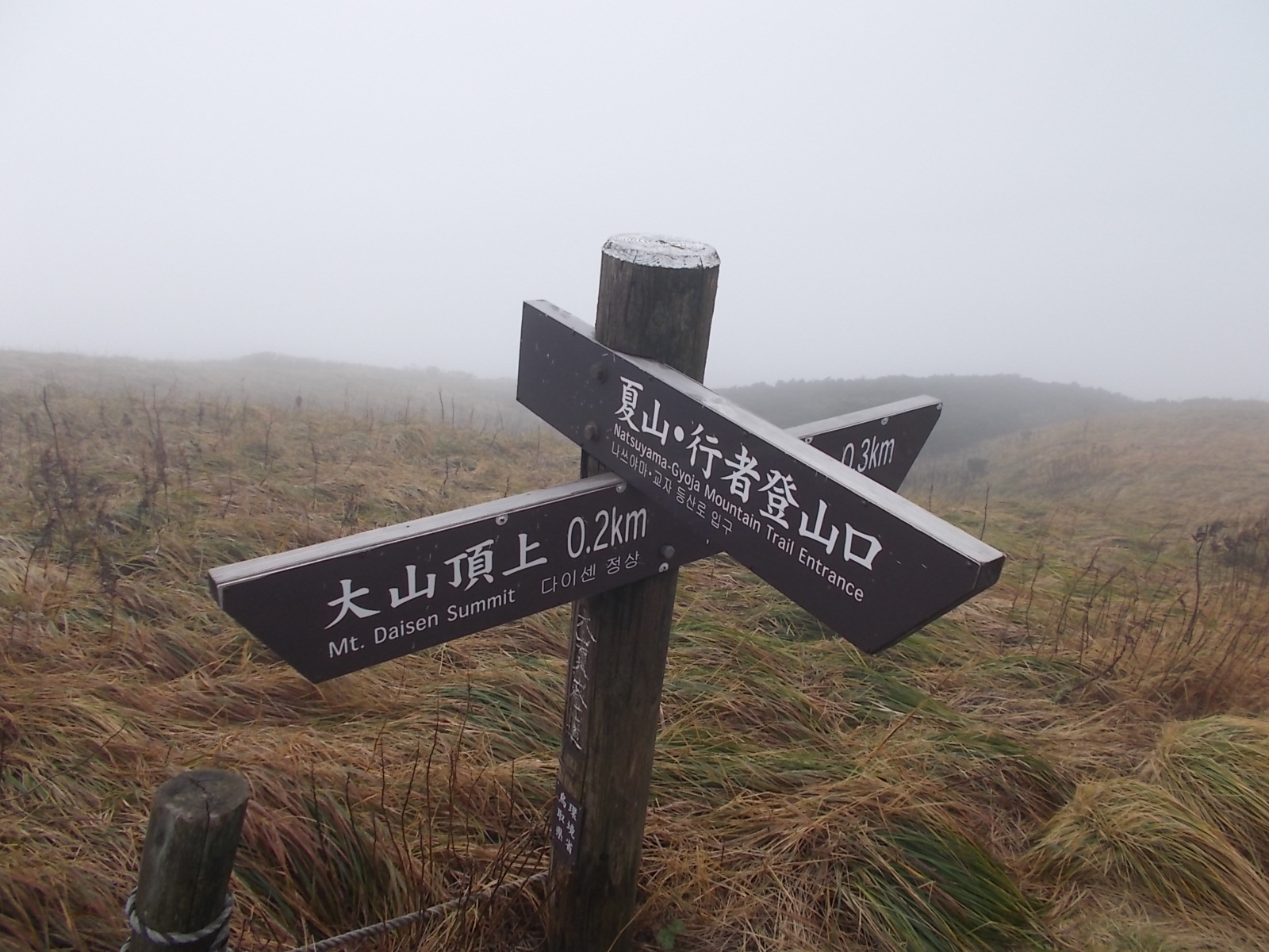 しかし、8合目くらいからさらに濃いガスが出てきて、見えるのは木道と大山キャラボクくらい。