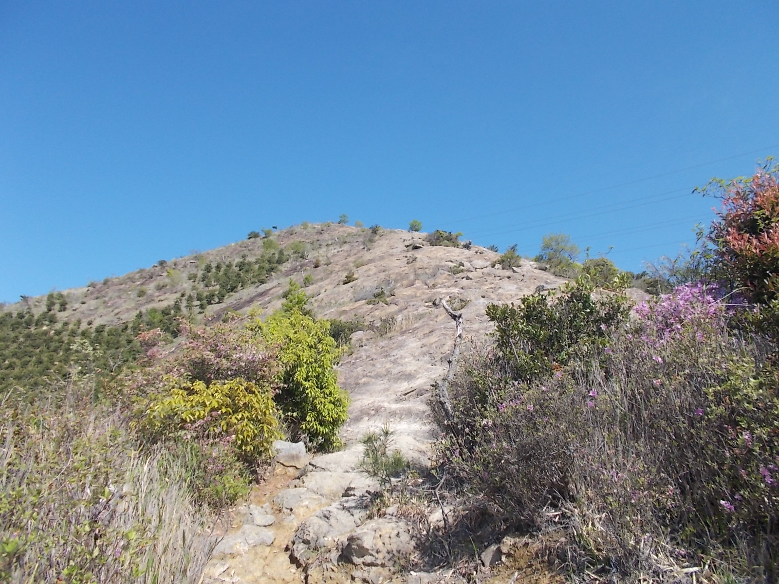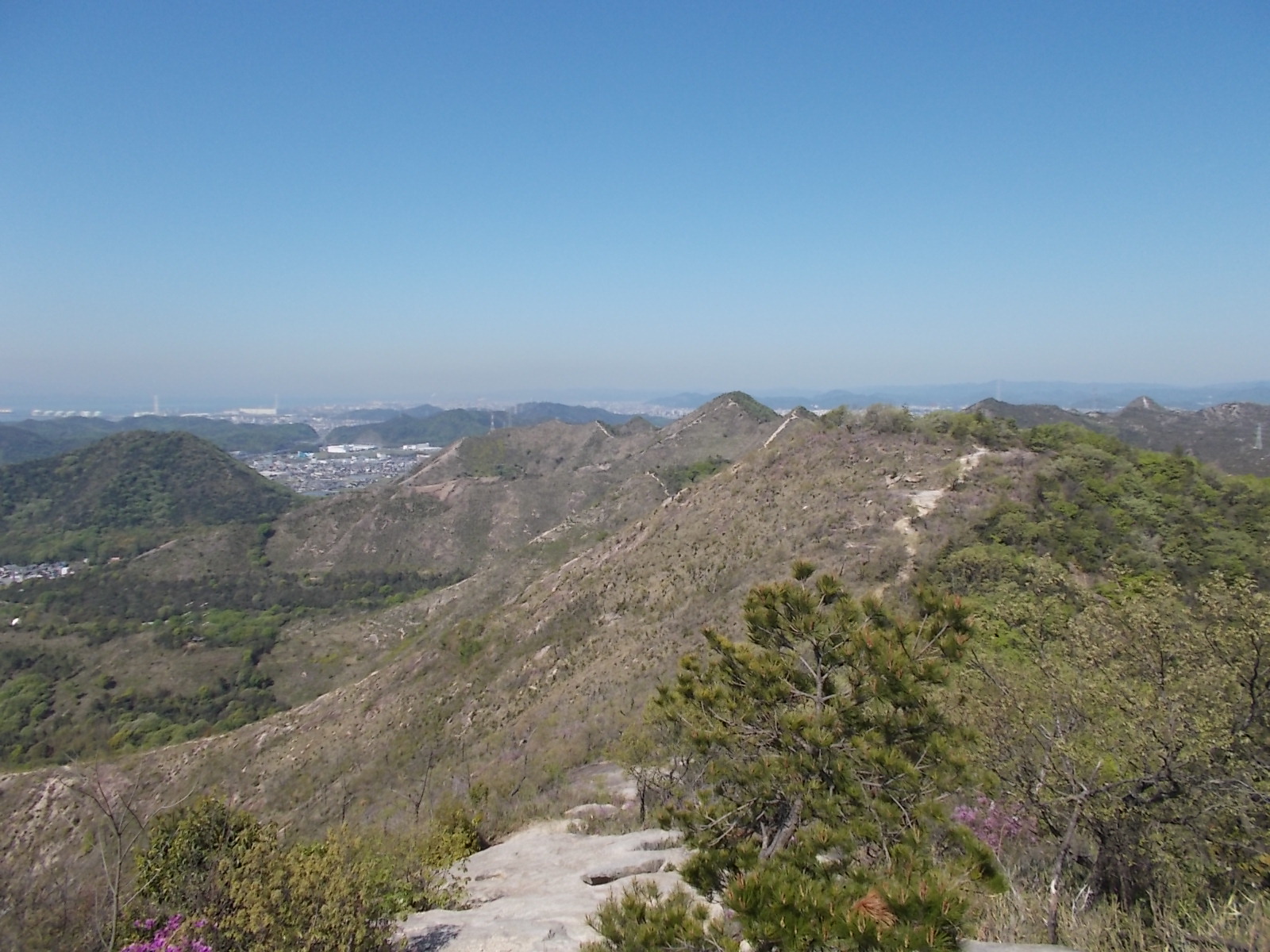 ふるさと兵庫100山No.87 高御位山(たかみくらやま 304m)に行ってきました。 公園墓地の駐車場に車を止めてスタートします。今回は鹿島神社登山口から時計回りのルートにしました。神社の本殿脇にある鳥居が登山口です。少し上ると百間岩に出あい、これを上ります。なかなかハードですが、見晴らしがいいのでがんばれます。展望台、鉄塔を経て鷹巣山につきます。この山はほとんど見晴らしがいいので楽しいです。ただし、ピークへの上り下りはなかなか厳しいので用心して下さい。いくつかのピークを経て高御位山に着きます。ここには高御位神社があります。岩の上からの眺めは最高ですが、たいてい誰かが居るので運がよければ上ってみて下さい。360度がよく見えます。岩の裾を通り、参道を下ると案内板があり、ここが長尾登山口への分岐になります。最初は細い登山道を下っていくと、山頂手前の分岐からのルートに合流し、岩尾根を下っていきます。疲れたら途中にベンチがありますので休憩して下さい。ま、たぶん上りで使うんでしょう。最後に林を抜けると長尾の登山口に出ます。最初の池の横を通り、向かいの池まで進み右折して道なりに進むと駐車場に戻れます。