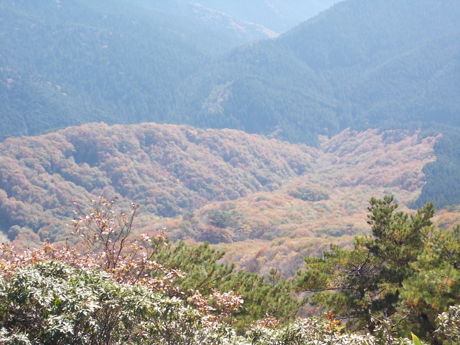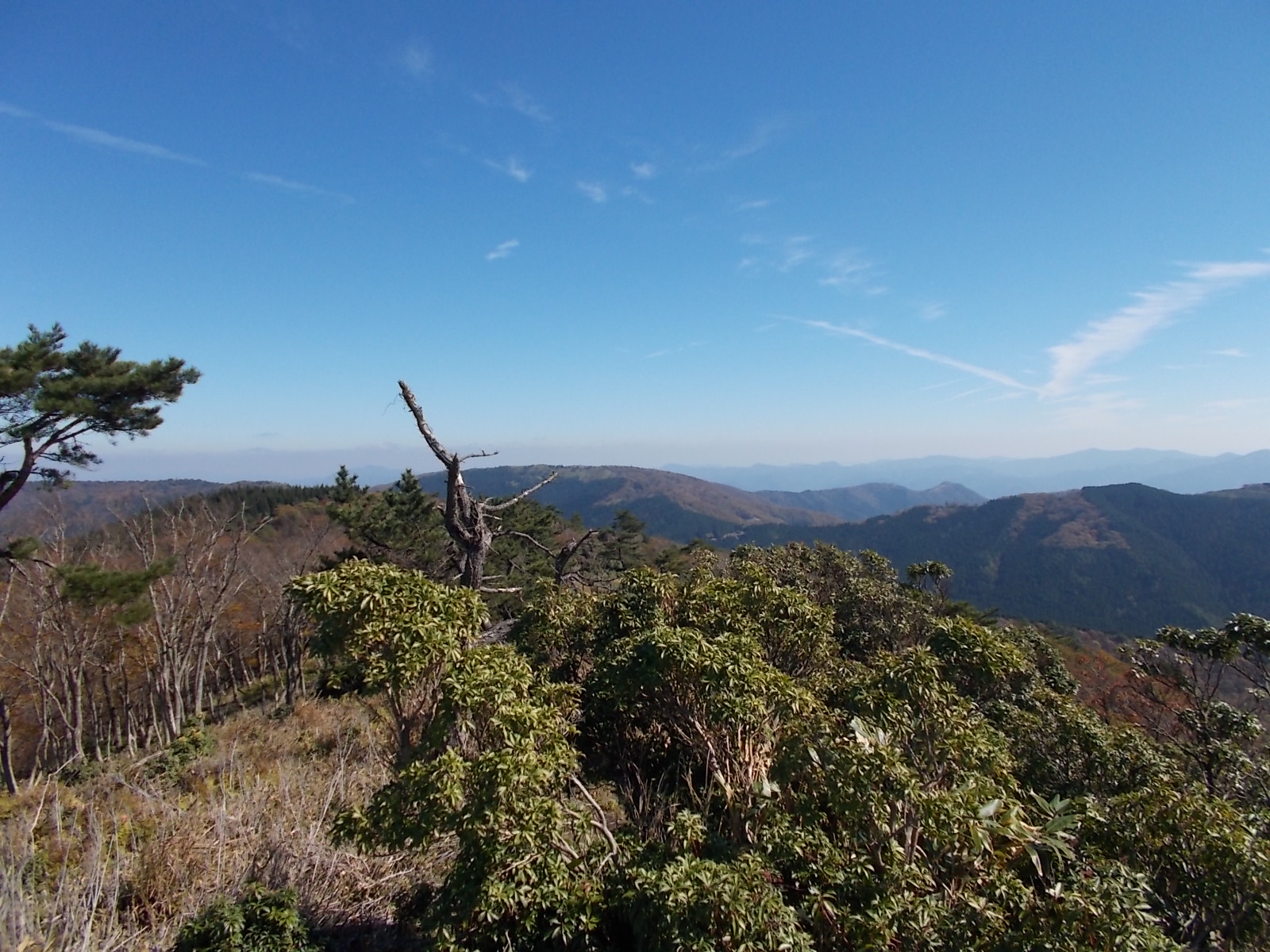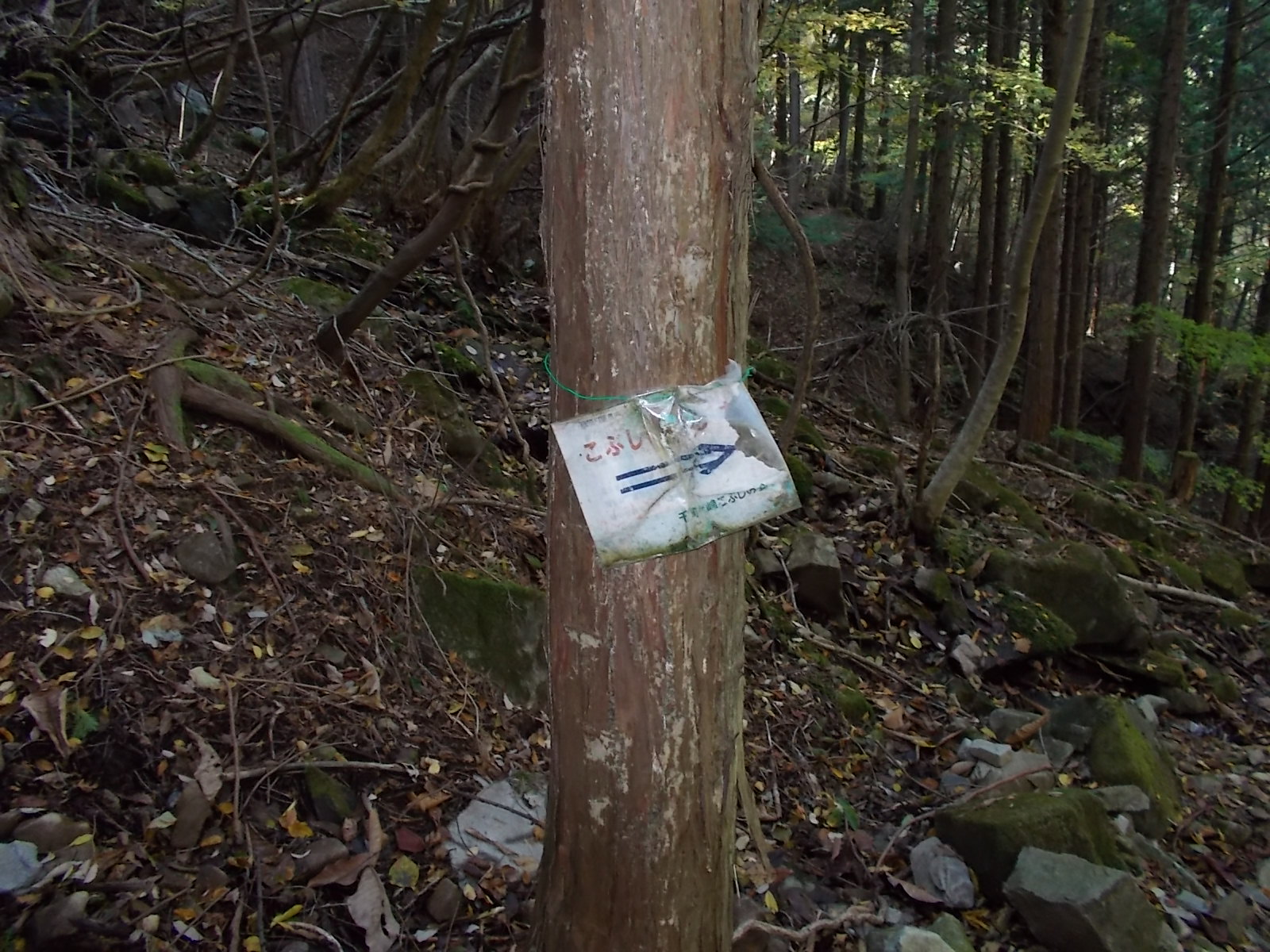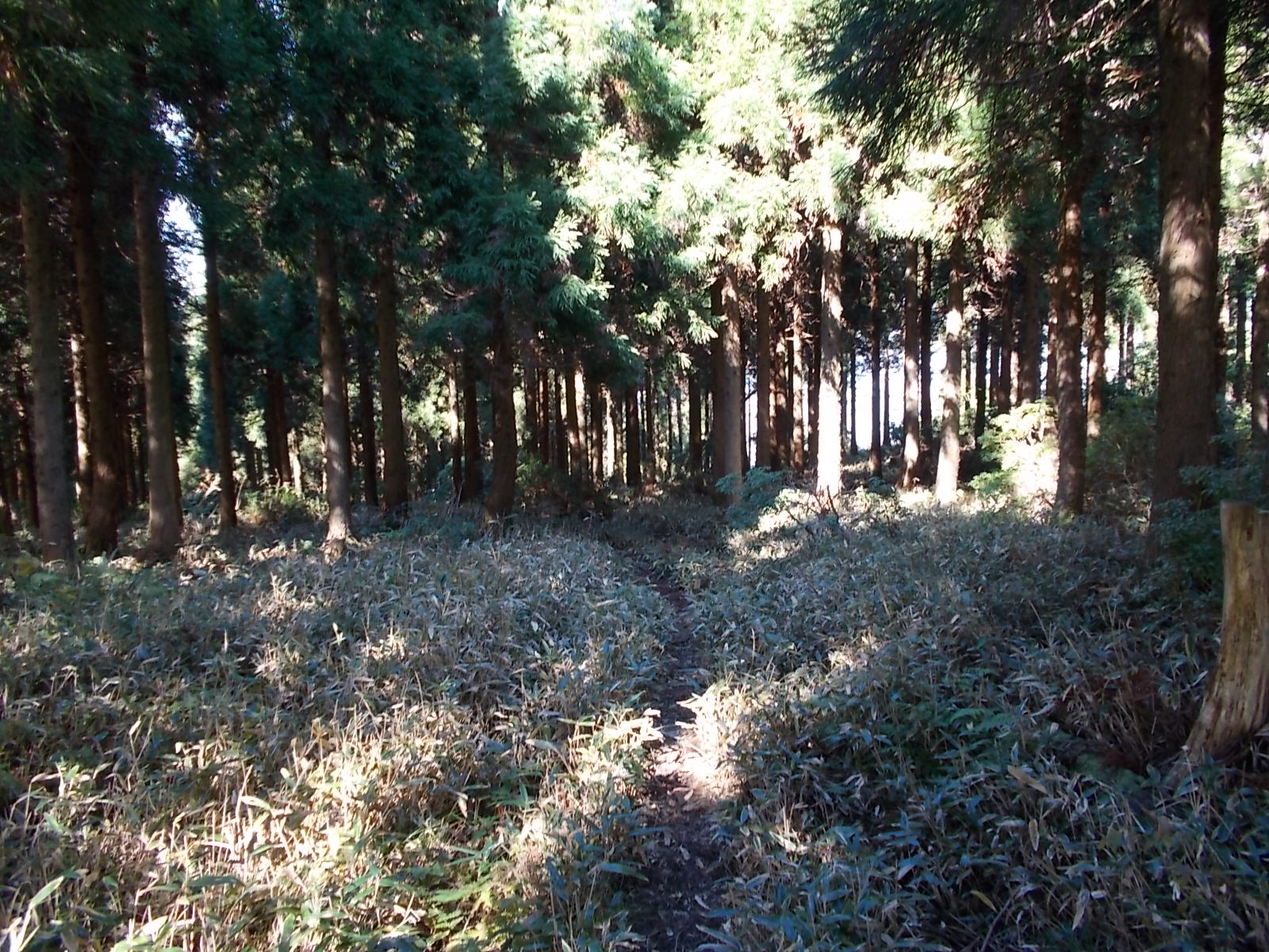 やがて人工林の杉林に入り、それを抜けて自然林に出ます。そこから最後の人工林に入るのですが、この辺りは迷いやすいのでご注意ください。実際私は尾根を目 指して直進し、弘法の池に通じる支尾根に出てしまいました。アセビの林になっていて、無理矢理進めば結果として行けたのですが、不安だったのでいったん 戻って、さがすと左方向にテープが見つかりそちらへ進むと弘法の池の分岐に出ました。ここからさらに進むと山頂に着きます。人工林の中はけっこう登りがきついので、ペース配分にはご注意ください。