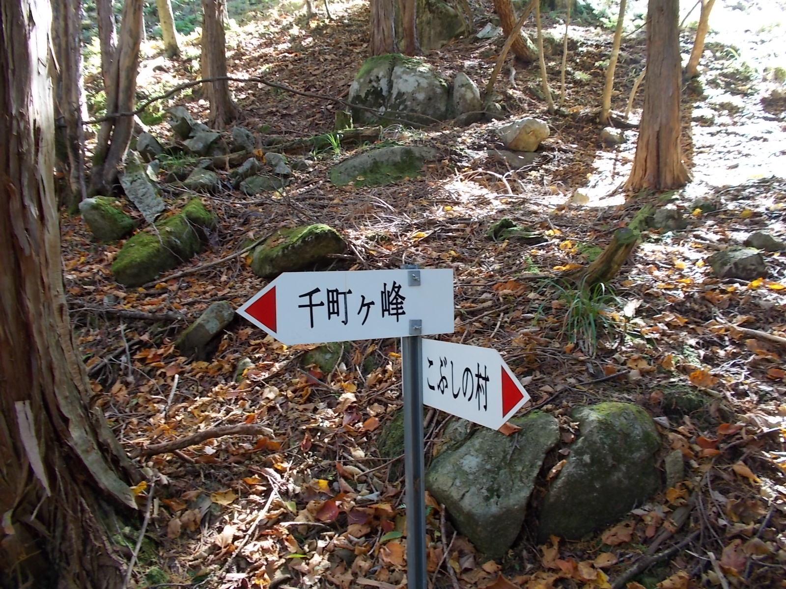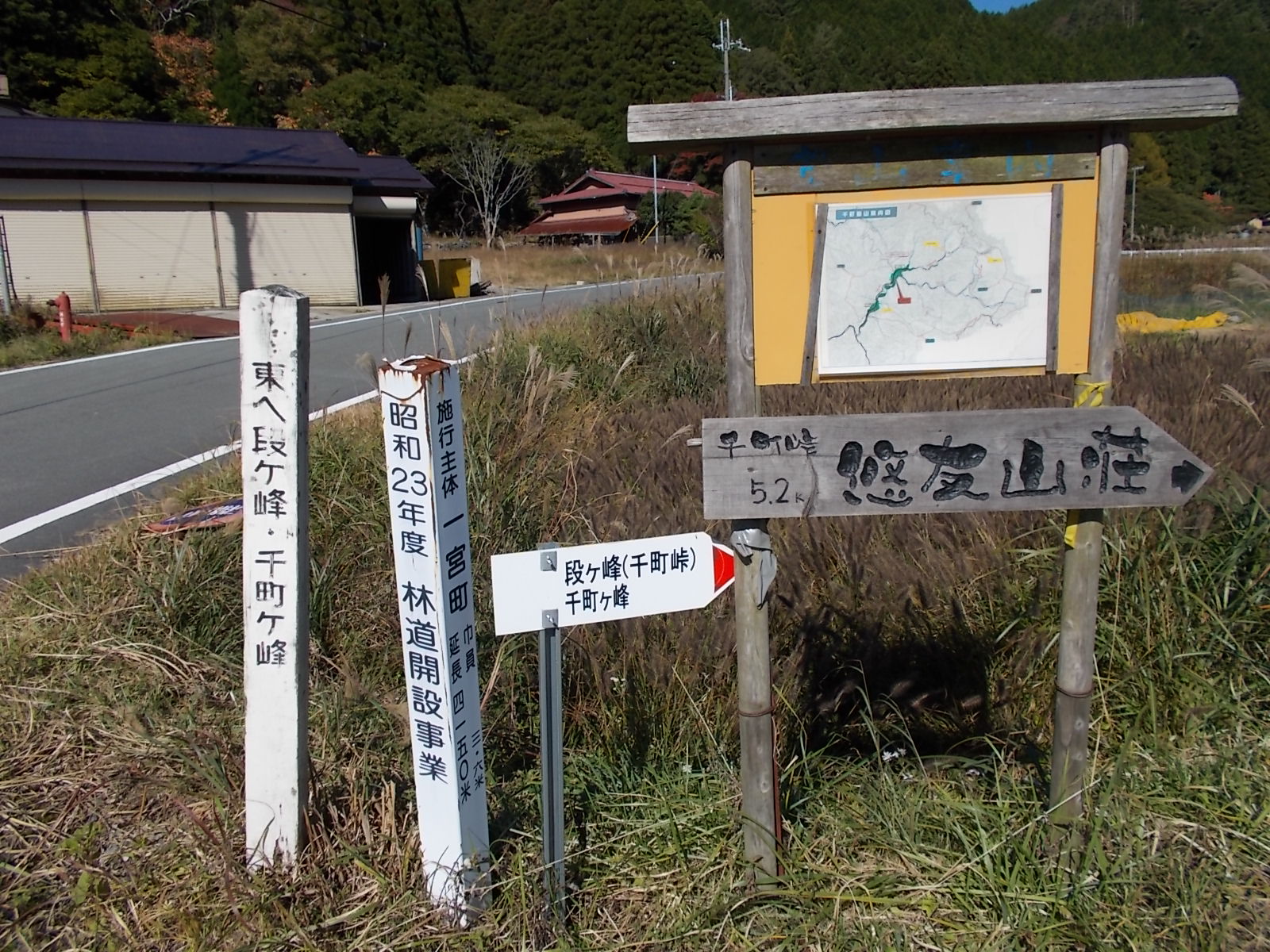 下りは反対方向に進み、アンテナ小屋から荒れた林道を長々と下っていきます。景色もさっぱりであまり面白くはありません。舗装された林道を左へ進み、上千町に出ます。ここから大段山にいくつもりでしたが、長い林道下りでくたびれたので中止し、駐車場まで舗装路を戻りました。元気な方は大段山に挑戦してください。また、ここを起点に、千町が峰、段ヶ峰、杉山、笠杉山、大段山の5座を巡るルートもあります。一通り50山を終えたら、挑戦してみたいと思います。