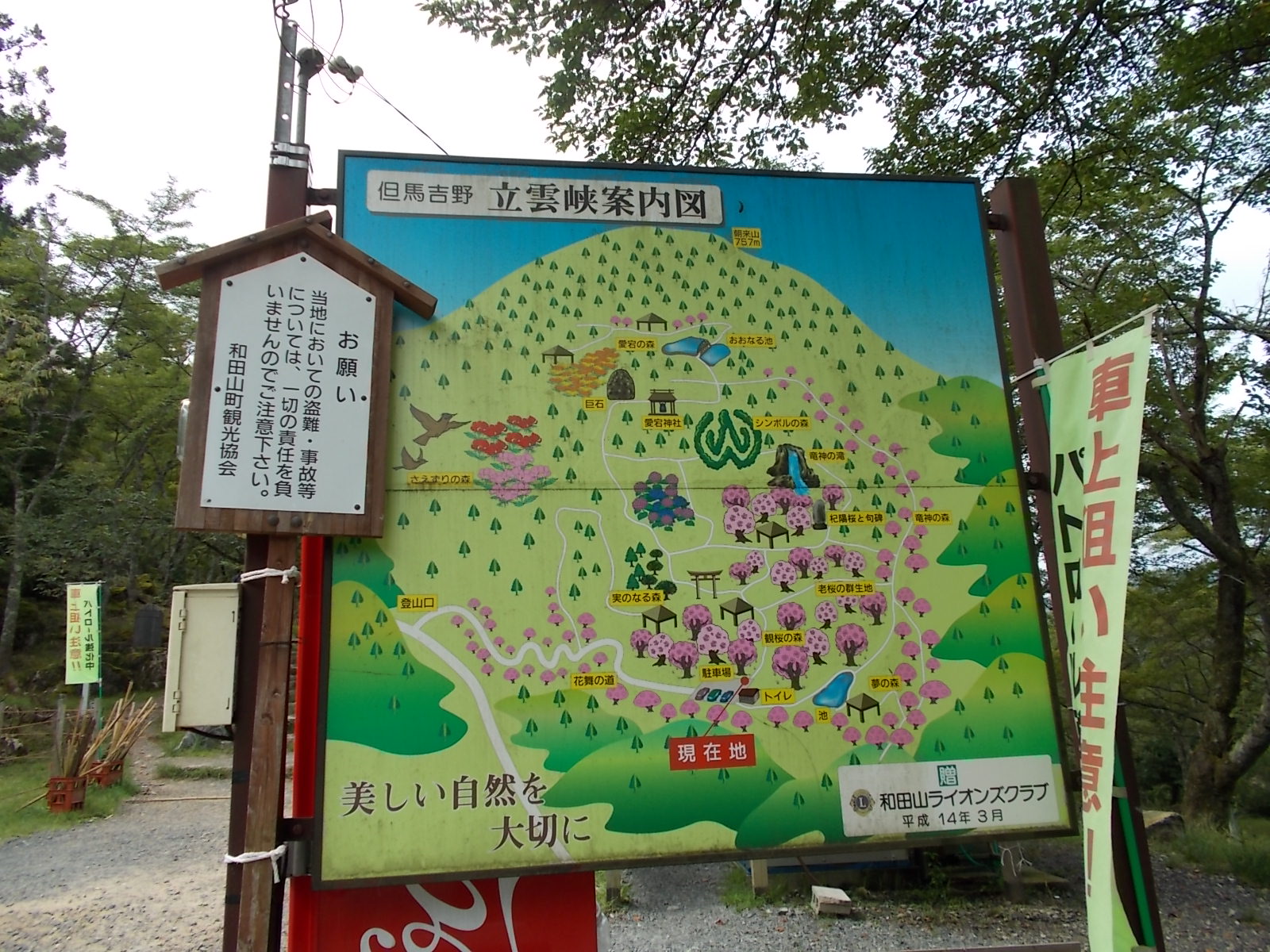 この山は春の桜で有名な立雲峡のあるところなんですが、竹田城跡の国道を挟んで向かいにある山っていう方がよく分かってもらえるかもしれません。立雲峡の駐車場に着くと、車とバイクが数台止まっていました。