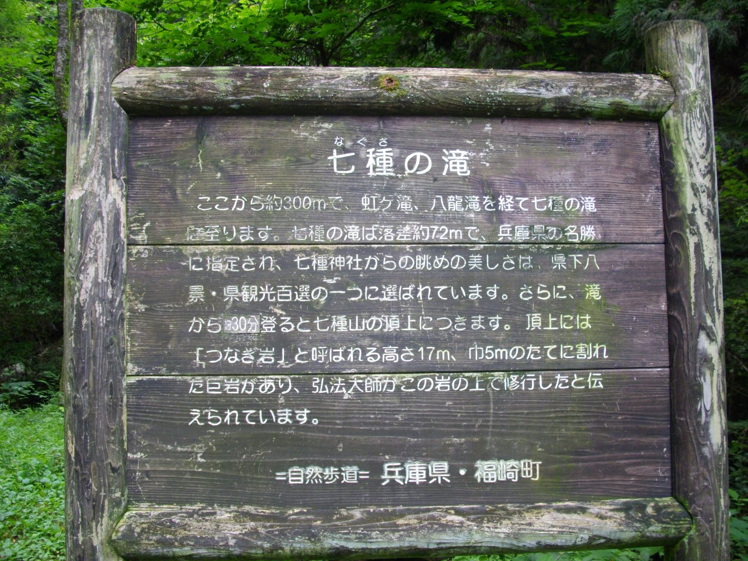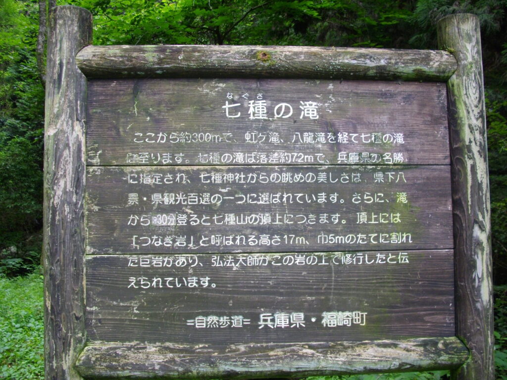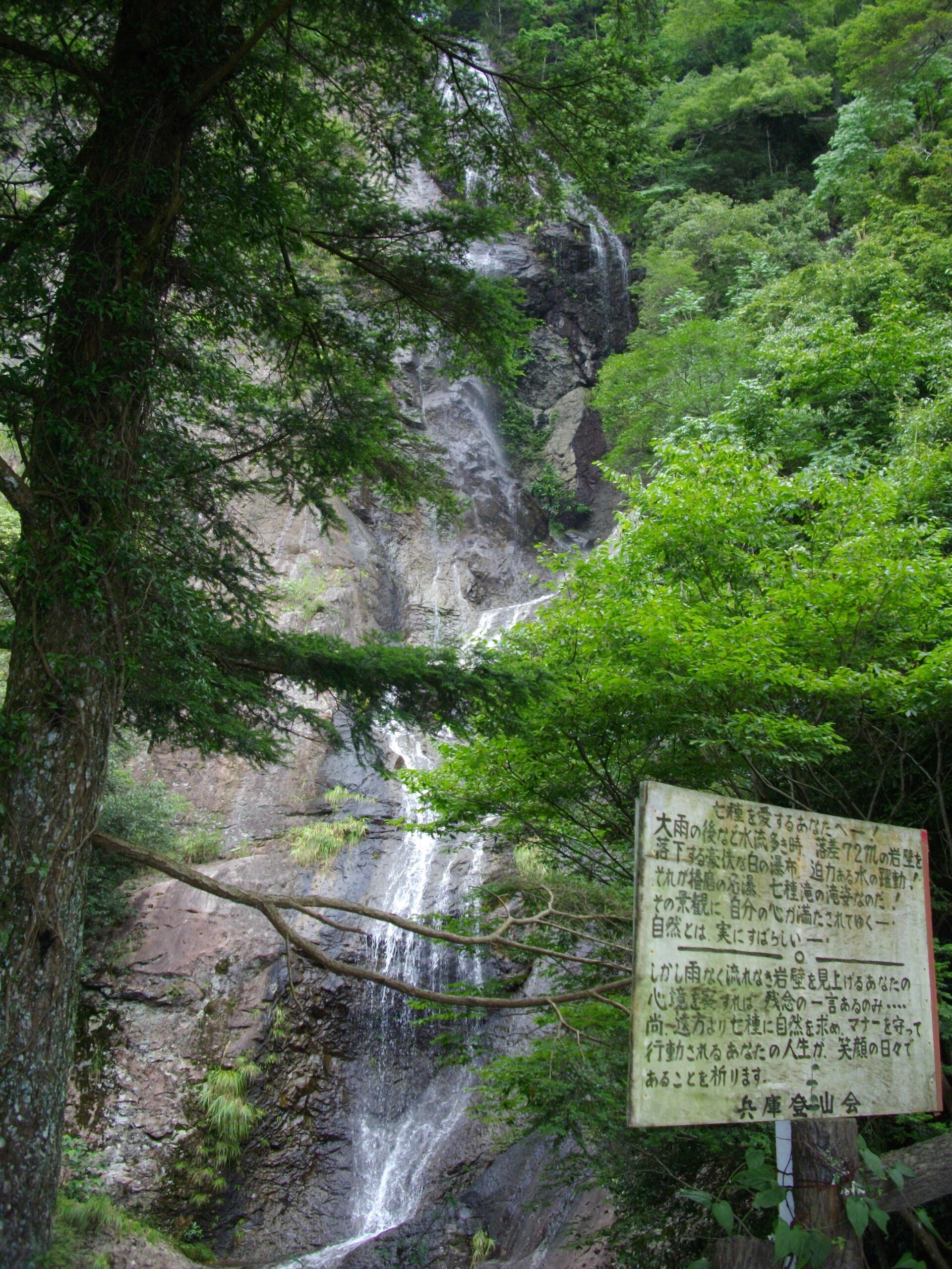 七種の滝 2009年8月15日 最終更新日時 : 2024年2月21日 hotaru3福崎町にある七種の滝に行ってきました。車は、福崎町青少年野外活動センターに置きました。平日なら少し先の山門までは行けそうです。福崎町青少年野外活動センターのそばにある池に鴨のファミリーがいました。雌滝の看板です。たぶんこれが雌滝ではないでしょうか。途中にある二本杉です。これを見て、八墓村の話が思い出されました。しばらく八墓村の話で盛り上がりました。滝のような沢のような虹ヶ滝です。沢沿いに登っていきます。意外に距離があって、最後はかなりの急登になります。七種の滝です。落差72mです。もう少し水量があれば、なかなか迫力がありそうです。もう少し写真をお楽しみください。\ 最新情報をチェック /