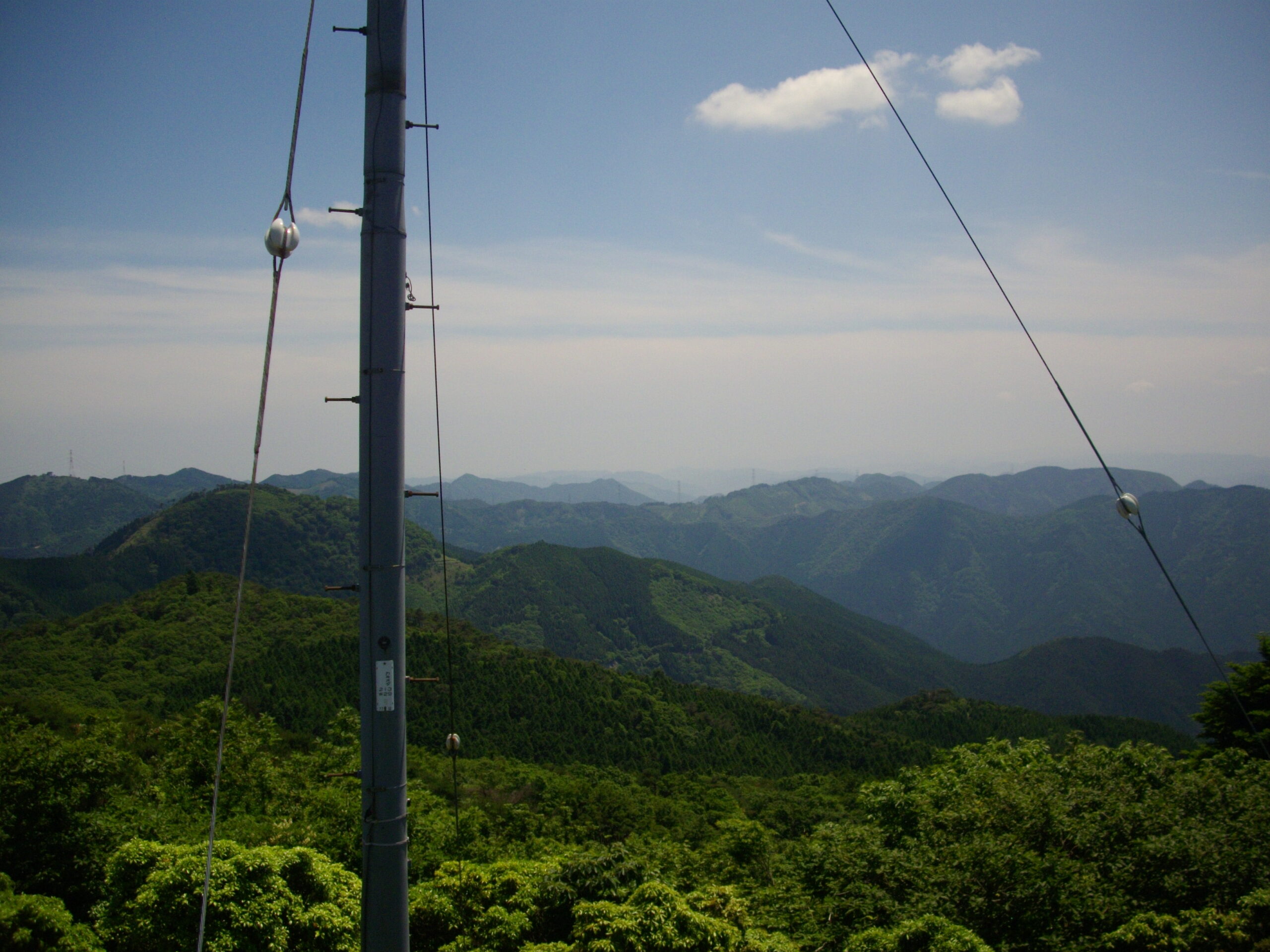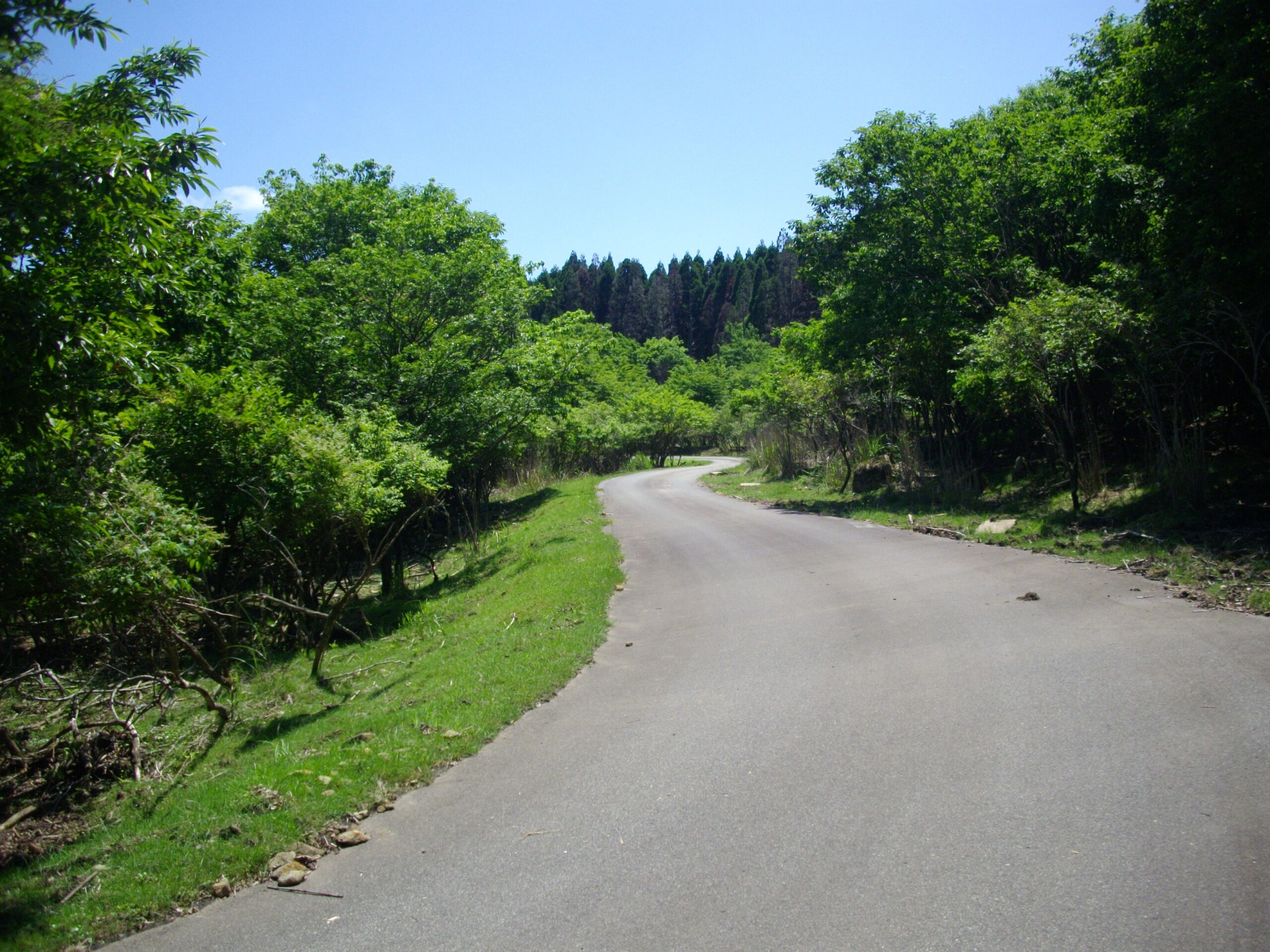 ↑ 登山道である管理道路の途中からみた暁晴山の頂上です。