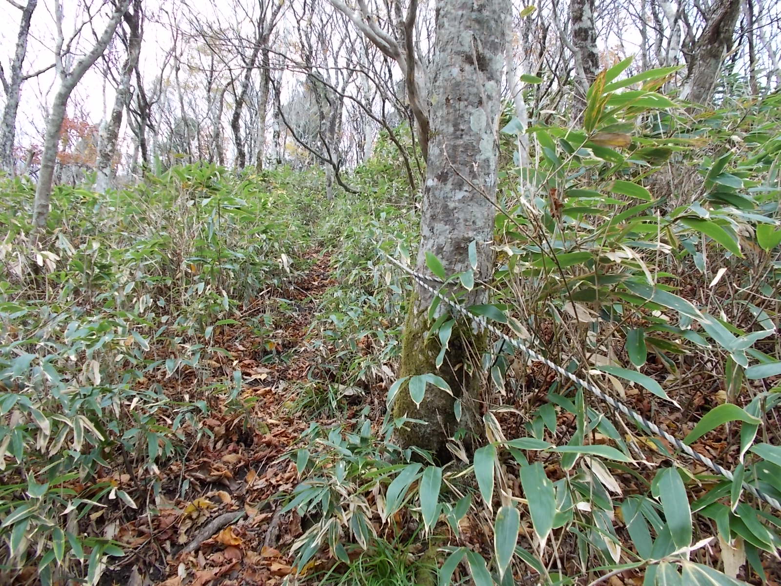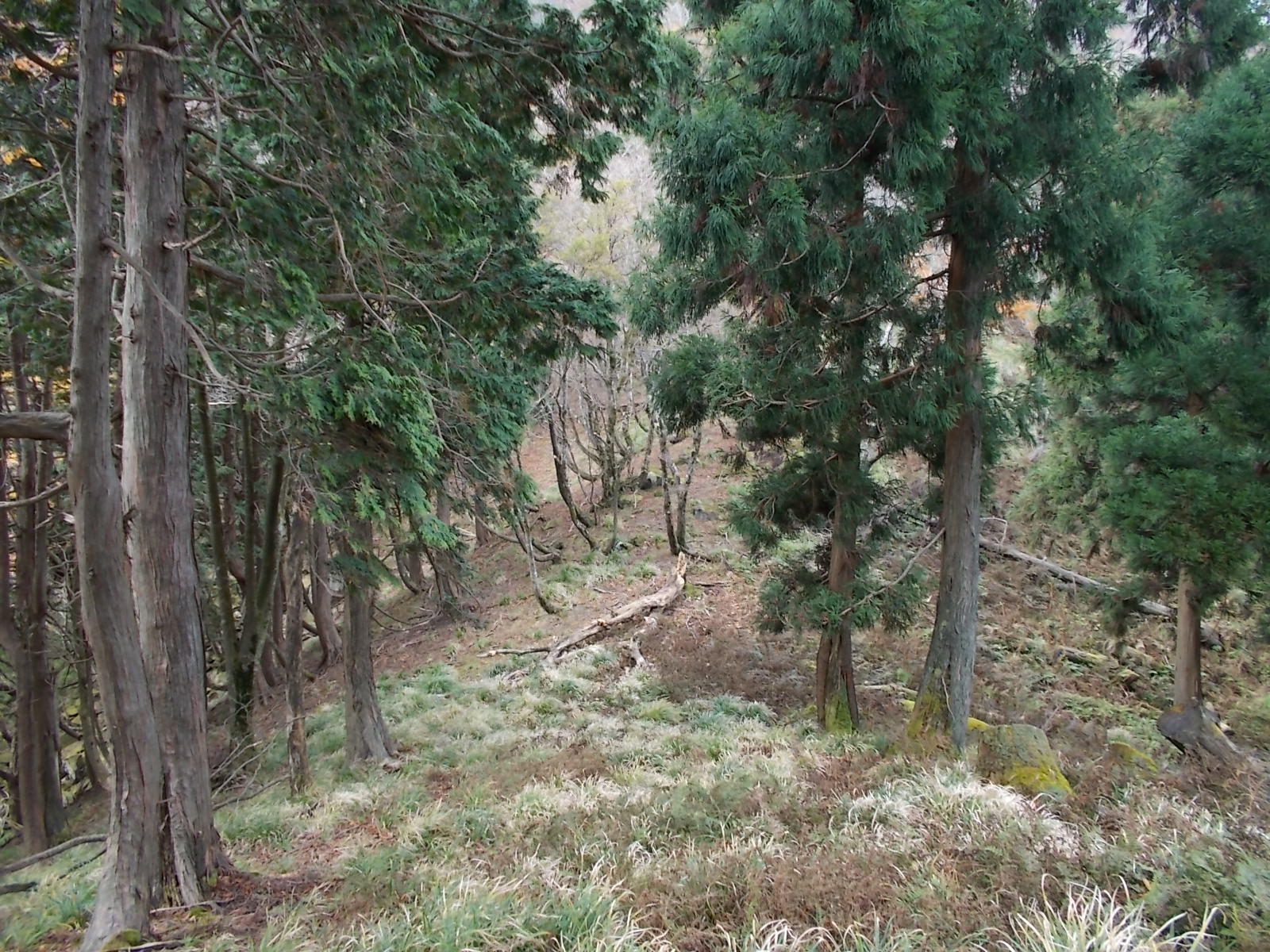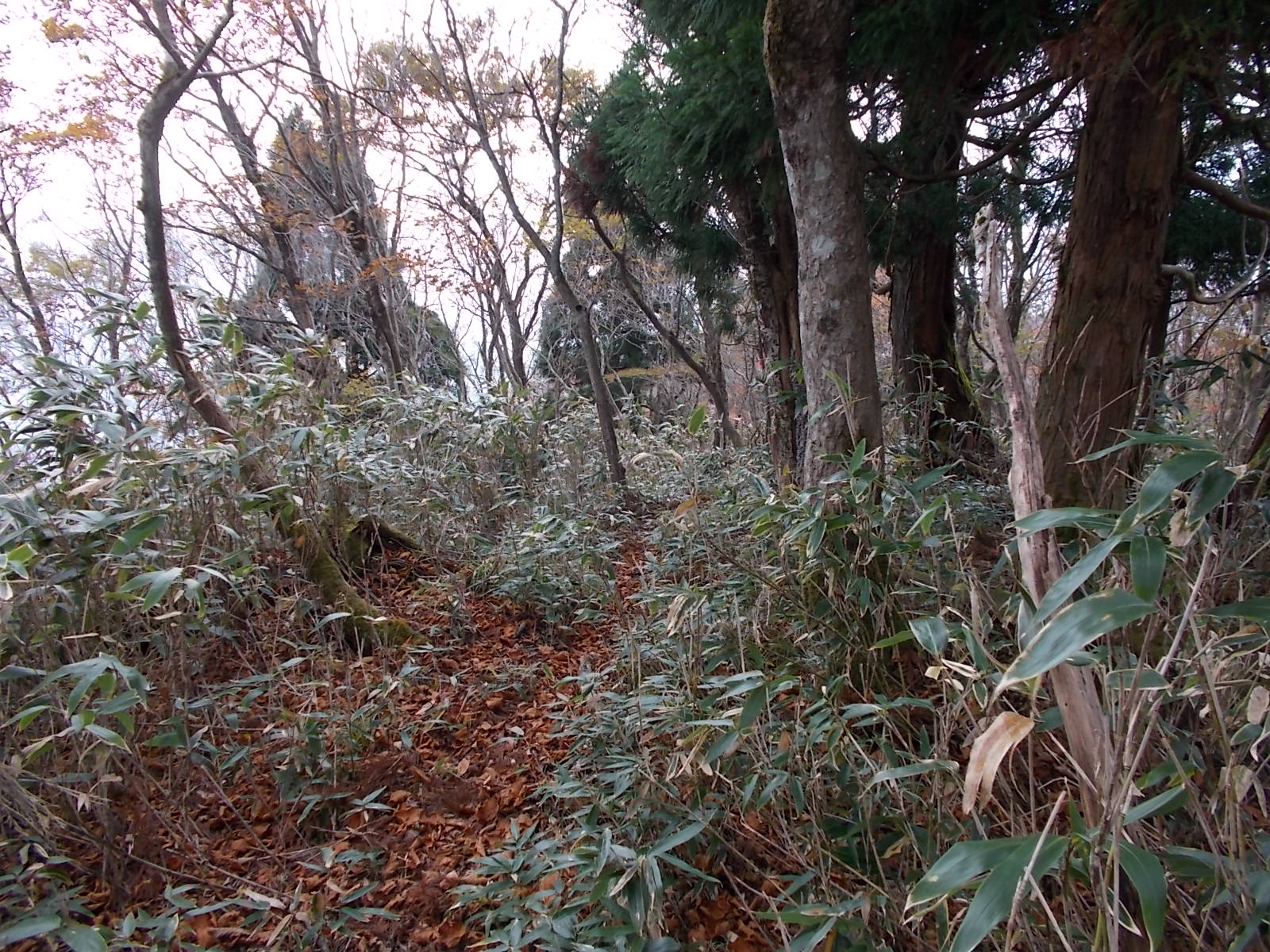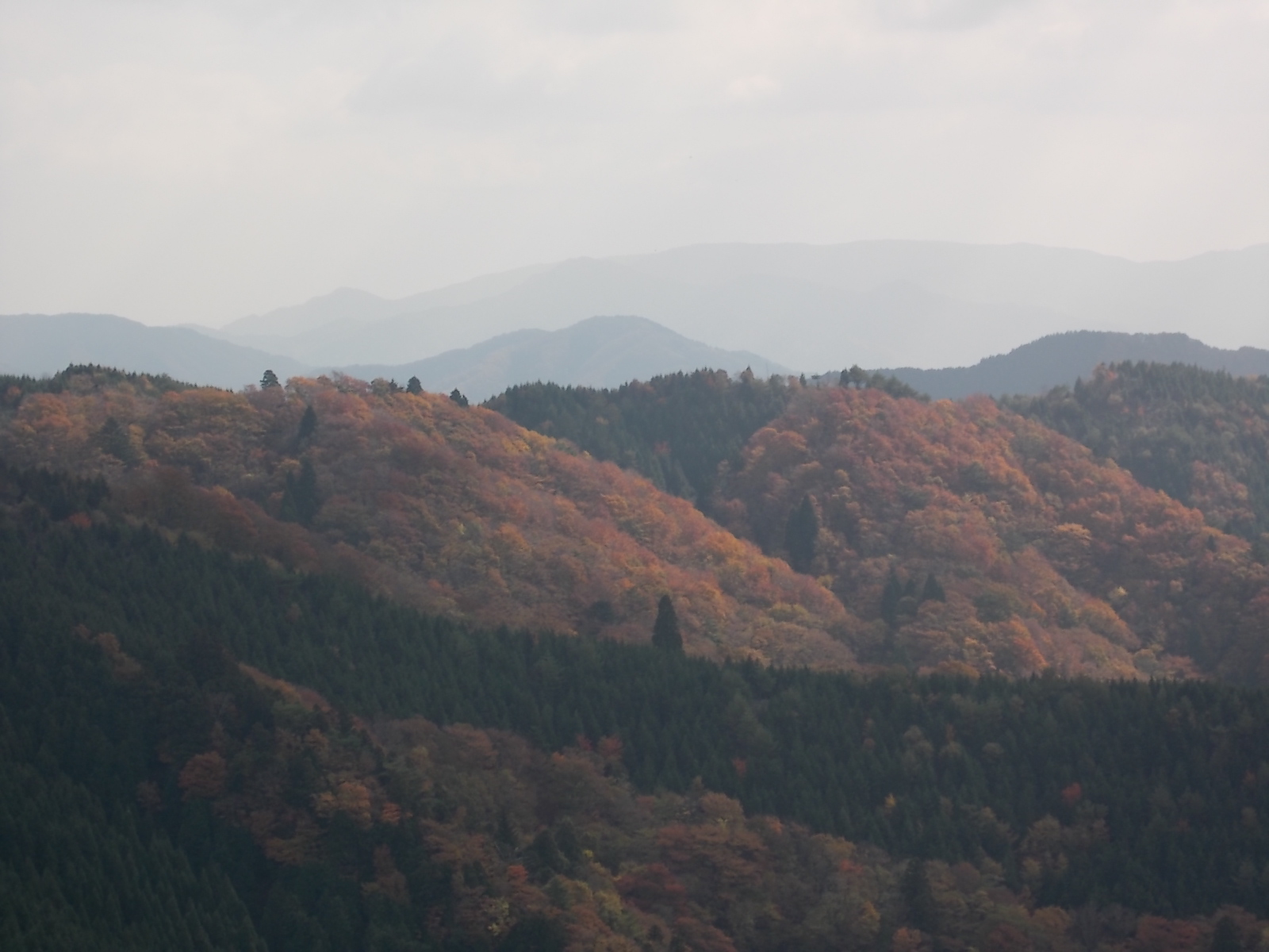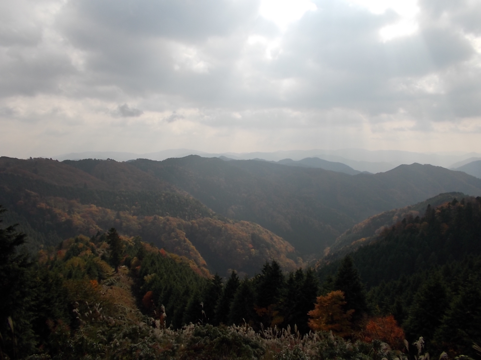 登山口からいきなりきつい登りが始まり、その後も延々急登がつづく厳しい山でしたが、途中の伐採地からの眺めはとても良かったです。山頂も東南方面は開けていて、それなりに見渡せるんですが、あいにく曇りがちだったので遠くまではよく見えませんでした。山頂の紅葉はすでに終わっていました。