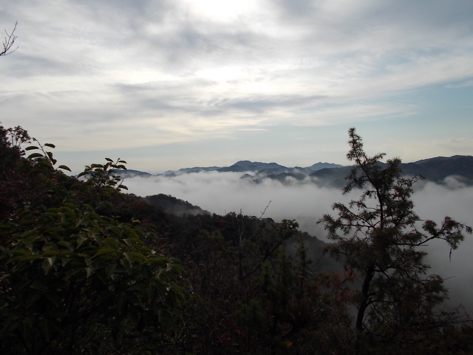 駐車場から進入路を戻り、まず善防山へ。狭く草だらけの登山道ですが、途中から周りがよく見えるようになります。今回は偶然にも雲海を見ることができました。