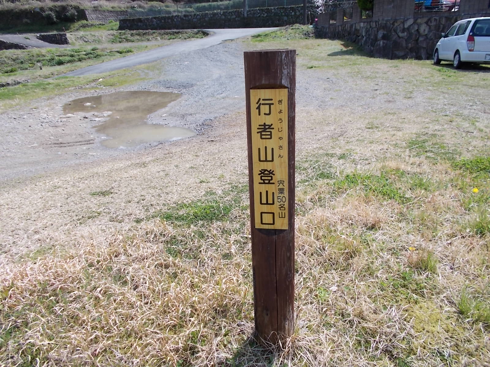 中国道山崎ICからR29を北上し、安曇橋を右折して県道6号に入る。いぎす行者山登山口の石柱を見たらそのまま進み、約100m先の駐車場に駐める。登山口の標柱がある。