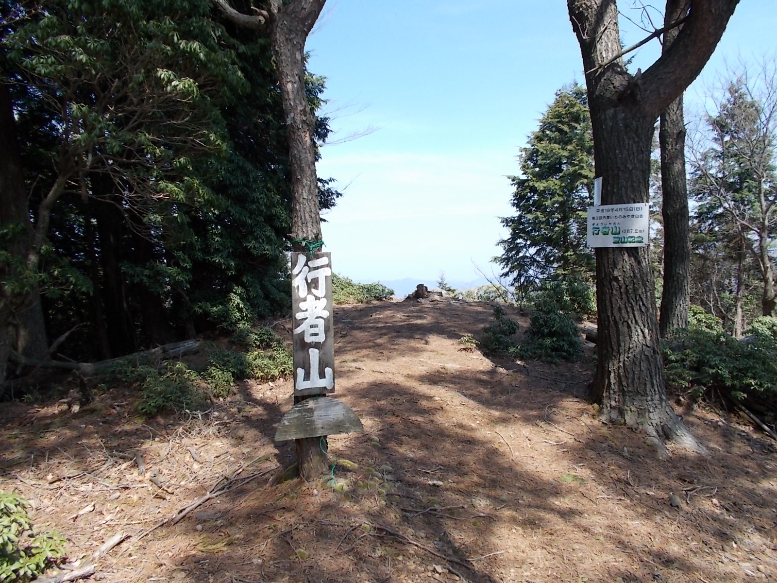 ↑ 行者山(ぎょうじゃさん)の山頂の標柱