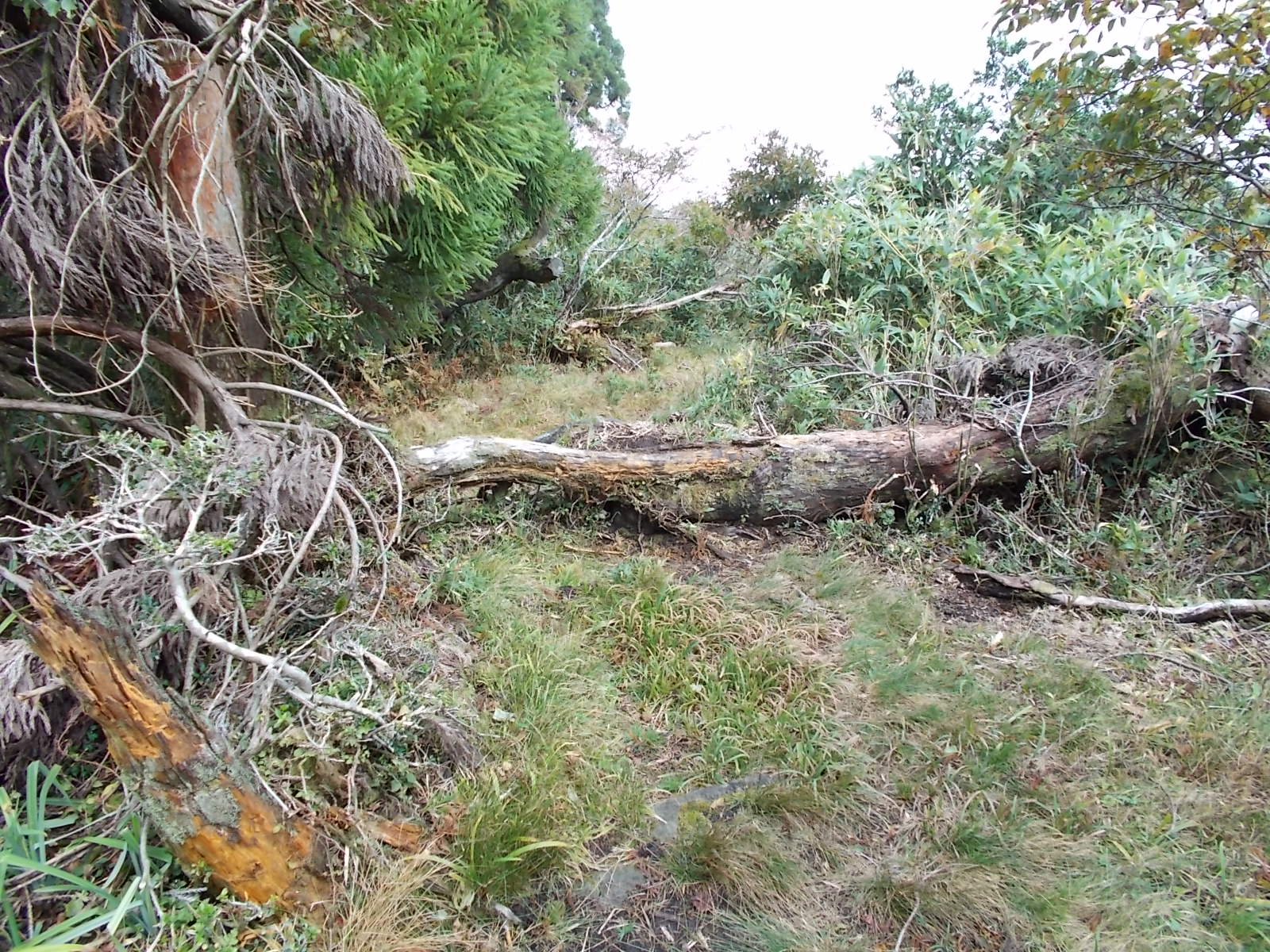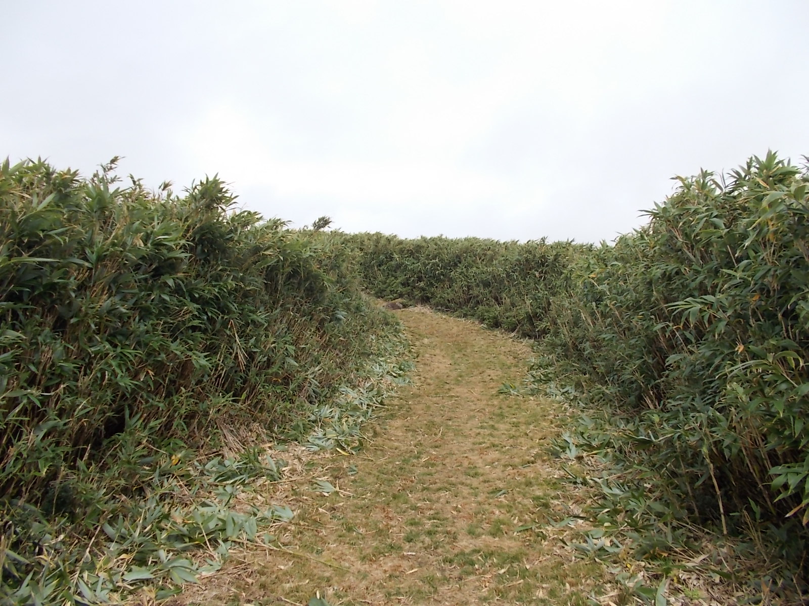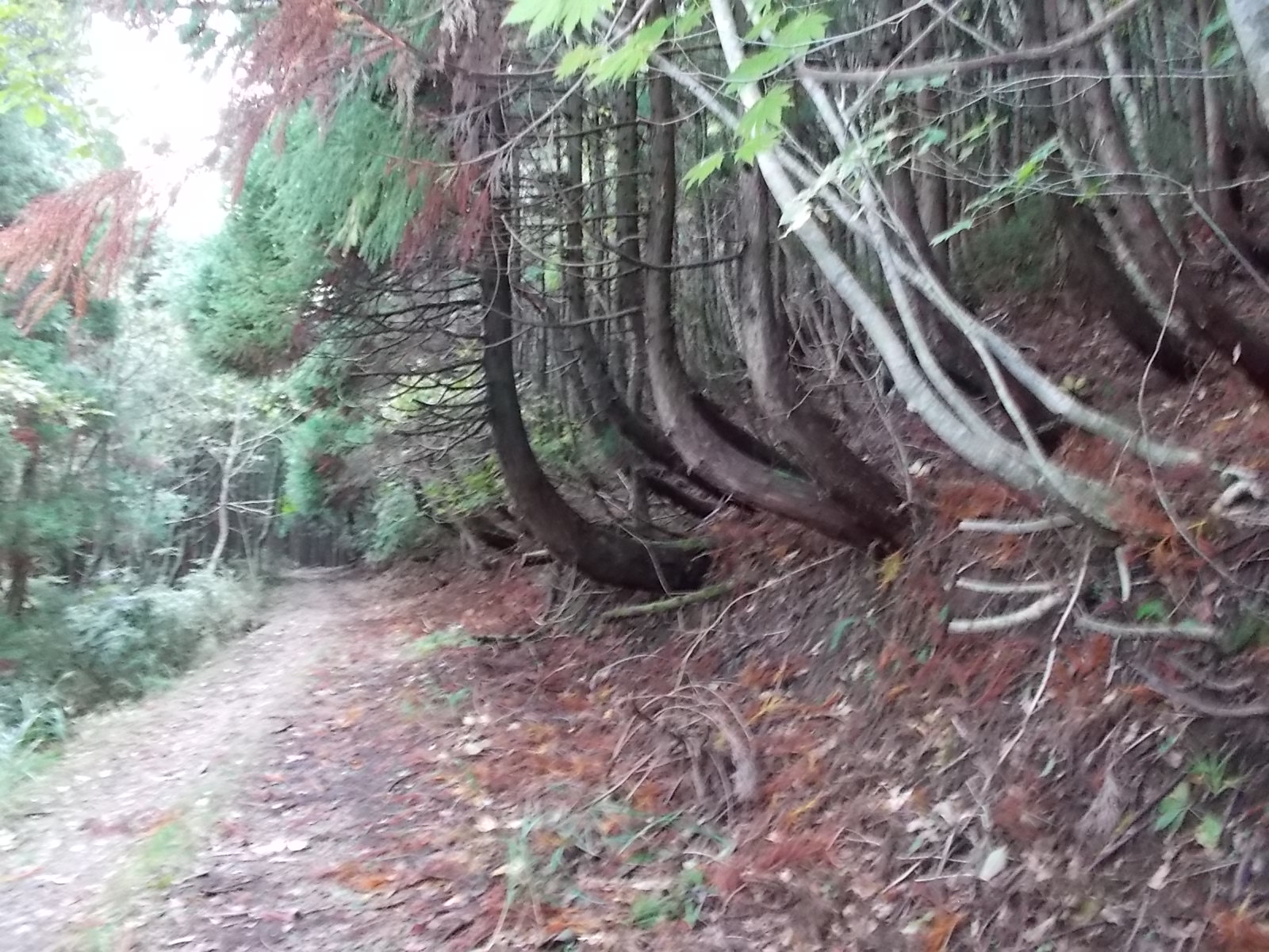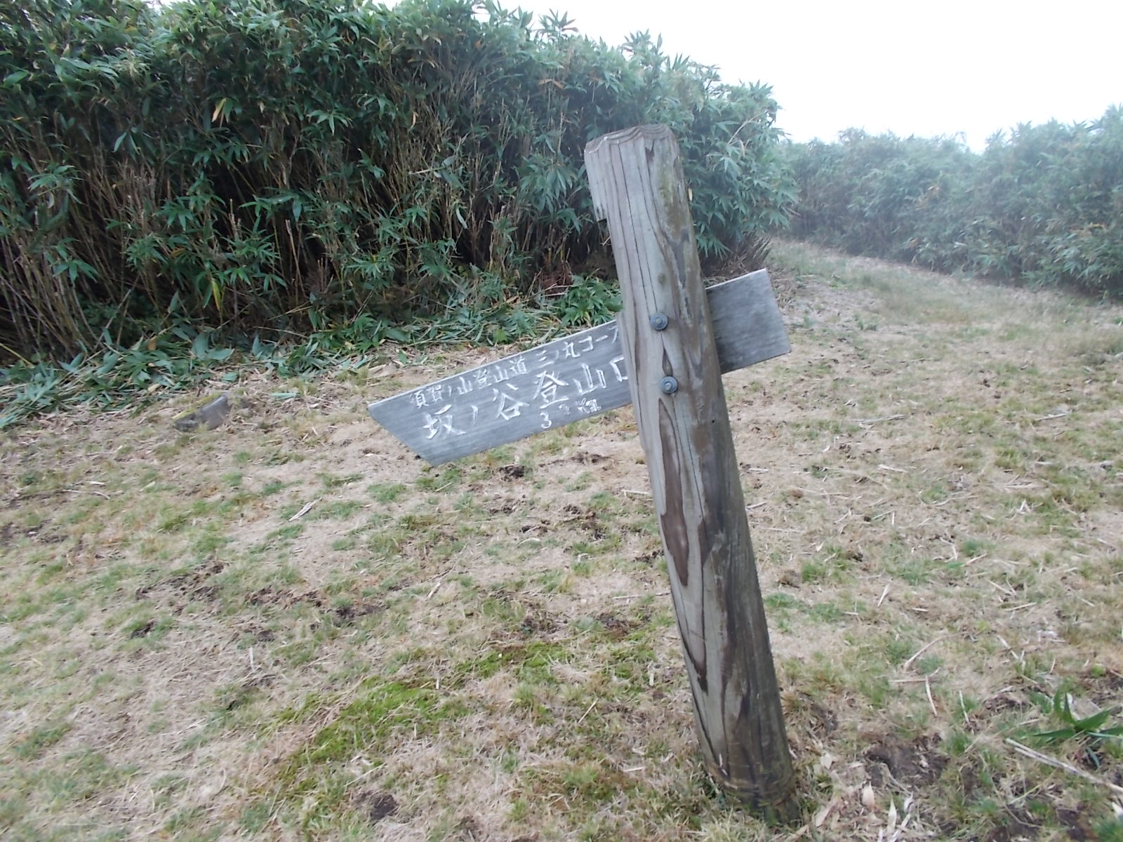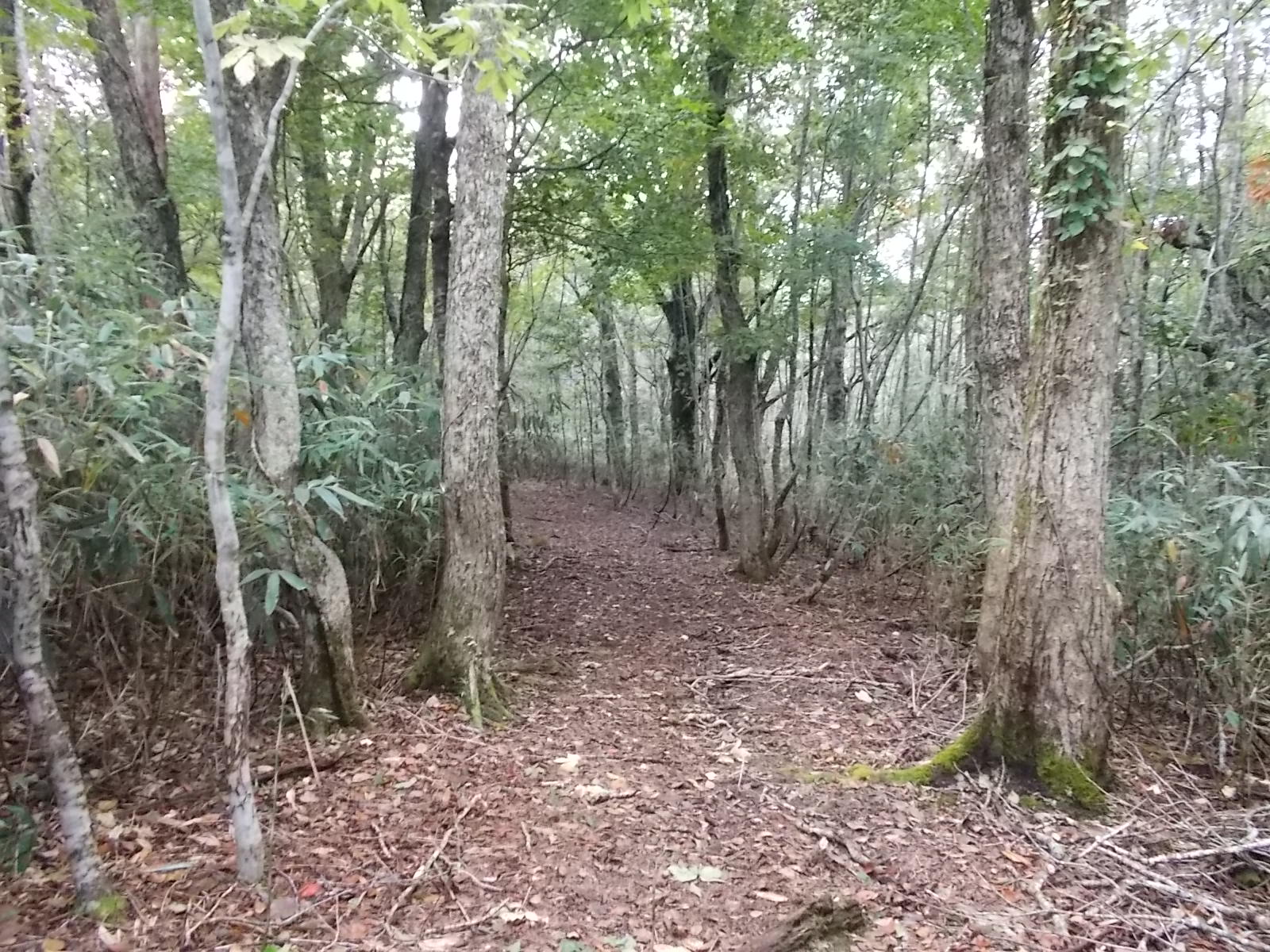 国道から林道に入ると最初は舗装されているものの大きな穴だらけで、その後は荒れた石だらけの林道を約5Kmほど走ります。乗用車ではきついでしょう。谷に落ちると大変なので、時速10Kmくらいで慎重に走ります。登山口を示す分岐で駐車して、左の坂の谷登山口へ。ここからはとてもゆるやかで快適なハイキングが続きます。広くて整備された登山道です。最初は人工林なんですが途中から自然林に変わり、このあたりから雰囲気が良くなります。 ただ、木が多くて周辺は見渡せず、木が少なくなっても笹が生い茂っているので景観はさっぱりです。