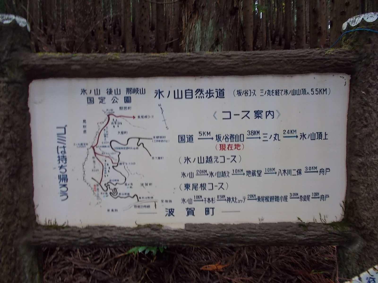 駐車場 → (林道) → 坂の谷登山口 → (坂の谷コース) → コース合流点 → 三の丸 → 氷ノ山 → 三の丸 → コース合流点 → (殿下コース) → 殿下登山口 → (林道) → 逆水の滝 → 駐車場