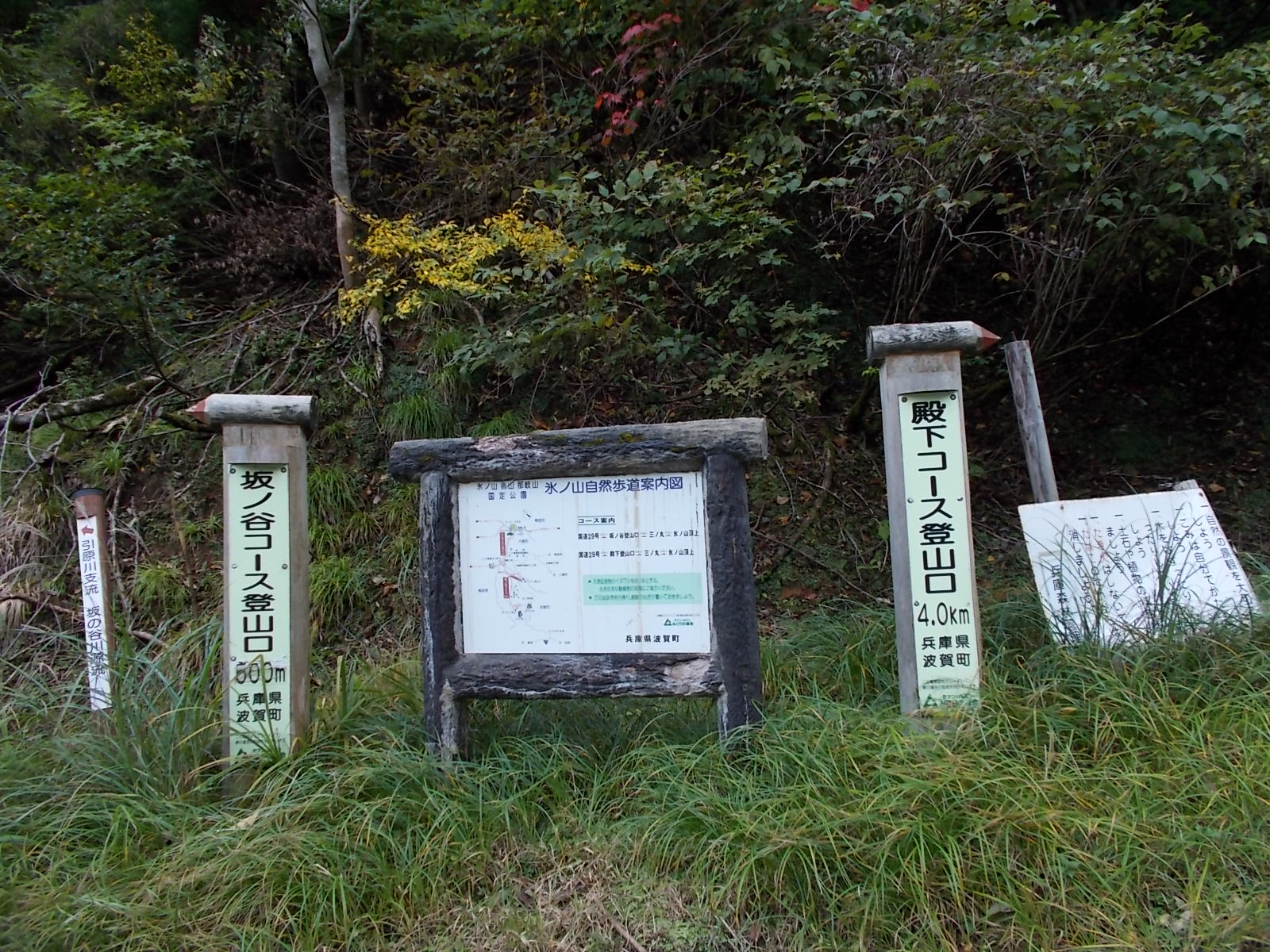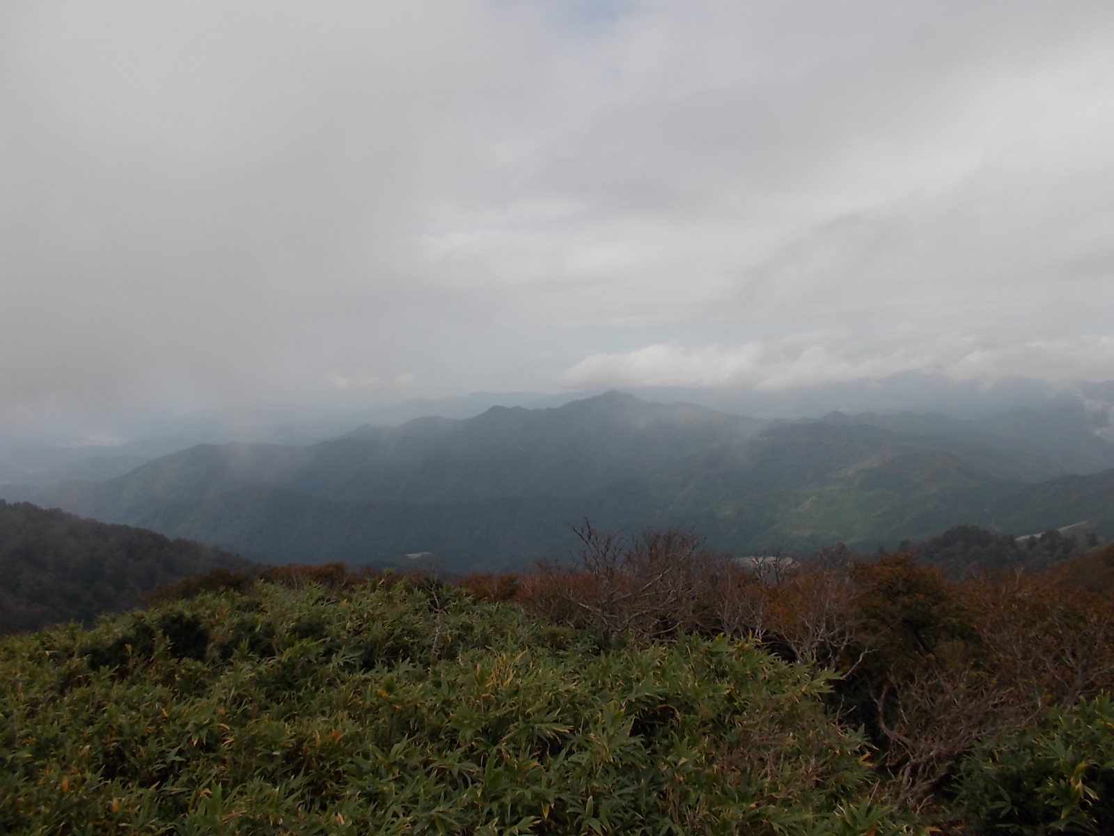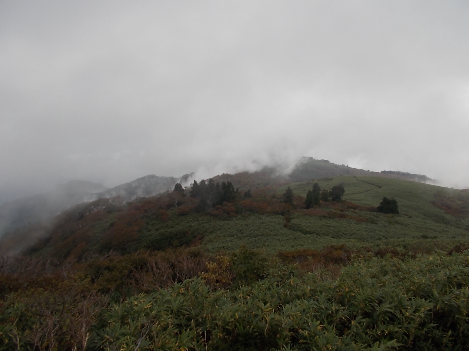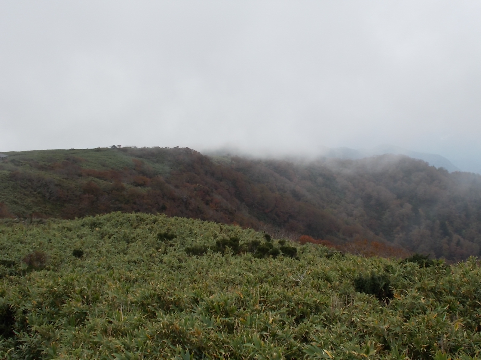 笹を抜けると三の丸に着きます。ここには展望台があって、360度見渡せるのですが、この日は雲が多くてサッパリでした。このあたりの紅葉は今が一番のようです。雨になりそうならここで止めようと思っていましたが、途中から雲が晴れて、氷ノ山の頂上が見えてきたので、行くことにしました。1,300mの空中 回廊を渡って、氷ノ山へ。こちらは宍粟市ではなくなっているので、登山道はそれほど整備されてはいません。それにところどころ土が掘り返されていたり、水はけが悪かったりでけっこう歩きにくいところが多いです。山頂に着くととっても寒くて、その上雲が動き出したので、昼食の予定を止めて三の丸に引き返しました。が、三の丸の雲に入ってしまったので、そのまま下山しました。昼食は歩きながらで、雨と競争でした。殿下コースへ下りて登山口まで下りると雨が ザーッと降ってきました。なんとか間に合ったようです。後は林道を歩いて、途中、逆水の滝によって帰ってきました。