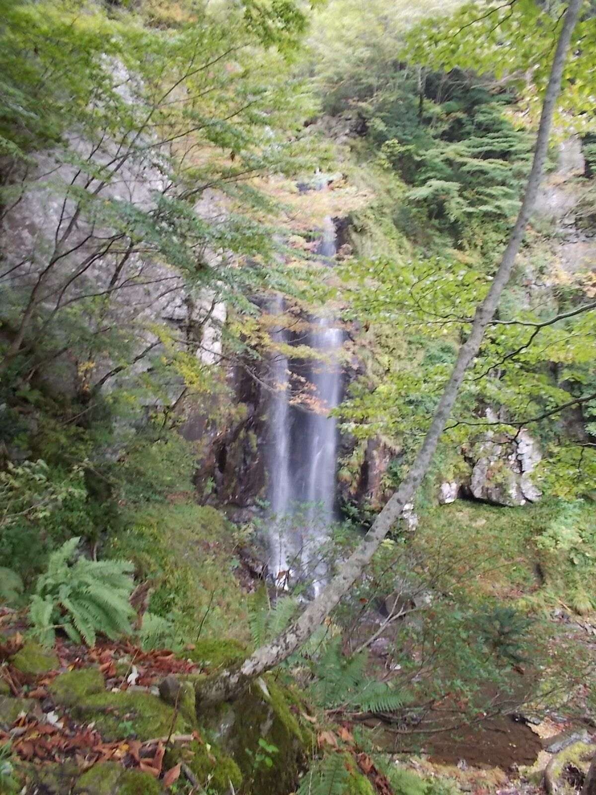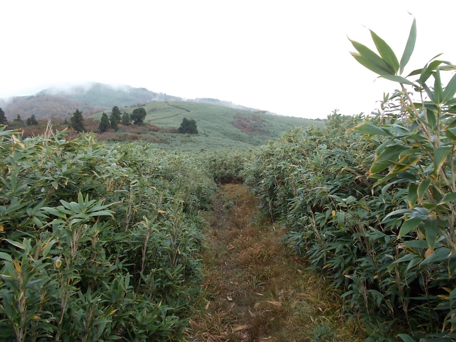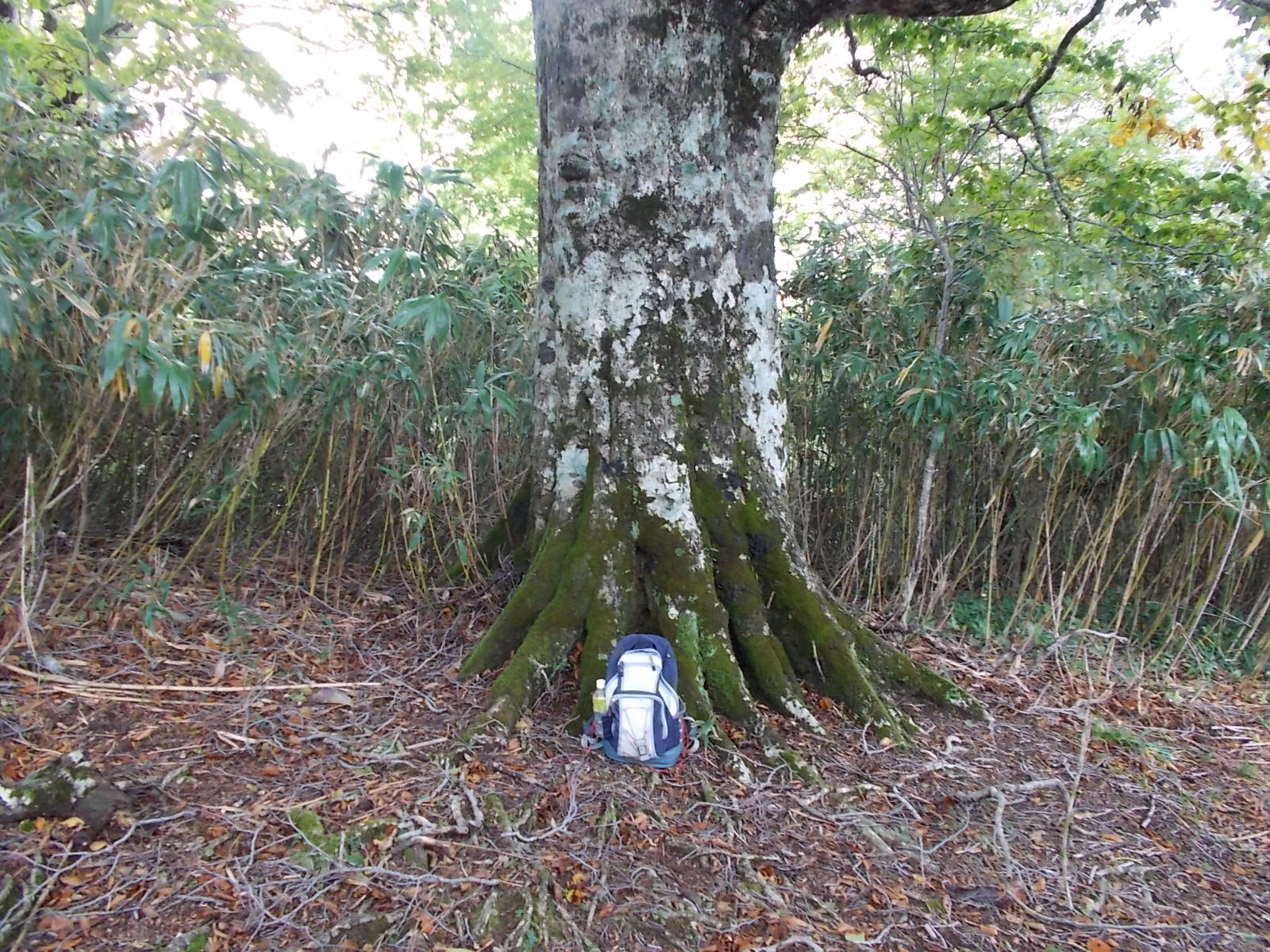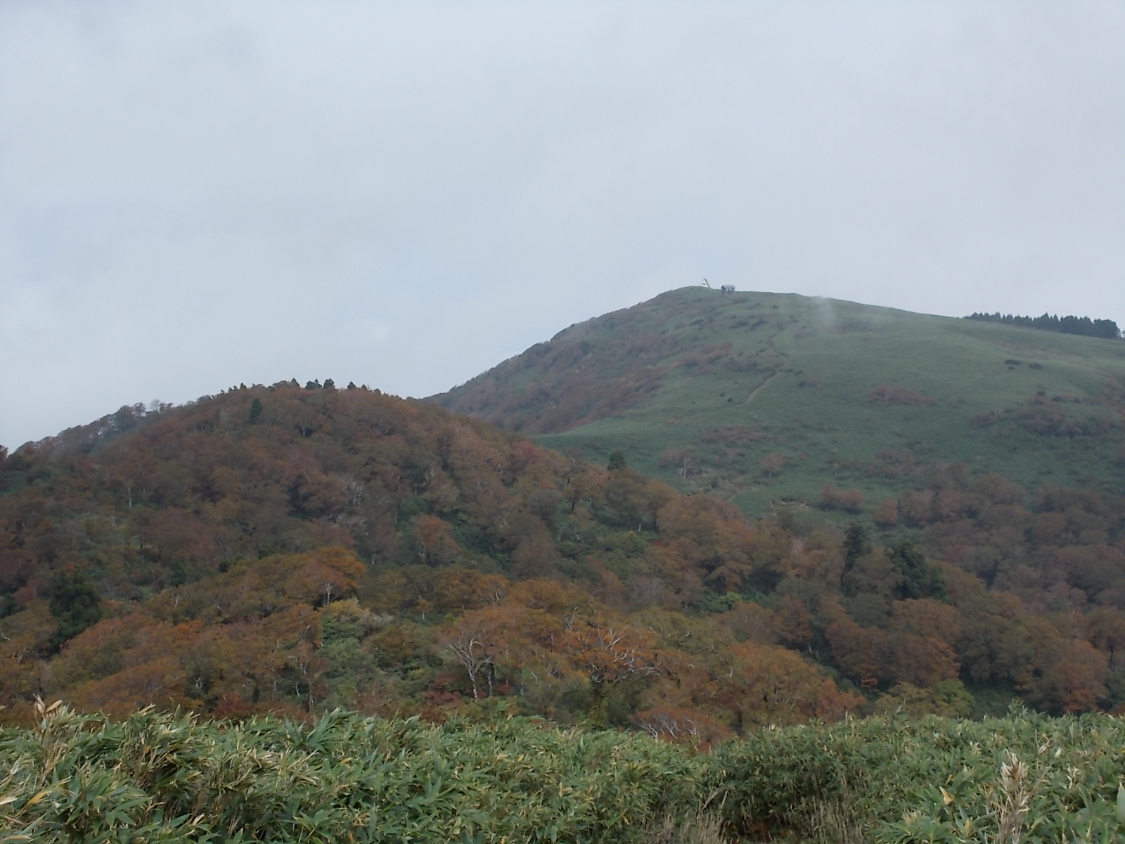 笹を抜けると三の丸に着きます。ここには展望台があって、360度見渡せるのですが、この日は雲が多くてサッパリでした。このあたりの紅葉は今が一番のようです。雨になりそうならここで止めようと思っていましたが、途中から雲が晴れて、氷ノ山の頂上が見えてきたので、行くことにしました。1,300mの空中 回廊を渡って、氷ノ山へ。こちらは宍粟市ではなくなっているので、登山道はそれほど整備されてはいません。それにところどころ土が掘り返されていたり、水はけが悪かったりでけっこう歩きにくいところが多いです。山頂に着くととっても寒くて、その上雲が動き出したので、昼食の予定を止めて三の丸に引き返しました。が、三の丸の雲に入ってしまったので、そのまま下山しました。昼食は歩きながらで、雨と競争でした。殿下コースへ下りて登山口まで下りると雨が ザーッと降ってきました。なんとか間に合ったようです。後は林道を歩いて、途中、逆水の滝によって帰ってきました。
