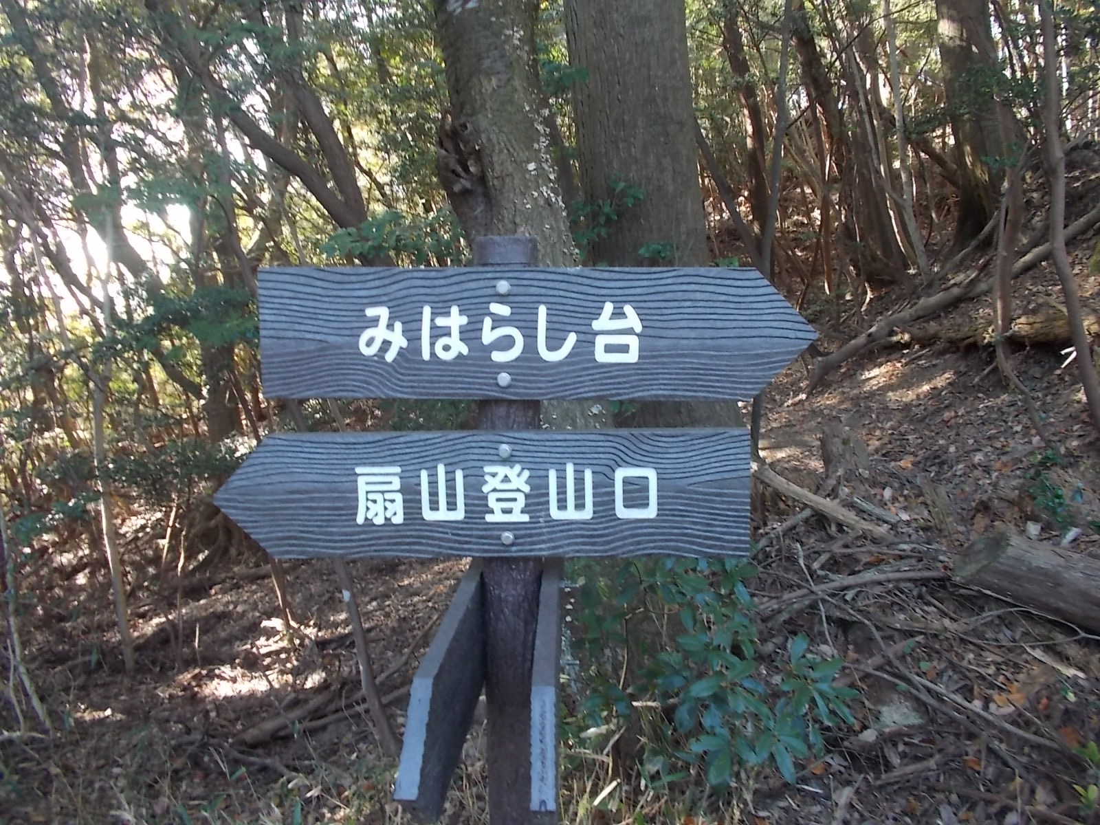 次の分岐で、左:扇山登山口、右:みはらし台となっています。さて、あなたならどちらに進まれますか?。