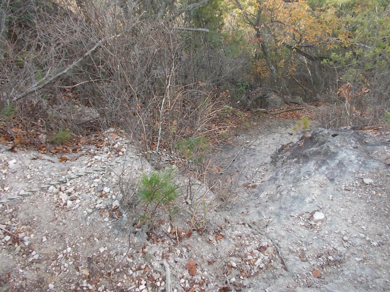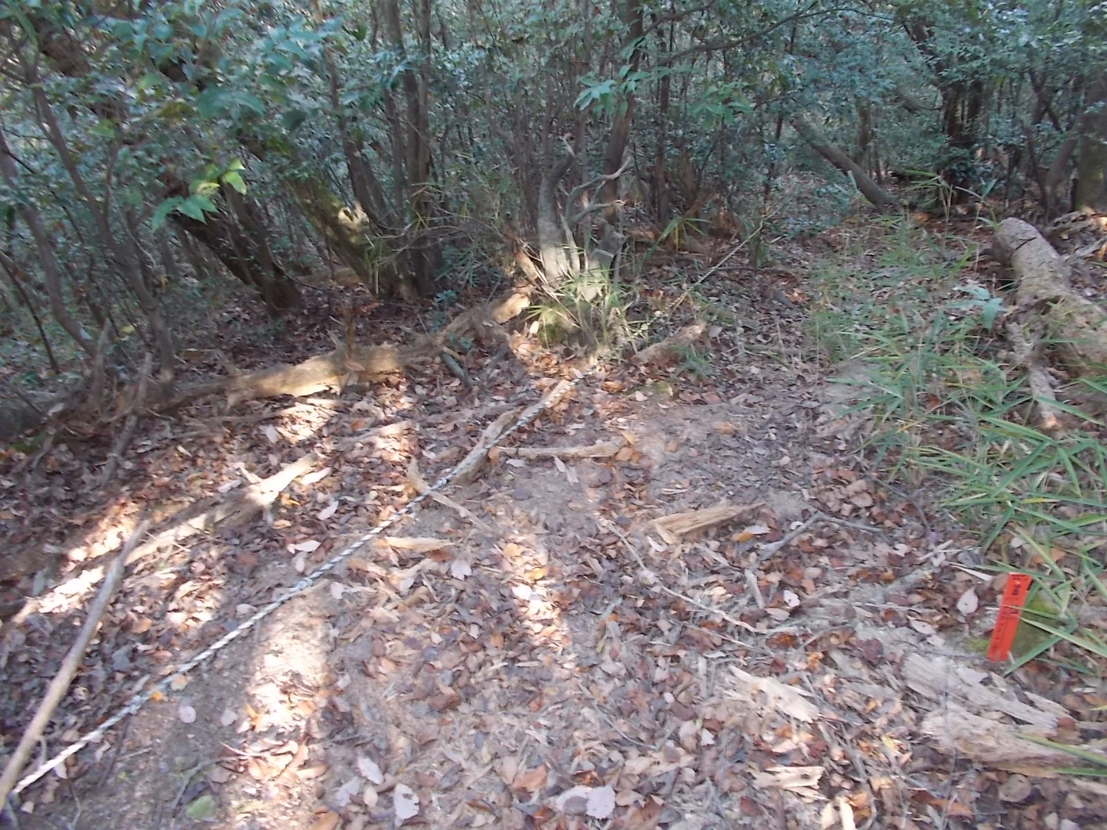 さて、どうしたものかと見渡すと左へ下りるルートがあるので、一端下りて登り返すのかと思いおりることに。しかし下りると沢に出てあとはルートがない。仕方がないので、向かいの斜面をよじ登りきると最初の登山道にでました。