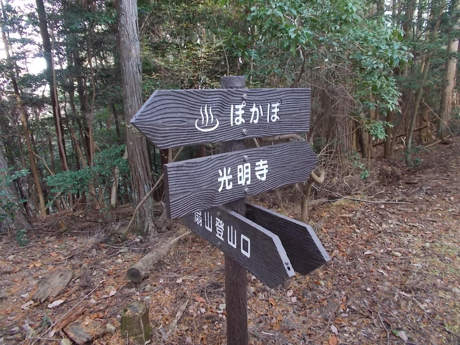 駐車場 → (参道) → 仁王門 → 本堂 → 光明寺合戦本陣跡 → 登山道 → 分岐 → 分岐 → 扇山山頂 → ぽかぽ分岐 → 八王子池分岐 → 角尾山山頂 → 八王子池分岐 → ぽかぽ分岐 → 光明寺分岐 → 光明寺 → 駐車場