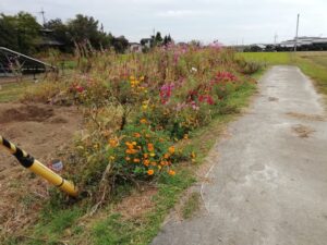 マリーゴールドとコスモス、大分大きくなってきましたねって、草とかなり競い合ってますが。